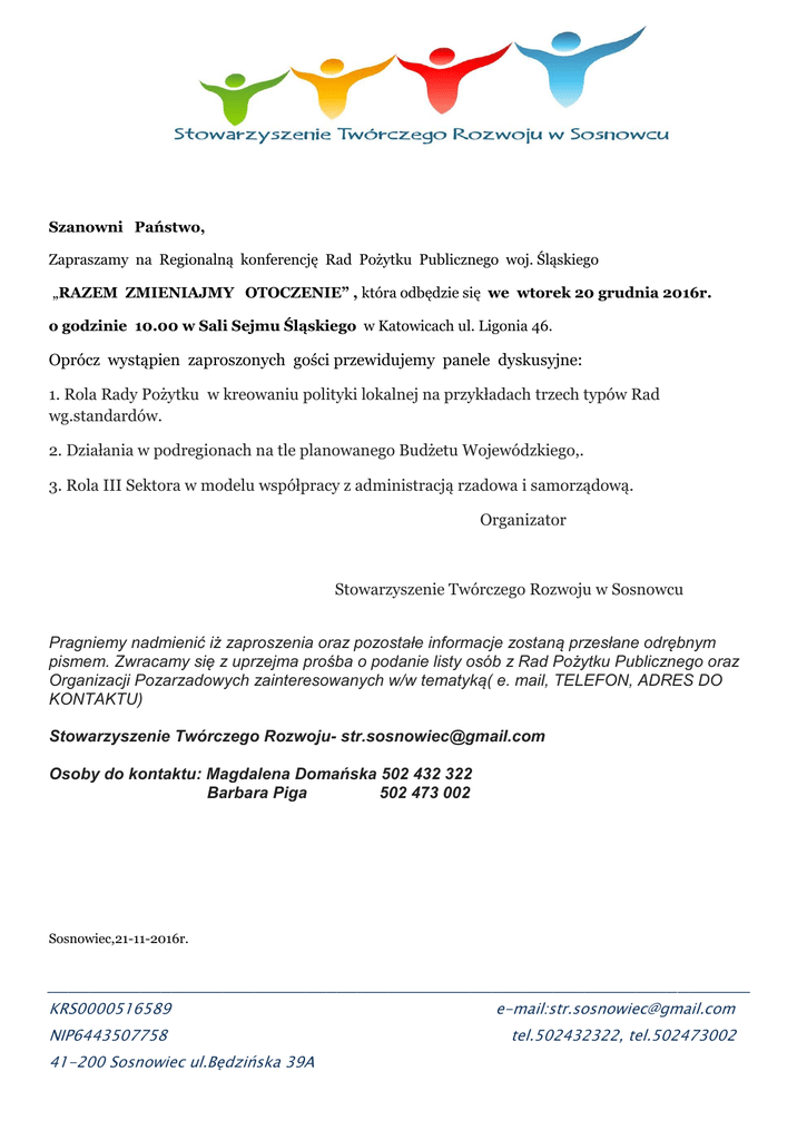 Szanowni Państwo, Zapraszamy na Regionalną konferencję Rad Pożytku Publicznego woj. Śląskiego „RAZEM ZMIENIAJMY OTOCZENIE” , która odbędzie się we wtorek 20 grudnia 2016r. o godzinie 10.00 w Sali Sejmu Śląskiego w Katowicach ul. Ligonia 46. Oprócz wystąpien zaproszonych gości przewidujemy panele dyskusyjne: 1. Rola Rady Pożytku w kreowaniu polityki lokalnej na przykładach trzech typów Rad wg.standardów. 2. Działania w podregionach na tle planowanego Budżetu Wojewódzkiego,. 3. Rola III Sektora w modelu współpracy z administracją rzadowa i samorządową. Organizator Stowarzyszenie Twórczego Rozwoju w Sosnowcu Pragniemy nadmienić iż zaproszenia oraz pozostałe informacje zostaną przesłane odrębnym pismem. Zwracamy się z uprzejma prośba o podanie listy osób z Rad Pożytku Publicznego oraz Organizacji Pozarzadowych zainteresowanych w/w tematyką( e. mail, TELEFON, ADRES DO KONTAKTU) Stowarzyszenie Twórczego Rozwoju- [email protected] Osoby do kontaktu: Magdalena Domańska 502 432 322 Barbara Piga 502 473 002 Sosnowiec,21-11-2016r. ____________________________________________________________________ KRS0000516589 e-mail:[email protected] NIP6443507758 41-200 Sosnowiec ul.Będzińska 39A tel.502432322, tel.502473002