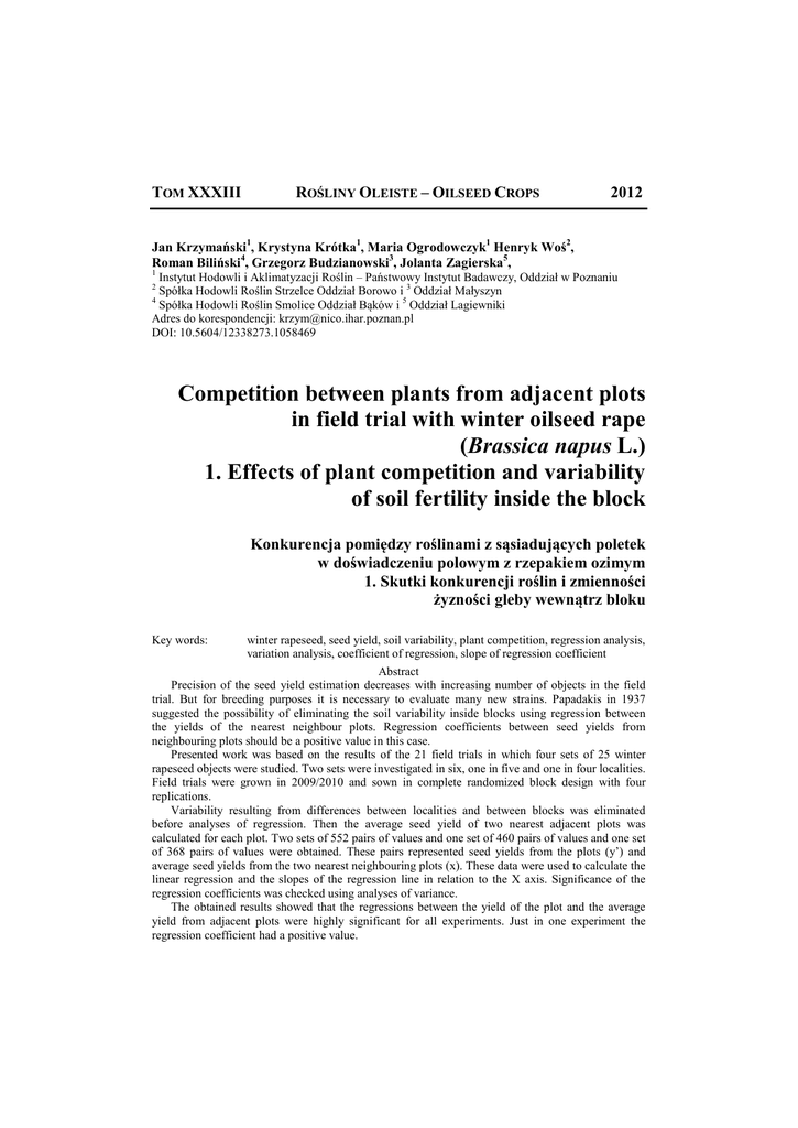 TOM XXXIII ROŚLINY OLEISTE – OILSEED CROPS 2012 Jan Krzymański1, Krystyna Krótka1, Maria Ogrodowczyk1 Henryk Woś2, Roman Biliński4, Grzegorz Budzianowski3, Jolanta Zagierska5, Instytut Hodowli i Aklimatyzacji Roślin – Państwowy Instytut Badawczy, Oddział w Poznaniu Spółka Hodowli Roślin Strzelce Oddział Borowo i 3 Oddział Małyszyn 4 Spółka Hodowli Roślin Smolice Oddział Bąków i 5 Oddział Lagiewniki Adres do korespondencji: [email protected] DOI: 10.5604/12338273.1058469 1 2 Competition between plants from adjacent plots in field trial with winter oilseed rape (Brassica napus L.) 1. Effects of plant competition and variability of soil fertility inside the block Konkurencja pomiędzy roślinami z sąsiadujących poletek w doświadczeniu polowym z rzepakiem ozimym 1. Skutki konkurencji roślin i zmienności żyzności gleby wewnątrz bloku Key words: winter rapeseed, seed yield, soil variability, plant competition, regression analysis, variation analysis, coefficient of regression, slope of regression coefficient Abstract Precision of the seed yield estimation decreases with increasing number of objects in the field trial. But for breeding purposes it is necessary to evaluate many new strains. Papadakis in 1937 suggested the possibility of eliminating the soil variability inside blocks using regression between the yields of the nearest neighbour plots. Regression coefficients between seed yields from neighbouring plots should be a positive value in this case. Presented work was based on the results of the 21 field trials in which four sets of 25 winter rapeseed objects were studied. Two sets were investigated in six, one in five and one in four localities. Field trials were grown in 2009/2010 and sown in complete randomized block design with four replications. Variability resulting from differences between localities and between blocks was eliminated before analyses of regression. Then the average seed yield of two nearest adjacent plots was calculated for each plot. Two sets of 552 pairs of values and one set of 460 pairs of values and one set of 368 pairs of values were obtained. These pairs represented seed yields from the plots (y’) and average seed yields from the two nearest neighbouring plots (x). These data were used to calculate the linear regression and the slopes of the regression line in relation to the X axis. Significance of the regression coefficients was checked using analyses of variance. The obtained results showed that the regressions between the yield of the plot and the average yield from adjacent plots were highly significant for all experiments. Just in one experiment the regression coefficient had a positive value. 28 Jan Krzymański… The obtained results showed that we were dealing with two phenomena: the variance of soil fertility inside a block and the competition between plants from the neighbouring plots. The regression is negative in the case of the superiority of the competition factor. The smallest influence of competition we have found in a situation where in the experiment were involved the least differentiated F1 hybrids from one breeding program, and the strongest effects of competition in the experiment in which were evaluated strains from three different breeding programs. The effects of competition of the winter rape affect mainly the yield of extreme row of plants (Krzymański 1985). To eliminate the effect of competition on the seed yield, it is necessary to harvest only middle rows of the plot and discard the edge rows. Słowa kluczowe: plon nasion, zmienność glebowa, konkurencja roślin, analiza regresji, analiza wariancji, współczynnik regresji, nachylenie współczynnika regresji Streszczenie Zwiększanie plonu nasion rzepaku jest najtrudniejszym zadaniem w pracach hodowlanych nad tym gatunkiem. Niezbędnym warunkiem skutecznej selekcji jest precyzyjne określenie plonu nasion w doświadczeniu polowym. Niestety, precyzja oceny plonu nasion maleje wraz ze zwiększaniem liczby obiektów w doświadczeniu. W pracy wykorzystano wyniki 21 doświadczeń polowych, w których badano cztery zestawy po 25 obiektów rzepaku ozimego. Dwa zestawy były badane w sześciu, jeden w pięciu oraz jeden w czterech miejscowościach. Doświadczenia zostały założone w czterech powtórzeniach w układzie bloków kompletnych zrandomizowanych i przeprowadzone w sezonie 2009/2010. Dla zwiększenia precyzji doświadczeń próbowano eliminować zmienność glebową wewnątrz bloków wykorzystując metodę zaproponowaną przez Papadakis’a w roku 1937, a stosowaną również w programie Agrobase II (2002). Przed obliczaniem regresji wyeliminowano zmienność wynikającą z różnic pomiędzy miejscowościami oraz pomiędzy blokami. Usuwania zmienności międzyblokowej i między miejscowościami dokonywano dla każdego poletka przez odjęcie średniej blokowej i dodanie średniej całkowitej według następującego wzoru): y’(ijl) = y(ijl) – y(.jl) + y(...) (1) gdzie: y(ijl) — plon nasion uzyskany z poletka, y’(ijl) — skorygowany plon nasion z poletka po usunięciu zmienności związanej z powtórzeniami i miejscowościami, y(.jl) — średnia blokowa, y(...) — średnia całkowita, i — pozycja obiektu w bloku, j — pozycja bloku w miejscowości, l — miejscowość, n — ilość obiektów w bloku (powtórzeniu). Następnie dla każdego poletka został obliczony średni plon nasion z dwu sąsiednich poletek. Pierwsze i ostatnie poletko w każdym powtórzeniu zostało pominięte w obliczeniach regresji, ponieważ brakowało dla nich plonu nasion z dwu sąsiadujących poletek. x(ijl) = (y’((i-1)jl) + y’((i+1)jl) ) / 2 (2) gdzie: x(ijl) — średni plon nasion dla dwu najbliższych sąsiednich poletek, y’(ijl) — plon z poletka po usunięciu zmienności blokowej i miejscowości. W ten sposób otrzymano dwa zestawy po 552 pary wartości oraz po jednym zestawie z 460 lub 368 parami wartości. Pary te reprezentowały plon na