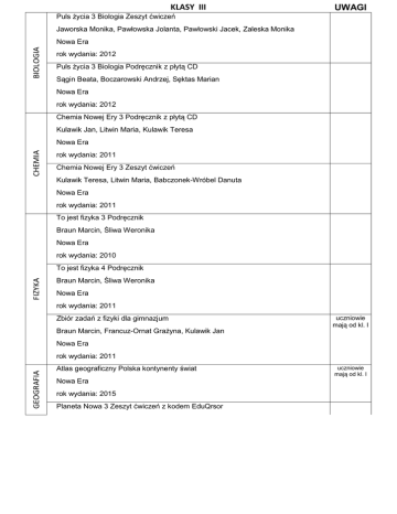 KLASY III UWAGI Puls życia 3 Biologia Zeszyt ćwiczeń Jaworska Monika, Pawłowska Jolanta, Pawłowski Jacek, Zaleska Monika BIOLOGIA Nowa Era rok wydania: 2012 Puls życia 3 Biologia Podręcznik z płytą CD Sągin Beata, Boczarowski Andrzej, Sęktas Marian Nowa Era rok wydania: 2012 Chemia Nowej Ery 3 Podręcznik z płytą CD Kulawik Jan, Litwin Maria, Kulawik Teresa CHEMIA Nowa Era rok wydania: 2011 Chemia Nowej Ery 3 Zeszyt ćwiczeń Kulawik Teresa, Litwin Maria, Babczonek-Wróbel Danuta Nowa Era rok wydania: 2011 To jest fizyka 3 Podręcznik Braun Marcin, Śliwa Weronika Nowa Era rok wydania: 2010 FIZYKA To jest fizyka 4 Podręcznik Braun Marcin, Śliwa Weronika Nowa Era rok wydania: 2011 Zbiór zadań z fizyki dla gimnazjum Braun Marcin, Francuz-Ornat Grażyna, Kulawik Jan uczniowie mają od kl. I Nowa Era GEOGRAFIA rok wydania: 2011 Atlas geograficzny Polska kontynenty świat Nowa Era rok wydania: 2015 Planeta Nowa 3 Zeszyt ćwiczeń z kodem EduQrsor uczniowie mają od kl. I Ćwiklińska Ewa, Wawrzkowicz Anna, Knopik Justyna Nowa Era rok wydania: 2014 Planeta Nowa 3 Podręcznik Szubert Mariusz Nowa Era rok wydania : 2014 HISTORIA Śladami przeszłości 3 Historia Podręcznik Roszak Stanisław, Łaszkiewicz Anna Nowa Era rok wydania: 2012 Bliżej słowa 3 Podręcznik WSiP rok wydania: 2010 JĘZ. POLSKI Bliżej słowa 3 zeszyt ćwiczeń Język polski Horwath Ewa WSiP rok wydania: 2010 Bliżej słowa 3 Język polski Podręcznik do kształcenia literackiego kulturowego i językowego Horwath Ewa, Kiełb Grażyna WSiP rok wydania: 2013 MATEMATYKA Matematyka Europejczyka 3 Ewa Madziąg, Małgorzata Muchowska Helion Matematyka Europejczyka. Zbiór zadań i ćwiczenia dwie części. Ewa Madziąg, Małgorzata Muchowska INFORMATY KA Helion Informatyka Podstawowe tematy Podręcznik Koba Grażyna Wydawnictwo Szkolne PWN rok wydania: 2009 EDB Żyję i działam bezpiecznie 1-3 Podręcznik z ćwiczeniami Słoma Jarosław, Zając Grzegorz Nowa Era rok wydania: 2015 WOS Dziś i jutro 2 Podręcznik z ćwiczeniami Wiedza o społeczeństwie Janicka Iwona, Janicki Arkadiusz, Kucia Aleksandra Nowa Era RELIGIA rok wydania: 2010 Jezus prowadzi i zbawia - katechizm (2014) Zbigniew Marek SJ, Anna Walulik WAM JĘZYKI OBCE Amis et compagnie 3 Podręcznik FRANCUSKI Samson Colette Cle International rok wydania: 2011 Amis et compagnie 3 Zeszyt ćwiczeń Samson Colette Cle International rok wydania: 2011 Kompass 4 neu Podręcznik do języka niemieckiego dla gimnazjum z płytą CD Reymont Elżbieta, Sibiga Agnieszka, Jezierska-Wiejak Małgorzata Wydawnictwo Szkolne PWN rok wydania: 2015 NIEMIECKI Kompass 4 neu Książka ćwiczeń do języka niemieckiego dla gimnazjum z płytą CD Reymont Elżbieta, Sibiga Agnieszka, Jezierska-Wiejak Małgorzata Wydawnictwo Szkolne PWN rok wydania: 2015 Kompass 3 neu Podręcznik do języka niemieckiego dla gimnazjum z płytą CD Reymont Elżbieta, Sibiga Agnieszka, Jezierska-Wiejak Małgorzata Wydawnictwo Szkolne PWN rok wydania: 2013 Kompass 3 neu Książka ćwiczeń do języka niemieckiego dla gimnazjum z płytą CD Reymont Elżbieta, Sibiga Agnieszka, Jezierska-Wiejak Małgorzata Wydawnictwo Szkolne PWN rok wydania: 2013 Voices 3 z płytą CD Macmillan 3 a gr.II 3 c gr.II rok wydania: 2012 ANGIELSKI Voices 4 z płytą CD Bilsborough Katherine, Bilsborough Steve Macmillan 3 a gr.I 3 b gr.I 3 c gr.I rok wydania: 2013 Laser B1+ Taylore-Knowles Steve Macmillan rok wydania: 3 d gr. I i II 3 e gr. I i II