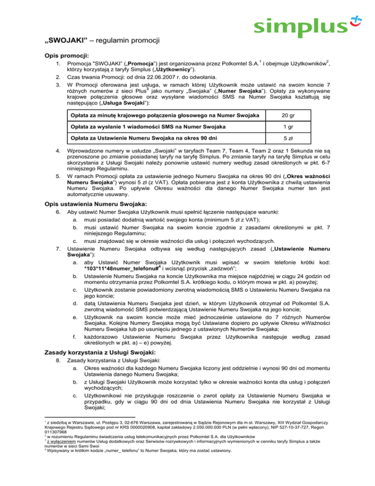 „SWOJAKI” – regulamin promocji Opis promocji: 1. 2. 3. 4. 5. Promocja "SWOJAKI” („Promocja”) jest organizowana przez Polkomtel S.A.1 i obejmuje Użytkowników2, którzy korzystają z taryfy Simplus („Użytkownicy”). Czas trwania Promocji: od dnia 22.06.2007 r. do odwołania. W Promocji oferowana jest usługa, w ramach której Użytkownik może ustawić na swoim koncie 7 3 różnych numerów z sieci Plus jako numery „Swojaka” („Numer Swojaka”). Opłaty za wykonywane krajowe połączenia głosowe oraz wysyłane wiadomości SMS na Numer Swojaka kształtują się następująco („Usługa Swojaki”): Opłata za minutę krajowego połączenia głosowego na Numer Swojaka 20 gr Opłata za wysłanie 1 wiadomości SMS na Numer Swojaka 1 gr Opłata za Ustawienie Numeru Swojaka na okres 90 dni 5 zł Wprowadzone numery w usłudze „Swojaki” w taryfach Team 7, Team 4, Team 2 oraz 1 Sekunda nie są przenoszone po zmianie posiadanej taryfy na taryfę Simplus. Po zmianie taryfy na taryfę Simplus w celu skorzystania z Usługi Swojaki należy ponownie ustawić numery według zasad określonych w pkt. 6-7 niniejszego Regulaminu. W ramach Promocji opłata za ustawienie jednego Numeru Swojaka na okres 90 dni („Okres ważności Numeru Swojaka”) wynosi 5 zł (z VAT). Opłata pobierana jest z konta Użytkownika z chwilą ustawienia Numeru Swojaka. Po upływie Okresu ważności dla danego Numer Swojaka numer ten jest automatycznie usuwany. Opis ustawienia Numeru Swojaka: 6. 7. Aby ustawić Numer Swojaka Użytkownik musi spełnić łączenie następujące warunki: a. musi posiadać dodatnią wartość swojego konta (minimum 5 zł z VAT); b. musi ustawić Numer Swojaka na swoim koncie zgodnie z zasadami określonymi w pkt. 7 niniejszego Regulaminu; c. musi znajdować się w okresie ważności dla usług i połączeń wychodzących. Ustawienie Numeru Swojaka odbywa się według następujących zasad („Ustawienie Numeru Swojaka”): a. aby Ustawić Numer Swojaka Użytkownik musi wpisać w swoim telefonie krótki kod: *103*11*48numer_telefonu#4 i wcisnąć przycisk „zadzwoń”; b. Ustawienie Numeru Swojaka na koncie Użytkownika ma miejsce najpóźniej w ciągu 24 godzin od momentu otrzymania przez Polkomtel S.A. krótkiego kodu, o którym mowa w pkt. a) powyżej; c. Użytkownik zostanie powiadomiony zwrotną wiadomością SMS o Ustawieniu Numeru Swojaka na jego koncie; d. datą Ustawienia Numeru Swojaka jest dzień, w którym Użytkownik otrzymał od Polkomtel S.A. zwrotną wiadomość SMS potwierdzającą Ustawienie Numeru Swojaka na jego koncie; e. Użytkownik na swoim koncie może mieć jednocześnie ustawione do 7 różnych Numerów Swojaka. Kolejne Numery Swojaka mogą być Ustawiane dopiero po upływie Okresu wWażności Numeru Swojaka lub po usunięciu jednego z ustawionych Numerów Swojaka; f. każdorazowo Ustawienie Numeru Swojaka przez Użytkownika następuje według zasad określonych w pkt. a) – e) powyżej. Zasady korzystania z Usługi Swojaki: 8. 1 Zasady korzystania z Usługi Swojaki: a. Okres ważności dla każdego Numeru Swojaka liczony jest oddzielnie i wynosi 90 dni od momentu Ustawienia danego Numeru Swojaka; b. z Usługi Swojaki Użytkownik może korzystać tylko w okresie ważności konta dla usług i połączeń wychodzących; c. Użytkownikowi nie przysługuje roszczenie o zwrot opłaty za Ustawienie Numeru Swojaka w przypadku, gdy w ciągu 90 dni od dnia Ustawienia Numeru Swojaka nie korzystał z Usługi Swojaki; z siedzibą w Warszawie, ul. Postępu 3, 02-676 Warszawa, zarejestrowaną w Sądzie Rejonowym dla m.st. Warszawy, XIII Wydział Gospodarczy Krajowego Rejestru Sądowego pod nr KRS 0000020908, kapitał zakładowy 2.050.000.000 PLN (w pełni wpłacony), NIP 527-10-37-727, Regon 011307968 2 w rozumieniu Regulaminu świadczenia usług telekomunikacyjnych przez Polkomtel S.A. dla Użytkowników 3 z wyłączeniem numerów Usług dodatkowych oraz Serwisów rozrywkowych i informacyjnych wymienionych w cenniku taryfy Simplus a także numerów w sieci Sami Swoi 4 Wpisywany w krótkim kodzie „numer_ telefonu” to Numer Swojaka, który ma zostać ustawiony. d. Użytkownik ma możliwość sprawdzenia za pomocą krótkiego kodu: *103# listę oraz Okres ważności aktywnych Numerów Swojaków; e. Użytkownik może w dowolnym momencie usunąć Numer Swojaka. W tym celu musi wpisać w 5 swoim telefonie krótki kod: *103*00*48numer_telefonu# i wcisnąć przycisk „zadzwoń”. Usunięcie Numeru Swojaka powoduje zakończenie Okresu ważności dla tego numeru; f. połączenia głosowe oraz wiadomości SMS w ramach Usługi Swojaki nie mogą być wykonywane w roamingu; g. po upływie Okresu ważności Numeru Swojaka, opłaty za wykonywane przez Użytkownika połączenia i wysyłane wiadomości SMS na ten numer naliczane są zgodnie z Cennikiem taryfy Simplus; h. w przypadku, gdy w trakcie trwania połączenia głosowego na Numer Swojaka upłynie Okres ważności dla tego Numeru Swojaka to opłaty za pozostałą część połączenia zostaną naliczone zgodnie z Cennikiem taryfy Simplus, 9. W przypadku, gdy Użytkownik korzysta jednocześnie z Usługi Swojaki oraz z innych usług i promocji dostępnych w taryfie Simplus stosuje się następujące zasady rozliczeń: a. połączenia głosowe wykonywane na Numer Swojaka przez Użytkownika, który posiada aktywny Pakiet MAXI Minuty powodują w pierwszej kolejności zmniejszenie limitu minut dostępnych w Pakiecie MAXI Minuty; b. połączenia głosowe wykonywane na Numer Swojaka przez Użytkownika, który posiada aktywny Pakiet MINI MINUTY powodują w pierwszej kolejności zmniejszenie limitu minut dostępnych w Pakiecie MINI MINUTY; c. wiadomości SMS wysyłane na Numer Swojaka przez Użytkownika, który posiada aktywny pakiet MINI SMS powodują w pierwszej kolejności zmniejszanie się limitu wiadomości SMS dostępnych w Pakiecie MINI SMS; 10. Ustawienie Numeru Swojaka zgodnie z pkt. 7 oznacza, że Użytkownik za