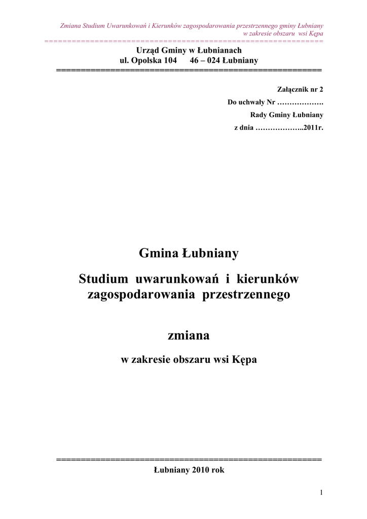 Zmiana Studium Uwarunkowań i Kierunków zagospodarowania przestrzennego gminy Łubniany w zakresie obszaru wsi Kępa ============================================================= Urząd Gminy w Łubnianach ul. Opolska 104 46 – 024 Łubniany ====================================================== Załącznik nr 2 Do uchwały Nr ………………. Rady Gminy Łubniany z dnia ………………..2011r. Gmina Łubniany Studium uwarunkowań i kierunków zagospodarowania przestrzennego zmiana w zakresie obszaru wsi Kępa ====================================================== Łubniany 2010 rok 1 Zmiana Studium Uwarunkowań i Kierunków zagospodarowania przestrzennego gminy Łubniany w zakresie obszaru wsi Kępa ============================================================= Niniejszy tekst obejmuje wyodrębnione ustalenia jakie zostały wprowadzone dla obszaru wsi Kępa wraz z informacją w jakich rozdziałach i punktach zostały wprowadzone w zasadniczej treści studium Gminy Łubniany przyjętego uchwałą nr XI/54/99 Rady Gminy Łubniany i zmianą przyjętą uchwałą Nr XXVII/164/06 z dnia 24 kwietnia 2006 roku. Wprowadzone zmiany w treści studium zostały wyróŜnione czcionką koloru granatowego. I Informacje wprowadzające do zmiany w studium w zakresie wsi Kępa 1. Przedmiot opracowania Przedmiotem opracowania jest zmiana Studium uwarunkowań i kierunków zagospodarowania przestrzennego gminy Łubniany zatwierdzonego uchwałą NRXI/54/99 Rady Gminy Łubniany z dnia 9 grudnia 1999 roku w części obejmującej obszar wsi Kępa w granicach administracyjnych. Studium uwarunkowań i kierunków zagospodarowania przestrzennego gminy Łubniany sporządzone zostało pod rządami nieobowiązującej juŜ ustawy o zagospodarowaniu przestrzennym z dnia 7 lipca 1994 roku. 2. Podstawa opracowania. Po przeprowadzeniu oceny aktualności Studium uwarunkowań i kierunków zagospodarowania przestrzennego gminy Łubniany uchwalonego w 1999 roku w świetle istniejących uwarunkowań przestrzennych i prawnych, Wójt Gminy Łubniany stwierdził potrzebę zmiany studium w zakresie dotyczącym obszaru wsi Kępa i wystąpił z wnioskiem do Rady Gminy o dokonanie zmiany w tej części. Rada Gminy w Łubnianach podjęła uchwałę Nr XXIV/124/09 w dniu 20 kwietnia 2009 roku o przystąpieniu do sporządzenia zmiany w Studium uwarunkowań i kierunków zagospodarowania przestrzennego gminy Łubniany obejmującej obszar wsi Kępa w granicach administracyjnych. 3. Cel opracowania Podjęta uchwała dotycząca zmiany studium w części obejmującej obszar wsi Kępa ma na celu przede wszystkim doprowadzenie do zgodności między dokumentami a mianowicie miejscowego planu zagospodarowania przestrzennego wsi Kępa z kierunkami rozwoju przestrzennego określonymi dla wsi w studium. Wieś Kępa objęta była miejscowym planem zagospodarowania przestrzennego gminy Łubniany sporządzonym w oparciu o przepisy nieobowiązującej ustawy o zagospodarowaniu przestrzennym z dnia 7 lipca 1994 roku, w którym dokonano szeregu zmian w oparciu o przepisy obowiązującej ustawy z 27 marca 2003 roku (Dz. Ustaw z 2003r. Nr 80, poz. 717 z późn. zmianami), w wyniku czego na obszarze wsi Kępa funkcjonowało 6 miejscowych planów zagospodarowania, których ustalenia nie były 2 Zmiana Studium Uwarunkowań i Kierunków zagospodarowania przestrzennego gminy Łubniany w zakresie obszaru wsi Kępa ============================================================= w zgodzie ze studium. Niezgodność ta nie była w sprzeczności z rozwojem przestrzennym wsi, a w trakcie sporządzania zmian w planie wymóg zgodności nie był wymagany. Zapisy art. 20 ust. 1 ustawy z 27 marca 2003 roku o planowaniu i zagospodarowaniu przestrzennym zobowiązują radę gminy do uchwalenia planu miejscowego, po stwierdzeniu jego zgodności z ustaleniami studium. Dla uporządkowania i przyjęcia określonego kierunku w zakresie zabudowy i zagospodarowania terenów Rada Gminy w Łubnianach podjęła uchwałę o sporządzeniu miejscowego planu zagospodarowania przestrzennego wsi Kępa w granicach administracyjnych uwzględniającego ustalenia dotychczas sporządzonych zmian w planie a takŜe uwzględnienia złoŜonych wniosków i usunięcie z treści studium przedsięwzięć nieaktualnych. W celu doprowadzenia do zgodności ww. dokumentów z kierunkami rozwoju przestrzennego gminy Łubniany dla obszaru wsi Kępa, niezbędnym jest sporządzenie zmiany studium w tej części. Jednocześnie dokonana zmiana w studium odnośnie wsi Kępa uwzględnia: = wnioski o zmianę przeznaczenia i zagospodarowania terenów złoŜone przez zainteresowanych, których zamierzenia nie były uwzględnione w studium, = wymogi wynikające z przepisów art. 10 ust. 1 i 2 ustawy o planowaniu i zagospodarowaniu przestrzennym oraz rozporządzenia Ministra Infrastruktury z dnia 28 kwietnia 2004r. w sprawie zakresu projektu studium uwarunkowań i kierunków zagospodarowania przestrzennego gminy; = nieuwzględnione zadania realizujące ponadlokalne cele publiczne, ujęte w aktualnie obowiązującym planie zagospodarowania przestrzennego województwa opolskiego; = dostosowanie zapisów Studium do nowych regulacji prawnych, przy czym te zapisy odnoszą się do obszaru wsi Kępa. W świetle powyŜszego aktualizacja w ww. zakresie wymaga: = zmian w części tekstowej polegających na uzupełnieniu ustaleń odnoszących się do wsi Kępa zgodnie z nowymi uwarunkowaniami i przyjętymi kierunkami jej rozwoju, = sporządzenia rysunku zmiany w studium określającego kierunki zagospodarowania przestrzennego dla obszaru wsi Kępa w granicach administracyjnych. Ww. informacje wprowadza się w zasadniczym tekście studium Dz. I. Informacje wstępne jako pkt. 8 II. Uwarunkowania rozwoju wsi 1. PołoŜenie Wieś Kępa połoŜona jest w południowej części gminy Łubniany i graniczy: - od północy z wsią Luboszyce, - od wschodu z wsią Zawada gm. Turawa, - od południa z miastem Opolem, - od południowego – zacho
