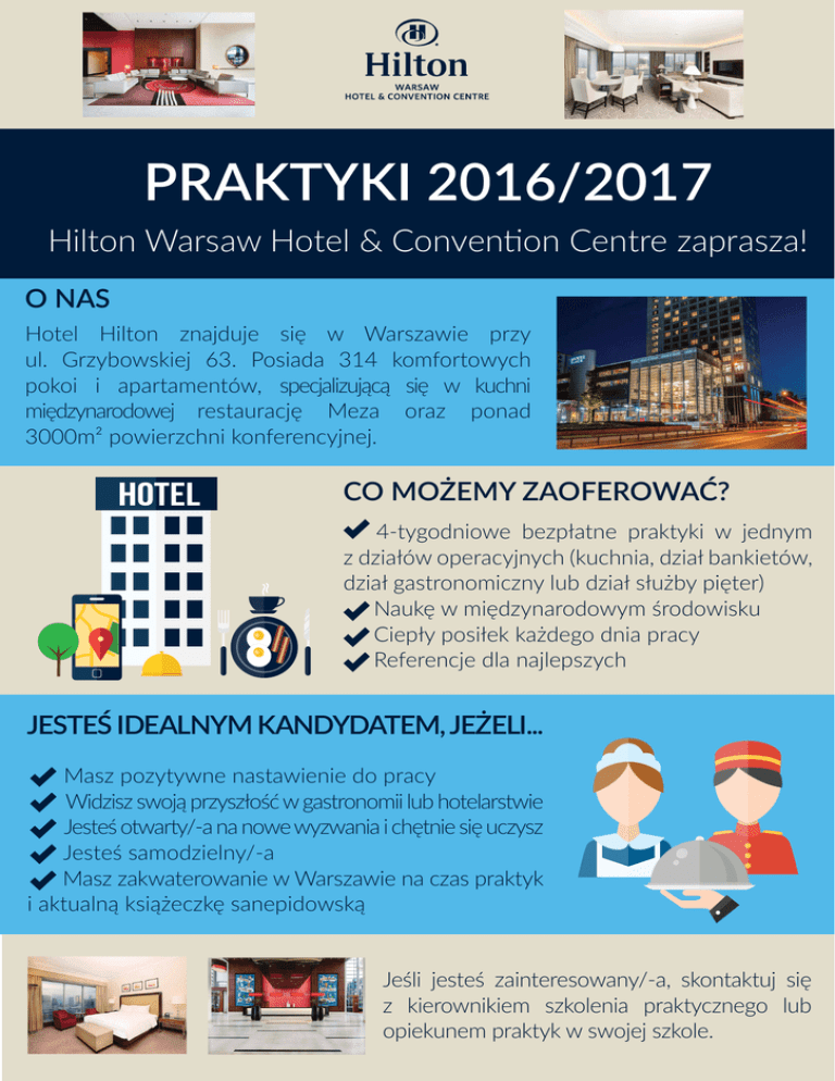 PRAKTYKI 2016/2017 Hilton Warsaw Hotel & Convention Centre zaprasza! O NAS Hotel Hilton znajduje się w Warszawie przy ul. Grzybowskiej 63. Posiada 314 komfortowych pokoi i apartamentów, specjalizującą się w kuchni międzynarodowej restaurację Meza oraz ponad 3000m² powierzchni konferencyjnej. CO MOŻEMY ZAOFEROWAĆ? 4-tygodniowe bezpłatne praktyki w jednym z działów operacyjnych (kuchnia, dział bankietów, dział gastronomiczny lub dział służby pięter) Naukę w międzynarodowym środowisku Ciepły posiłek każdego dnia pracy Referencje dla najlepszych JESTEŚ IDEALNYM KANDYDATEM, JEŻELI... Masz pozytywne nastawienie do pracy Widzisz swoją przyszłość w gastronomii lub hotelarstwie Jesteś otwarty/-a na nowe wyzwania i chętnie się uczysz Jesteś samodzielny/-a Masz zakwaterowanie w Warszawie na czas praktyk i aktualną książeczkę sanepidowską Jeśli jesteś zainteresowany/-a, skontaktuj się z kierownikiem szkolenia praktycznego lub opiekunem praktyk w swojej szkole.