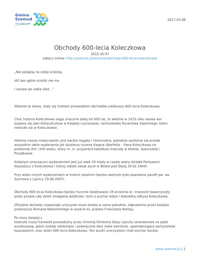 2017.03.08 Obchody 600-lecia Koleczkowa 2015.10.07 zobacz online: http://szemud.pl/artykuly/obchody-600-lecia-koleczkowa/ „Nie podążaj na oślep ścieżką. Idź tam gdzie ścieżki nie ma I zostaw po sobie ślad…” Właśnie te słowa, stały się mottem przewodnim obchodów jubileuszu 600 lecia Koleczkowa. Choć historia Koleczkowa sięga znacznie dalej niż 600 lat, to właśnie w 1415 roku nazwa wsi pojawia się jako Kollacztczkow w Księdze czynszowej- rachunkowej Rycerstwa Zakonnego, które mieściło się w Koleczkowie. Historia naszej miejscowości jest bardzo bogata i różnorodna, jednakże wyróżnia się przede wszystkim takie wydarzenia jak działania rycerza Kaspra Uberfelta – Pana Koleczkowa na przełomie XVI i XVII wieku, który m. in. przywrócił katolikom kościoły w Kielnie, Szemudzie i Przodkowie. Kolejnym znaczącym wydarzeniem jest już wiek XX kiedy w czasie wojny działali Partyzanci Kaszubscy z Koleczkowa i którzy oddali swoje życie w Bitwie pod Śleżą 29.02.1944r. Przy wielu innych wydarzeniach w historii ostatnim bardzo ważnym było powstanie parafii pw. św. Szymona z Lipnicy 19.08.2007r. Obchody 600 lecia Koleczkowa bardzo hucznie świętowano 19 września br. Imprezie towarzyszyły przez prawie cały dzień zmagania jeźdźców i koni o puchar wójta i statuetkę sołtysa Koleczkowa. Oficjalne obchody rozpoczęła uroczysta msza święta w samo południe, odprawiona przez księdza proboszcza Romana Nalezińskiego w asyście ks. prałata Franciszka Rompy. Po mszy świętej z kościoła ruszył korowód prowadzony przez Gminną Orkiestrę Dętą i poczty sztandarowe na pętle autobusową, gdzie zostały odsłonięte i poświęcone dwa nowe kamienie, upamiętniające partyzantów kaszubskich, oraz dzień 600 lecia Koleczkowa. Ten punkt uroczystości miał wymiar bardzo www.szemud.pl | 1 2017.03.08 patriotyczny. Następnie ruszył I Kaszubski Orszak Konny na trasie Koleczkowo-KielnoKoleczkowo. Wzięło w nim udział bardzo wiele powozów i bryczek konnych na których zasiedli znamienici goście, orkiestra, zespół Koleczkowianie i chętni uczestnicy imprezy. Nie zabrakło również ponad stuletniego wozu strażackiego z ręczna pompą strażacką. Po przybyciu Orszaku na stadion KKS w Koleczkowie rozpoczęto kolejną część uroczystości, które prowadzili p. Aleksandra Perz i p. Arkadiusz Daniluk. Gości powitano piosenką o Koleczkowie, wykonaną przez dzieci ze scholi parafialnej. Gorące słowa powitania skierowali do zebranych Wójt Gminy p. Ryszard Kalkowski i Sołtys Koleczkowa p. Jan Barkowski. Gościem obchodów, który reprezentował władze naszego Powiatu, był wicestarosta Pan Witold Reclaf Podczas części oficjalnej na scenie wręczono 26 uhonorowań ,,Zasłużeni dla Koleczkowa”. Podczas uroczystości zaprezentowane zostały dwie wystawy czasowe Instytutu Pamięci Narodowej: „Wejherowo w okresie niemieckiej okupacji 1939-1945” oraz „Tajna Organizacja Wojskowa Gryf Pomorski”. Był to przepiękny patriotycany akcent. Impreza była bardzo bogata w różnego rodzaju atrakcje. Odbyły się występy artystyczne zespołów Koleczkowianie, Kris oraz Kaszubskiego Kabaretu z Pucka, pokazy strażaków z ręczną pompą wodną, pokazy tresury psów i karate oraz miejsce miały niezwykłe potyczki rycerskie. Na dzieci czekały liczne darmowe atrakcje, takie jak dmuchane zamki, fotobudka pokaz garncarstwa. Znalazły się również przejażdżki konne i bungee. Wśród wielu wystaw znalazła się obszerna wystawa IPN-u. Prawdziwe tłumy na płycie boiska zebrały się kiedy o godz.19.00 wystąpił zespół wieczoru SPIKE, a następnie o 20.30 po raz pierwszy w Koleczkowie i Gminie odbył się nie codzienny i bardzo wyjątkowy pokaz laserowy. Uczestnicy jubileuszu świętowali urodziny Koleczkowa do późnych godzin nocnych przy muzyce zespołu ,,Blue Heaven” oraz wspólnym ognisku. Prezentem urodzinowym dla Koleczkowa było pozyskiwanie środków oraz przeznaczenie dochodów z imprezy na rzecz budowy nowoczesnego i wielofunkcyjnego boiska sportowego przy Zespole Szkolno- www.szemud.pl | 2 2017.03.08 Przedszkolnym w Koleczkowie. Wrażenia bardzo pozytywne, dobra zabawa mieszkańców Koleczkowa, gminy i nie tylko świadczą o udanej imprezie, co bardzo cieszy wszystkich organizatorów. Komitet organizacyjny jubileuszu pragnie podziękować wszystkim sponsorom tego wydarzenia, wszystkim osobom, wolontariuszom, którzy czynnie zaangażowali się w pomoc i przeprowadzenie całej imprezy, przygotowaniu estetyki Koleczkowa i wystroju miejscowości. Rada Sołecka i Sołtys Koleczkowa wraz ze Społecznym Komitetem Budowy wyraża wdzięczność Wójtowi Gminy p. Ryszardowi Kalkowskiemu i pracownikom gminy za współorganizowanie i pomoc w przygotowaniu i przebiegu całego jubileuszu. 600 lat za nami, a teraz cóż innego pozostaje jak tylko czekać kolejnych równie wzniosłych jubileuszy naszej pięknej i prężnie rozwijającej się miejscowości Koleczkowo! Arkadiusz Daniluk [size=16]Zapraszamy serdecznie do oglądania [url=http://www.szemud.pl/galeriazdjec/73.html]galerii zdjęć z obchodów 600 lecia Koleczkowa[/url][/size] www.szemud.pl | 3