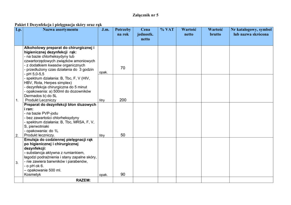 Załącznik nr 5 Pakiet I Dezynfekcja i pielęgnacja skóry oraz rąk Lp
