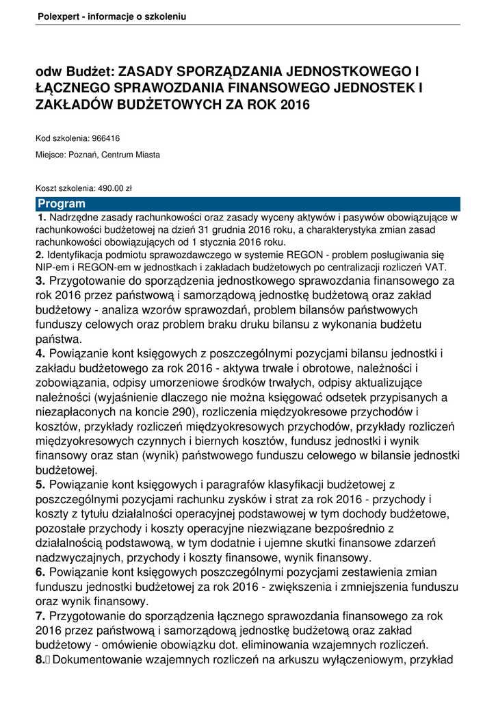 Polexpert - informacje o szkoleniu odw Budżet: ZASADY SPORZĄDZANIA JEDNOSTKOWEGO I ŁĄCZNEGO SPRAWOZDANIA FINANSOWEGO JEDNOSTEK I ZAKŁADÓW BUDŻETOWYCH ZA ROK 2016 Kod szkolenia: 966416 Miejsce: Poznań, Centrum Miasta Koszt szkolenia: 490.00 zł Program 1. Nadrzędne zasady rachunkowości oraz zasady wyceny aktywów i pasywów obowiązujące w rachunkowości budżetowej na dzień 31 grudnia 2016 roku, a charakterystyka zmian zasad rachunkowości obowiązujących od 1 stycznia 2016 roku. 2. Identyfikacja podmiotu sprawozdawczego w systemie REGON - problem posługiwania się NIP-em i REGON-em w jednostkach i zakładach budżetowych po centralizacji rozliczeń VAT. 3. Przygotowanie do sporządzenia jednostkowego sprawozdania finansowego za rok 2016 przez państwową i samorządową jednostkę budżetową oraz zakład budżetowy - analiza wzorów sprawozdań, problem bilansów państwowych funduszy celowych oraz problem braku druku bilansu z wykonania budżetu państwa. 4. Powiązanie kont księgowych z poszczególnymi pozycjami bilansu jednostki i zakładu budżetowego za rok 2016 - aktywa trwałe i obrotowe, należności i zobowiązania, odpisy umorzeniowe środków trwałych, odpisy aktualizujące należności (wyjaśnienie dlaczego nie można księgować odsetek przypisanych a niezapłaconych na koncie 290), rozliczenia międzyokresowe przychodów i kosztów, przykłady rozliczeń międzyokresowych przychodów, przykłady rozliczeń międzyokresowych czynnych i biernych kosztów, fundusz jednostki i wynik finansowy oraz stan (wynik) państwowego funduszu celowego w bilansie jednostki budżetowej. 5. Powiązanie kont księgowych i paragrafów klasyfikacji budżetowej z poszczególnymi pozycjami rachunku zysków i strat za rok 2016 - przychody i koszty z tytułu działalności operacyjnej podstawowej w tym dochody budżetowe, pozostałe przychody i koszty operacyjne niezwiązane bezpośrednio z działalnością podstawową, w tym dodatnie i ujemne skutki finansowe zdarzeń nadzwyczajnych, przychody i koszty finansowe, wynik finansowy. 6. Powiązanie kont księgowych poszczególnymi pozycjami zestawienia zmian funduszu jednostki budżetowej za rok 2016 - zwiększenia i zmniejszenia funduszu oraz wynik finansowy. 7. Przygotowanie do sporządzenia łącznego sprawozdania finansowego za rok 2016 przez państwową i samorządową jednostkę budżetową oraz zakład budżetowy - omówienie obowiązku dot. eliminowania wzajemnych rozliczeń. 8. Dokumentowanie wzajemnych rozliczeń na arkuszu wyłączeniowym, przykład Polexpert - informacje o szkoleniu arkusza wyłączeniowego oraz jego powiązanie z kontem 976 - korekty obrotów i sald w zakresie łącznego sprawozdania finansowego za rok 2016. 9. Bilans otwarcia 2017 - zasady dostosowania polityki rachunkowości jednostki budżetowej do nowych obowiązujących od 1 stycznia zmienionych zasad rachunkowości budżetowej. 10. Odpowiedzi na pytania. Prowadzący