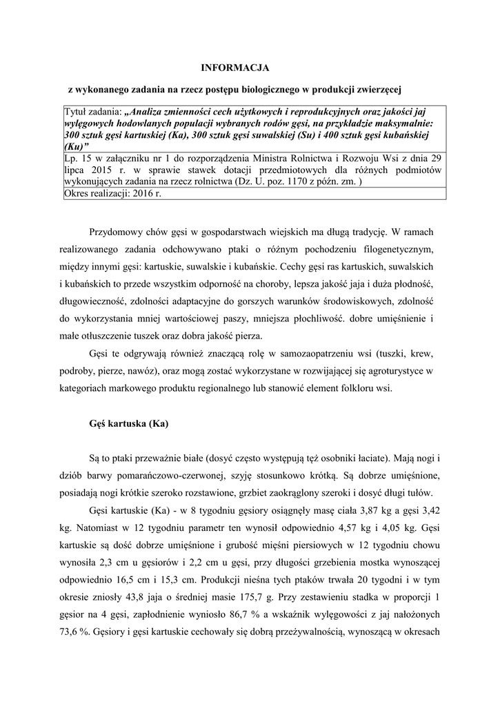 INFORMACJA z wykonanego zadania na rzecz postępu biologicznego w produkcji zwierzęcej Tytuł zadania: „Analiza zmienności cech użytkowych i reprodukcyjnych oraz jakości jaj wylęgowych hodowlanych populacji wybranych rodów gęsi, na przykładzie maksymalnie: 300 sztuk gęsi kartuskiej (Ka), 300 sztuk gęsi suwalskiej (Su) i 400 sztuk gęsi kubańskiej (Ku)” Lp. 15 w załączniku nr 1 do rozporządzenia Ministra Rolnictwa i Rozwoju Wsi z dnia 29 lipca 2015 r. w sprawie stawek dotacji przedmiotowych dla różnych podmiotów wykonujących zadania na rzecz rolnictwa (Dz. U. poz. 1170 z późn. zm. ) Okres realizacji: 2016 r. Przydomowy chów gęsi w gospodarstwach wiejskich ma długą tradycję. W ramach realizowanego zadania odchowywano ptaki o różnym pochodzeniu filogenetycznym, między innymi gęsi: kartuskie, suwalskie i kubańskie. Cechy gęsi ras kartuskich, suwalskich i kubańskich to przede wszystkim odporność na choroby, lepsza jakość jaja i duża płodność, długowieczność, zdolności adaptacyjne do gorszych warunków środowiskowych, zdolność do wykorzystania mniej wartościowej paszy, mniejsza płochliwość. dobre umięśnienie i małe otłuszczenie tuszek oraz dobra jakość pierza. Gęsi te odgrywają również znaczącą rolę w samozaopatrzeniu wsi (tuszki, krew, podroby, pierze, nawóz), oraz mogą zostać wykorzystane w rozwijającej się agroturystyce w kategoriach markowego produktu regionalnego lub stanowić element folkloru wsi. Gęś kartuska (Ka) Są to ptaki przeważnie białe (dosyć często występują tęż osobniki łaciate). Mają nogi i dziób barwy pomarańczowo-czerwonej, szyję stosunkowo krótką. Są dobrze umięśnione, posiadają nogi krótkie szeroko rozstawione, grzbiet zaokrąglony szeroki i dosyć długi tułów. Gęsi kartuskie (Ka) - w 8 tygodniu gęsiory osiągnęły masę ciała 3,87 kg a gęsi 3,42 kg. Natomiast w 12 tygodniu parametr ten wynosił odpowiednio 4,57 kg i 4,05 kg. Gęsi kartuskie są dość dobrze umięśnione i grubość mięśni piersiowych w 12 tygodniu chowu wynosiła 2,3 cm u gęsiorów i 2,2 cm u gęsi, przy długości grzebienia mostka wynoszącej odpowiednio 16,5 cm i 15,3 cm. Produkcji nieśna tych ptaków trwała 20 tygodni i w tym okresie zniosły 43,8 jaja o średniej masie 175,7 g. Przy zestawieniu stadka w proporcji 1 gęsior na 4 gęsi, zapłodnienie wyniosło 86,7 % a wskaźnik wylęgowości z jaj nałożonych 73,6 %. Gęsiory i gęsi kartuskie cechowały się dobrą przeżywalnością, wynoszącą w okresach wychowu odpowiedni: 97,9 i 96,6 %. Wskaźnik ten w okresie reprodukcji dla samców był lepszy jak dla samic i wynosił odpowiednio 97,2 oraz 95,0 %. Fot. E. Gornowicz Fot.1 Gęś kartuska Gęś suwalska (Su) U gęsi tych występuje upierzenie przeważnie białe (czasami występują osobniki łaciate lub siodłate). Posiadają nogi i dziób barwy pomarańczowo-czerwonej, długą szyję, dosyć grubą u nasady, tułów krępy niezbyt długi. W 8 tygodniu odchowu tempo wzrostu gęsi suwalskich (Su) było dobre, a masa ciała gęsiorów wyniosła 3,84 kg i gęsi 3,35 kg, a po kolejnych czterech tygodniach wzrosła odpowiednio do 4,74 kg i 4,0 kg. W 12 tygodniu odchowu długość przedramienia wyniosła 18,1 cm u gęsiorów i 17,1 cm u gęsi, natomiast długość grzebienia mostka odpowiednio 16,7 i 15,5 cm. W okres do 20 tygodnia produkcji gęsi zniosły 47,3 jaj o średniej masie 167,9 g i przy zapłodnieniu 94,7 %. Gęsi i gęsiory cechowały się dość dobrą przeżywalnością w okresie reprodukcji – odpowiednio: 94,4 i 97,1 procent. Fot. E. Gornowicz Fot.2 Gęś suwalska Gęsi kubańskie (Ku) Upierzenie mają szare, dziób czarny, nogi ciemnoczerwone, głowę owalną, a u nasady dzioba (w kierunku czoła) znajduje się wyrostek czołowy. Charakteryzuje je długa szyja w kształcie litery S, sylwetka podobna do łabędzia, tułów krótki i pionowo wyprostowany. Gęsi kubańskie (Ku) w 12 tygodniu odchowu charakteryzowały się najmniejszą masą ciała wynoszącą dla samców - 4,3 kg i samic - 3,76 kg oraz zwartą budową tułowia (długość grzebienia mostka 16,7 cm u gęsiorów i 15,7 cm u gęsi). Grubość mięśni piersiowych w 12 tygodniu odchowu wynosiła u samców i samic - 2,2 cm. U gęsi tych w 12 tygodniu odchowu długość przedramienia wynosiła 17,2 cm dla gęsiorów i 15,7 cm dla gęsi. W ciągu 21 tygodni produkcji nieśnej gęsi te zniosły ponad 44,7 jaj o masie 171,3 g, cechujących się jednakże dobrym wskaźnikiem wylęgowości z jaj nałożonych (83,5 %) i zapłodnionych (87,3 %). Gęsi kartuskie charakteryzowała bardzo dobra przeżywalność, która w całym okresie badań wynosiła 99,4 procent dla gęsi i 99,0 procent dla gęsiorów. Fot. E. Gornowicz Fot. 3 Gęś kubańska Przeprowadzona w 2016 roku analiza zmienności cech użytkowych, reprodukcyjnych i jakości jaj wylęgowych hodowlanych populacji gęsi kartuskich (Ka), suwalskich (Su) i kubańskich (Ku) utrzymywanych in situ w Stacji Zasobów Genetycznych Drobiu Wodnego w Dworzyskach (IZ PIB ZD Koluda Wielka) wykazała, że wartości badanych parametrów kształtują się na dobrym, nieznacznie zróżnicowanym poziomie. Wskazuje to na prawidłowy przebieg prac hodowlanych. Populacje gęsi kartuskich (Ka), suwalskich (Su) i kubańskich (Ku) charakteryzują się wysokim wskaźnikiem przeżywalności oraz dobrymi przyrostami masy ciała, co szczególnie predysponuje je do chowu ekstensywnego: przydomowego, gospodarstw agroturystycznych czy chowu zgodnego z wymogami rolnictwa ekologicznego. Wyniki te oraz przesłanki piśmiennictwa wskazują, że badania należy kontynuować w następnych latach. W zamkniętych rodach hodowlanych gęsi zachodzą w czasie zmiany we frekwencji alleli (i tym samym genotypów), mającej wpływ również na zmienność fenotypową. W populacjach kojarzonych losowo i utrzymywanych od kilkudziesięciu pokoleń w nie zmieniających się istotnie warunkach środowiskowych, zmiany 