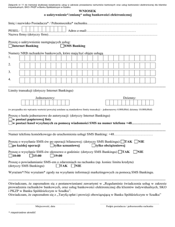 Załącznik nr 11 do Instrukcji służbowej świadczenia usług w zakresie prowadzenia rachunków bankowych oraz usług bankowości elektronicznej dla klientów indywidualnych, SKO i PKZP w Banku Spółdzielczym w Szadku WNIOSEK o uaktywnienie*/zmianę* usług bankowości elektronicznej Imię i nazwisko Posiadacza* / Pełnomocnika* rachunku…………………………………………………… PESEL: Adres e-mail:…………………………………… Nazwa firmy (dotyczy firm)………………………………………………………………………………… Proszę o uaktywnienie następujących usług: Internet Banking SMS Banking Numery NRB rachunków bankowych, które mają być objęte usługą 1. 2. 3. 4. -------------------------------------------------------------------------------------------------------------------------------------Limity transakcji (dotyczy Internet Bankingu) Jednorazowy: Dzienny: (w przypadku nie wpisania wartości powyżej ustalane są standardowe limity transakcji – jednorazowy 4.000,00zł; dzienny 10.000,00zł) Proszę o hasła jednorazowe do autoryzacji: (dotyczy Internet Bankingu) w postaci papierowej listy w postaci haseł wysyłanych za pomocą wiadomości SMS na numer telefonu +48……………………. -------------------------------------------------------------------------------------------------------------------------------------Numer telefonu komórkowego do uruchomienia usługi SMS Banking: +48…………………………… Proszę o wysyłanie SMS-ów po operacji bilansowej: (dotyczy SMS Bankingu) TAK po każdej operacji tylko uznaniowej tylko obciążeniowej NIE Proszę o wysyłanie SMS-ów okresowo o godzinie: (dotyczy SMS Bankingu) 10:00 15:00 19:00 NIE TAK Proszę o powiadamianie SMS-em o zdarzeniach na rachunku (np. koniec limitu kredytu) (dotyczy SMS Bankingu) TAK NIE Wyrażam*/Nie wyrażam* zgody na wysyłanie informacji marketingowych za pomocą SMS Bankingu. -------------------------------------------------------------------------------------------------------------------------------------Oświadczam, że zapoznałem się z postanowieniami zawartymi w „Regulaminie świadczenia usług w zakresie prowadzenia rachunków bankowych, oraz usług bankowości elektronicznej dla klientów indywidualnych, SKO i PKZP w Banku Spółdzielczym w Szadku”. Oświadczam, że zapoznałem się z „Taryfą opłat i prowizji obowiązującą w Banku Spółdzielczym w Szadku” …………………………………………………………. Miejscowość, data * niepotrzebne skreślić …………………………………………………………. Podpis posiadacza / pełnomocnika rachunku Załącznik nr 11 do Instrukcji służbowej świadczenia usług w zakresie prowadzenia rachunków bankowych oraz usług bankowości elektronicznej dla klientów indywidualnych, SKO i PKZP w Banku Spółdzielczym w Szadku Wniosek przyjęto i zarejestrowano pod numerem ……………………… …………………………………………………………. Miejscowość, data …………………………………………………………. Stempel imienny i podpis pracownika Banku -------------------------------------------------------------------------------------------------------------------------------------Potwierdzam odbiór środków identyfikacji elektronicznej tj. loginów i haseł dostępu. …………………………………………………………. Miejscowość, data …………………………………………………………. Podpis posiadacza / pełnomocnika rachunku -------------------------------------------------------------------------------------------------------------------------------------Proszę o zawieszenie następujących usług: Internet Banking SMS Banking …………………………………………………………. Miejscowość, data * niepotrzebne skreślić …………………………………………………………. Podpis posiadacza / pełnomocnika rachunku