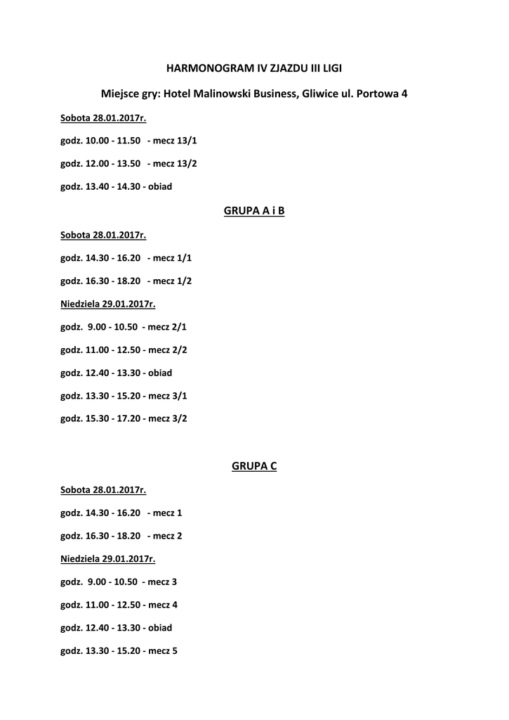 HARMONOGRAM IV ZJAZDU III LIGI Miejsce gry: Hotel Malinowski Business, Gliwice ul. Portowa 4 Sobota 28.01.2017r. godz. 10.00 - 11.50 - mecz 13/1 godz. 12.00 - 13.50 - mecz 13/2 godz. 13.40 - 14.30 - obiad GRUPA A i B Sobota 28.01.2017r. godz. 14.30 - 16.20 - mecz 1/1 godz. 16.30 - 18.20 - mecz 1/2 Niedziela 29.01.2017r. godz. 9.00 - 10.50 - mecz 2/1 godz. 11.00 - 12.50 - mecz 2/2 godz. 12.40 - 13.30 - obiad godz. 13.30 - 15.20 - mecz 3/1 godz. 15.30 - 17.20 - mecz 3/2 GRUPA C Sobota 28.01.2017r. godz. 14.30 - 16.20 - mecz 1 godz. 16.30 - 18.20 - mecz 2 Niedziela 29.01.2017r. godz. 9.00 - 10.50 - mecz 3 godz. 11.00 - 12.50 - mecz 4 godz. 12.40 - 13.30 - obiad godz. 13.30 - 15.20 - mecz 5