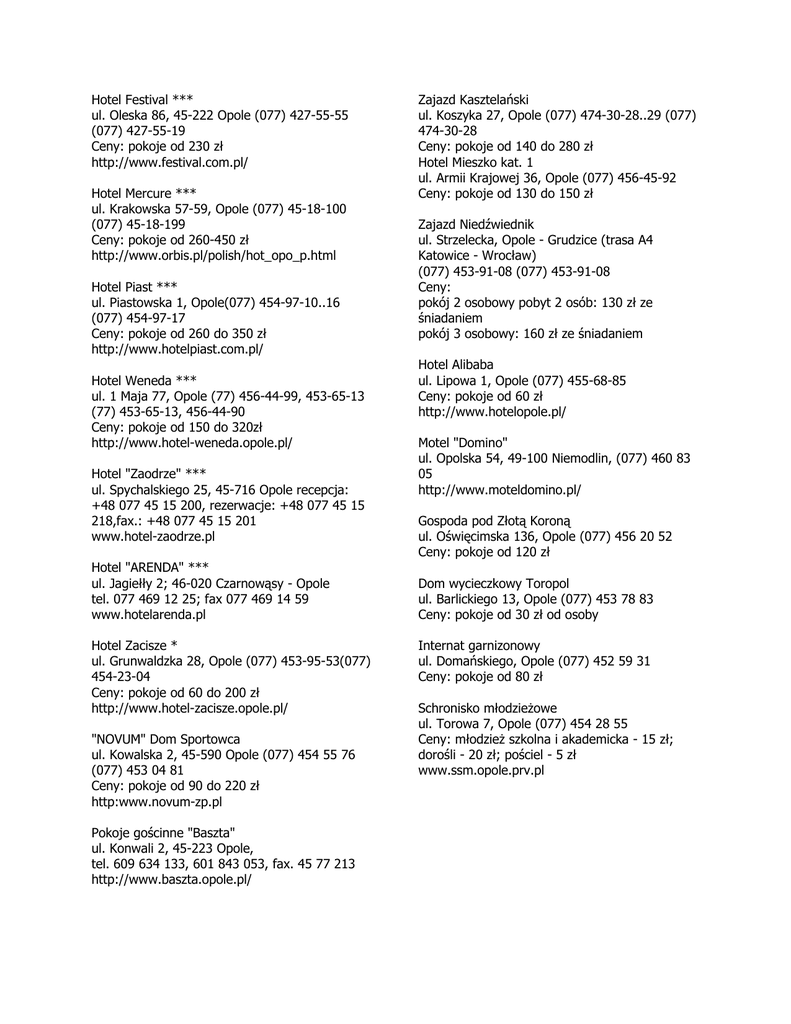 Hotel Festival *** ul. Oleska 86, 45-222 Opole (077) 427-55-55 (077) 427-55-19 Ceny: pokoje od 230 http://www.festival.com.pl/ Hotel Mercure *** ul. Krakowska 57-59, Opole (077) 45-18-100 (077) 45-18-199 Ceny: pokoje od 260-450 http://www.orbis.pl/polish/hot_opo_p.html Hotel Piast *** ul. Piastowska 1, Opole(077) 454-97-10..16 (077) 454-97-17 Ceny: pokoje od 260 do 350 http://www.hotelpiast.com.pl/ Hotel Weneda *** ul. 1 Maja 77, Opole (77) 456-44-99, 453-65-13 (77) 453-65-13, 456-44-90 Ceny: pokoje od 150 do http://www.hotel-weneda.opole.pl/ Hotel "Zaodrze" *** ul. Spychalskiego 25, 45-716 Opole recepcja: +48 077 45 15 200, rezerwacje: +48 077 45 15 218,fax.: +48 077 45 15 201 www.hotel-zaodrze.pl Hotel "ARENDA" *** ul. 2; 46-020 - Opole tel. 077 469 12 25; fax 077 469 14 59 www.hotelarenda.pl Hotel Zacisze * ul. Grunwaldzka 28, Opole (077) 453-95-53(077) 454-23-04 Ceny: pokoje od 60 do 200 http://www.hotel-zacisze.opole.pl/ "NOVUM" Dom Sportowca ul. Kowalska 2, 45-590 Opole (077) 454 55 76 (077) 453 04 81 Ceny: pokoje od 90 do 220 http:www.novum-zp.pl Pokoje "Baszta" ul. Konwali 2, 45-223 Opole, tel. 609 634 133, 601 843 053, fax. 45 77 213 http://www.baszta.opole.pl/ Zajazd ul. Koszyka 27, Opole (077) 474-30-28..29 (077) 474-30-28 Ceny: pokoje od 140 do 280 Hotel Mieszko kat. 1 ul. Armii Krajowej 36, Opole (077) 456-45-92 Ceny: pokoje od 130 do 150 Zajazd ul. Strzelecka, Opole - Grudzice (trasa A4 Katowice (077) 453-91-08 (077) 453-91-08 Ceny: pokój 2 osobowy pobyt 2 osób: 130 ze pokój 3 osobowy: 160 ze Hotel Alibaba ul. Lipowa 1, Opole (077) 455-68-85 Ceny: pokoje od 60 http://www.hotelopole.pl/ Motel "Domino" ul. Opolska 54, 49-100 Niemodlin, (077) 460 83 05 http://www.moteldomino.pl/ Gospoda pod ul. 136, Opole (077) 456 20 52 Ceny: pokoje od 120 Dom wycieczkowy Toropol ul. Barlickiego 13, Opole (077) 453 78 83 Ceny: pokoje od 30 od osoby Internat garnizonowy ul. Opole (077) 452 59 31 Ceny: pokoje od 80 Schronisko ul. Torowa 7, Opole (077) 454 28 55 Ceny: szkolna i akademicka - 15 - 20 -5 www.ssm.opole.prv.pl