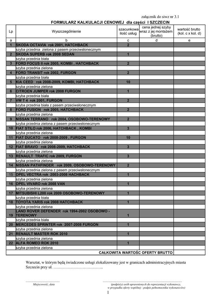 załącznik do siwz nr 3.1 FORMULARZ KALKULACJI CENOWEJ dla części I SZCZECIN Lp a 1 2 3 4 5 6 7 8 9 10 11 12 13 14 15 16 17 18 19 20 21 22 cena jednej szyby szacunkowa wraz z jej montażem ilość usług (brutto) c d 2 Wyszczególnienie wartość brutto (kol. c x kol. d) b SKODA OCTAVIA rok 2001, HATCHBACK szyba przednia zielona z pasem przeciwsłonecznym SKODA SUPERB rok 2008 SEDAN 1 szyba przednia biała FORD FOCUS II rok 2005, KOMBI , HATCHBACK 2 szyba przednia zielona FORD TRANSIT rok 2002, FURGON 2 szyba przednia biała KIA CEED rok 2008-2009, KOMBI, HATCHBACK 10 szyba przednia zielona CITROEN JUMPER rok 2008 FURGON 1 szyba przednia biała VW T 4 rok 2001, FURGON 2 szyba przednia biała z pasem przeciwsłonecznym FORD FUSION rok 2005, HATCHBACK 2 szyba przednia zielona NISSAN TERRANO rok 2004, OSOBOWO-TERENOWY 2 szyba przednia zielona z pasem przeciwsłonecznym FIAT STILO rok 2006, HATCHBACK , KOMBI 3 szyba przednia zielona FIAT DUCATO rok 2008-2009 , FURGON 10 szyba przednia zielona FIAT BRAVO rok 2008-2009, HATCHBACK 3 szyba przednia zielona RENAULT TRAFIC rok 2009, FURGON 3 szyba przednia zielona NISSAN PATHFINDER rok 2009, OSOBOWO-TERENOWY 2 szyba przednia zielona z pasem przeciwsłonecznym OPEL VECTRA rok 2003-2008 HACHBACK 1 szyba przednia zielona OPEL VIVARO rok 2008 VAN 1 szyba przednia zielona MITSUBISHI L200 rok 2009 OSOBOWO-TERENOWY 1 szyba przednia biała TOYOTA YARIS rok 2008 HATCHBACK 1 szyba przednia zielona LAND ROVER DEFENDER rok 1994-2002 OSOBOWO TERENOWY 1 szyba przednia biała MERCEDES SPRINTER rok 2007-2008 FURGON 1 szyba przednia zielona RENAULT MASTER ROK 2010 1 szyba przednia zielona ALFA ROMEO ROK 2010 1 szyba przednia zielona CAŁKOWITA WARTOŚC OFERTY BRUTTO Warsztat, w którym będą świadczone usługi zlokalizowany jest w granicach administracyjnych miasta Szczecin przy ul. ……………………………….. ............................................... Miejscowość, data ............................................................................................................. (podpis(y) osób uprawnionych do reprezentacji wykonawcy, w przypadku oferty wspólnej - podpis pełnomocnika wykonawców) 1 e