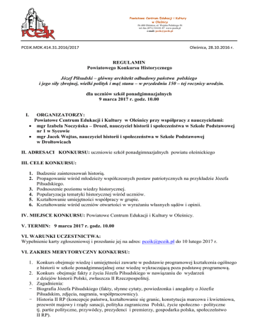 Powiatowe Centrum Edukacji i Kultury w Oleśnicy 56-400 Oleśnica, ul. Wojska Polskiego 56 tel./fax (071) 314-01-87 www.pceik.pl e-mail: [email protected] PCEiK.MDK.414.31.2016/2017 Oleśnica, 28.10.2016 r. REGULAMIN Powiatowego Konkursu Historycznego Józef Piłsudski – główny architekt odbudowy państwa polskiego i jego siły zbrojnej, wielki polityk i mąż stanu – w przededniu 150 – tej rocznicy urodzin. dla uczniów szkół ponadgimnazjalnych 9 marca 2017 r. godz. 10.00 I. ORGANIZATORZY: Powiatowe Centrum Edukacji i Kultury w Oleśnicy przy współpracy z nauczycielami: mgr Izabela Noczyńska – Drozd, nauczyciel historii i społeczeństwa w Szkole Podstawowej nr 1 w Sycowie mgr Jacek Wojtas, nauczyciel historii i społeczeństwa w Szkole Podstawowej w Drołtowicach II. ADRESACI KONKURSU: uczniowie szkół ponadgimnazjalnych powiatu oleśnickiego III. CELE KONKURSU: 1. Budzenie zainteresowań historią. 2. Propagowanie wśród młodzieży współczesnych postaw patriotycznych na przykładzie Józefa Piłsudskiego. 3. Podnoszenie poziomu wiedzy historycznej. 4. Popularyzacja tematyki historycznej wśród uczniów. 5. Kształtowanie umiejętności współpracy w grupie. 6. Kształtowanie wśród uczniów otwartości w wyrażaniu własnych sądów i opinii. IV. MIEJSCE KONKURSU: Powiatowe Centrum Edukacji i Kultury w Oleśnicy. V. TERMIN: 9 marca 2017 r. godz. 10.00 VI. WARUNKI UCZESTNICTWA: Wypełnienie karty zgłoszeniowej i przesłanie jej na adres: [email protected] do 10 lutego 2017 r. VI. ZAKRES MERYTORYCZNY KONKURSU: 1. Konkurs obejmuje wiedzę i umiejętności zawarte w podstawie programowej kształcenia ogólnego z historii w szkole ponadgimnazjalnej oraz wiedzę wykraczającą poza podstawę programową. 2. Konkurs obejmuje fakty z życia Józefa Piłsudskiego w nawiązaniu do wydarzeń z dziejów historii Polski, zwłaszcza II Rzeczpospolitej. 3. Zagadnienia: - Biografia Józefa Piłsudskiego (fakty, słynne cytaty, powiedzonka i anegdoty o Józefie Piłsudskim, zdjęcia, nagrania, współpracownicy). - Historia II RP (koncepcje państwa, kształtowanie się granic, konstytucja marcowa i kwietniowa, przewrót majowy i rządy sanacji, polityka zagraniczna Polski, życie społeczno - polityczne tj. partie polityczne, przywódcy, prezydenci i premierzy, gospodarka polska, społeczeństwo II RP). VII. ZASADY I WARUNKI UCZESTNICTWA: 1. 2. 3. 4. Konkurs ma charakter jednoetapowy. Udział uczniów w konkursie jest dobrowolny. Szkoły mogą wystawić tylko 1 drużynę składającą się z 3 uczestników. W dniu konkursu uczniowie będą brali udział w 4 rundach: Runda I: Kalendarium z życia Józefa Piłsudskiego - test wiedzy ogólnej - 30 pytań (po 1 pkt za prawidłową odpowiedź). Czas trwania testu - 30 minut. Runda II: Praca z tekstem ikonograficznym (rozpoznawanie zdjęć i nagrań). Punktacja max 10 punktów (po 1 pkt za prawidłową odpowiedź). Runda III: Praca z tekstem źródłowym (słynne cytaty, powiedzonka i anegdoty o Józefie Piłsudskim). Punktacja max 5 punktów (po 1 pkt za prawidłową odpowiedź). Runda IV: II Rzeczpospolita (praca z mapą, najważniejsze wydarzenia, analiza tekstów źródłowych). Punktacja max 5 punktów(po 1 pkt za prawidłową odpowiedź). 5. Test oraz odpowiedzi na pytania członkowie drużyn będą rozwiązywać wspólnie. 6. Punkty z zadań będą sumowane, po każdej rundzie, pytaniu. 7. W rundach 2 – 4 drużyny będą losować pytania. 8. W razie tej samej liczby głosów drużyny będą odpowiadać na dodatkowe pytania. 9. Wszyscy uczestnicy konkursu otrzymają dyplomy potwierdzające udział w konkursie. VIII. NAGRODY: Nagrody za miejsca wg obowiązującej procedury zostaną wręczone 8 czerwca 2017 r. o godz. 10.00 w Sali Widowiskowej BiFK podczas Gali PCEiK 2017 VIII. POSTANOWIENIA KOŃCOWE: 1. Udział w konkursie każdego uczestnika jest dobrowolny i oznacza przyjęcie w pełni niniejszego regulaminu. 2. Ostateczna interpretacja niniejszego regulaminu należy do organizatora. 3. Osoby łamiące zasady określone w niniejszym regulaminie zostaną wykluczone z udziału w wyżej wspomnianym konkursie. 4. Odpłatność w wysokości 8 zł od ucznia obowiązuje w przypadku szkół z miast i gmin powiatu oleśnickiego, które nie zawarły porozumienia z PCEiK w sprawie doradztwa metodycznego i doskonalenia zawodowego nauczycieli. IX. WYKAZ LITERATURY: 1. Andrzej Garlicki, Józef Piłsudski 1867-1935, Wydawnictwo Znak, Kraków 2012. 2. Włodzimierz Suleja, Józef Piłsudski, Wydawnictwo: Zakład Narodowy im. Ossolińskich, Wrocław 2001. 3. Andrzej Garlicki, Z Sulejówka do Belwederu, Wydawnictwo: Krajowa Agencja Wydawnicza, 1999. Książka z serii Dzieje Narodu Polskiego. 4. Adam Dziurok, Marek Gałęzowski, Łukasz Kamiński, Filip Musiał, OD NIEPODLEGŁOŚCI DO NIEPODLEGŁOŚCI. Historia Polski 1918-1989, Wyd. IPN, 2011. 5. Uczniowie mogą również korzystać z zasobów Internetu. Szczególnie polecamy: - Fundacja Rodziny Józefa Piłsudskiego – http://jpilsudski.org/ - Muzeum Józefa Piłsudskiego w Sulejówku - http://www.muzeumpilsudski.pl/ - Instytut Józefa Piłsudskiego w Londynie - http://www.pilsudski.org.uk/pl/index.php - Józef Piłsudski – Komendant, Naczelnik, Marszałek - www.komendant.cal.pl,