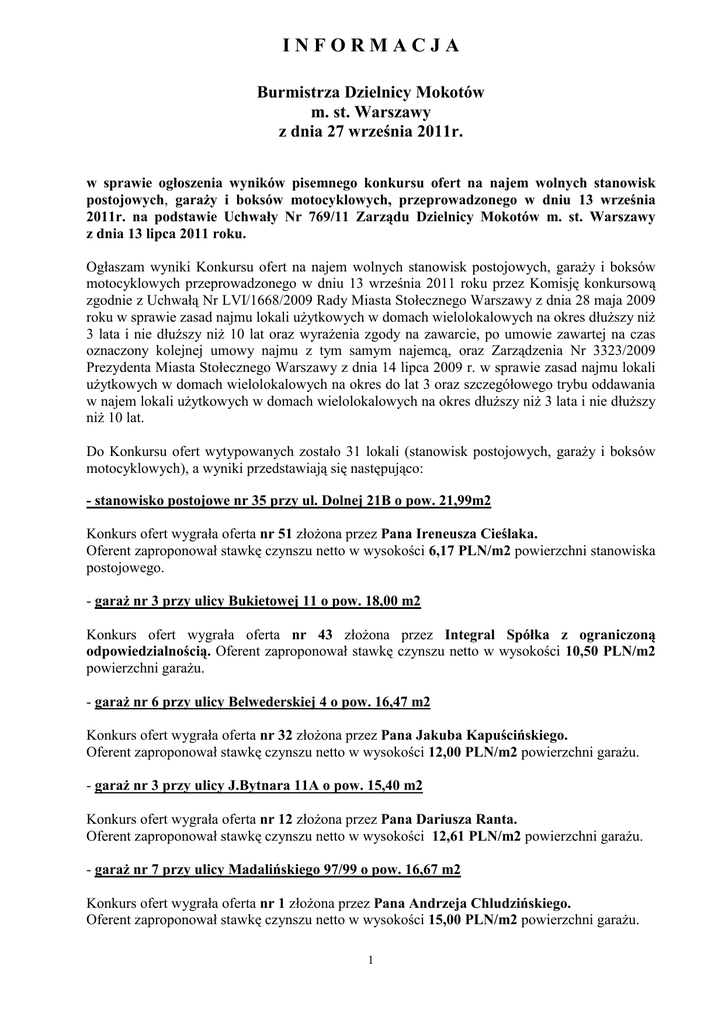 INFORMACJA Burmistrza Dzielnicy Mokotów m. st. Warszawy z dnia 27 września 2011r. w sprawie ogłoszenia wyników pisemnego konkursu ofert na najem wolnych stanowisk postojowych, garaży i boksów motocyklowych, przeprowadzonego w dniu 13 września 2011r. na podstawie Uchwały Nr 769/11 Zarządu Dzielnicy Mokotów m. st. Warszawy z dnia 13 lipca 2011 roku. Ogłaszam wyniki Konkursu ofert na najem wolnych stanowisk postojowych, garaży i boksów motocyklowych przeprowadzonego w dniu 13 września 2011 roku przez Komisję konkursową zgodnie z Uchwałą Nr LVI/1668/2009 Rady Miasta Stołecznego Warszawy z dnia 28 maja 2009 roku w sprawie zasad najmu lokali użytkowych w domach wielolokalowych na okres dłuższy niż 3 lata i nie dłuższy niż 10 lat oraz wyrażenia zgody na zawarcie, po umowie zawartej na czas oznaczony kolejnej umowy najmu z tym samym najemcą, oraz Zarządzenia Nr 3323/2009 Prezydenta Miasta Stołecznego Warszawy z dnia 14 lipca 2009 r. w sprawie zasad najmu lokali użytkowych w domach wielolokalowych na okres do lat 3 oraz szczegółowego trybu oddawania w najem lokali użytkowych w domach wielolokalowych na okres dłuższy niż 3 lata i nie dłuższy niż 10 lat. Do Konkursu ofert wytypowanych zostało 31 lokali (stanowisk postojowych, garaży i boksów motocyklowych), a wyniki przedstawiają się następująco: - stanowisko postojowe nr 35 przy ul. Dolnej 21B o pow. 21,99m2 Konkurs ofert wygrała oferta nr 51 złożona przez Pana Ireneusza Cieślaka. Oferent zaproponował stawkę czynszu netto w wysokości 6,17 PLN/m2 powierzchni stanowiska postojowego. - garaż nr 3 przy ulicy Bukietowej 11 o pow. 18,00 m2 Konkurs ofert wygrała oferta nr 43 złożona przez Integral Spółka z ograniczoną odpowiedzialnością. Oferent zaproponował stawkę czynszu netto w wysokości 10,50 PLN/m2 powierzchni garażu. - garaż nr 6 przy ulicy Belwederskiej 4 o pow. 16,47 m2 Konkurs ofert wygrała oferta nr 32 złożona przez Pana Jakuba Kapuścińskiego. Oferent zaproponował stawkę czynszu netto w wysokości 12,00 PLN/m2 powierzchni garażu. - garaż nr 3 przy ulicy J.Bytnara 11A o pow. 15,40 m2 Konkurs ofert wygrała oferta nr 12 złożona przez Pana Dariusza Ranta. Oferent zaproponował stawkę czynszu netto w wysokości 12,61 PLN/m2 powierzchni garażu. - garaż nr 7 przy ulicy Madalińskiego 97/99 o pow. 16,67 m2 Konkurs ofert wygrała oferta nr 1 złożona przez Pana Andrzeja Chludzińskiego. Oferent zaproponował stawkę czynszu netto w wysokości 15,00 PLN/m2 powierzchni garażu. 1 - garaż nr 3 przy ulicy Narbutta 26 o pow. 24,00 m2 Konkurs ofert wygrała oferta nr 21 złożona przez Panią Alicję Michalczyk. Oferent zaproponował stawkę czynszu netto w wysokości 10,01 PLN/m2 powierzchni garażu. - garaż nr 7 przy ulicy Opoczyńskiej 1/3 o pow. 17,07 m2 Konkurs ofert wygrała oferta nr 61 złożona przez Panią Annę Demianiuk. Oferent zaproponował stawkę czynszu netto w wysokości 15,10 PLN/m2 powierzchni garażu. - stanowisko postojowe nr 31 przy ul. Dolnej 21B o pow. 21,99 m2 O przydział w/w stanowiska postojowego nikt nie złożył oferty. Stanowisko postojowe zostaje przeznaczone do wynajęcia poza Konkursem ofert w ramach indywidualnych negocjacji. - stanowisko postojowe nr 36 przy ul. Dolnej 21B o pow. 21,99 m2 O przydział w/w stanowiska postojowego nikt nie złożył oferty. Stanowisko postojowe zostaje przeznaczone do wynajęcia poza Konkursem ofert w ramach indywidualnych negocjacji. - stanowisko postojowe nr 23 przy ul. Wiktorskiej 13/15 o pow. 19,57 m2 O przydział w/w stanowiska postojowego nikt nie złożył oferty. Stanowisko postojowe zostaje przeznaczone do wynajęcia poza Konkursem ofert w ramach indywidualnych negocjacji. - stanowisko postojowe nr 11 przy ul. Abramowskiego 9 o pow.26,98 m2 O przydział w/w stanowiska postojowego nikt nie złożył oferty. Stanowisko postojowe zostaje przeznaczone do wynajęcia poza Konkursem ofert w ramach indywidualnych negocjacji. - stanowisko postojowe nr 19 przy ul. Abramowskiego 9 o pow. 26,98 m2 O przydział w/w stanowiska postojowego nikt nie złożył oferty. Stanowisko postojowe zostaje przeznaczone do wynajęcia poza Konkursem ofert w ramach indywidualnych negocjacji. - stanowisko postojowe nr 25 przy ul. Abramowskiego 9 o pow. 26,98 m2 O przydział w/w stanowiska postojowego nikt nie złożył oferty. Stanowisko postojowe zostaje przeznaczone do wynajęcia poza Konkursem ofert w ramach indywidualnych negocjacji. - stanowisko postojowe nr 18 przy ul. Dolnej 21B o pow. 23,71 m2 O przydział w/w stanowiska postojowego nikt nie złożył oferty. Stanowisko postojowe zostaje przeznaczone do wynajęcia poza Konkursem ofert w ramach indywidualnych negocjacji. - garaż nr 47 przy ulicy Samochodowej 3 (I etap) o pow.17,25 m2 O przydział w/w garażu nikt nie złożył oferty. Garaż zostaje przeznaczony do wynajęcia poza Konkursem ofert w ramach indywidualnych negocjacji. - garaż nr 113 przy ulicy Samochodowej 3 (I etap) o pow. 17,25 m2 O przydział w/w garażu nikt nie złożył oferty. Garaż zostaje przeznaczony do wynajęcia poza Konkursem ofert w ramach indywidualnych negocjacji. 2 - garaż nr 12 przy ulicy Al. Niepodległości 111 o pow. 23,07 m2 O przydział w/w garażu nikt nie złożył oferty. Garaż zostaje przeznaczony do wynajęcia poza Konkursem ofert w ramach indywidualnych negocjacji. - garaż nr 13 przy ulicy Al. Niepodległości 111 o pow. 16,47 m2 O przydział w/w garażu nikt nie złożył oferty. Garaż zostaje przeznaczony do wynajęcia poza Konkursem ofert w ramach indywidualnych negocjacji. - boks motocyklowy nr 7 przy ulicy Gierymskiego 2 o pow. 4,87 m2 O przydział w/w boksu motocyklowego nikt nie złożył oferty. Boks motocyklowy zostaje przeznaczony do wynajęcia poza Konkursem ofert w ramach indywidualnych negocjacji. - garaż nr 7 przy ulicy Madalińskiego 69 o pow. 14,00 m2 O przydział w/w garażu nikt nie złożył oferty. Garaż zostaje przeznaczony do wynajęcia poza Konkurs