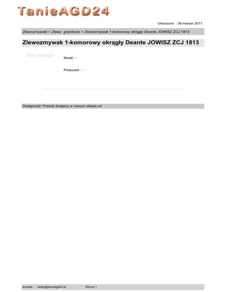Utworzono : 08 marzec 2017 Zlewozmywaki > Zlewy granitowe > Zlewozmywak 1-komorowy okrągły Deante JOWISZ ZCJ 1813 Zlewozmywak 1-komorowy okrągły Deante JOWISZ ZCJ 1813 No image Model : - Producent : - Dostępność: Produkt dostępny w naszym sklepie od kontakt : - [email protected] Strona 1