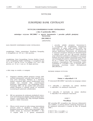 5.2.2009 PL Dziennik Urzędowy Unii Europejskiej L 36/31 WYTYCZNE EUROPEJSKI BANK CENTRALNY WYTYCZNE EUROPEJSKIEGO BANKU CENTRALNEGO z dnia 23 października 2008 r. zmieniające wytyczne EBC/2000/7 w sprawie instrumentów i procedur polityki pieniężnej Eurosystemu (EBC/2008/13) (2009/99/WE) RADA PREZESÓW EUROPEJSKIEGO BANKU CENTRALNEGO, uwzględniając Traktat ustanawiający Wspólnotę Europejską, w szczególności art. 105 ust. 2 tiret pierwsze, uwzględniając Statut Europejskiego Systemu Banków Central nych i Europejskiego Banku Centralnego, w szczególności jego art. 12 ust. 1 oraz art. 14 ust. 3 w związku z art. 3 ust. 1 tiret pierwsze, art. 18 ust. 2 oraz art. 20 akapit pierwszy, a także mając na uwadze, co następuje: (1) (2) (3) Osiągnięcie jednolitej polityki pieniężnej wymaga zdefi niowania instrumentów i procedur, które mają być stoso wane przez Eurosystem, składający się z krajowych banków centralnych (KBC) państw członkowskich, które przyjęły euro (zwanych dalej „uczestniczącymi państwami członkowskimi”) oraz Europejskiego Banku Centralnego (EBC), tak aby możliwe było prowadzenie polityki pieniężnej w jednolity sposób we wszystkich uczestniczących państwach członkowskich. EBC jest uprawniony do wydawania niezbędnych wytycz nych wprowadzających jednolitą politykę pieniężną Euro systemu, a poszczególne KBC mają obowiązek działania zgodnie z takimi wytycznymi. Obecny rozwój sytuacji na rynku wymaga wprowadzenia pewnych zmian w określaniu i realizacji polityki pieniężnej Eurosystemu. Należy zatem wprowadzić odpo wiednie zmiany do wytycznych EBC/2000/7 z dnia 31 sierpnia 2000 r. w sprawie instrumentów i procedur polityki pieniężnej Eurosystemu (1), w szczególności dla uwzględnienia następujących okoliczności: (i) zmian zasad kontroli ryzyka oraz zasad dotyczących dopuszczalności zabezpieczeń dla operacji kredytowych Eurosystemu; (ii) przyjmowania w sytuacjach awaryjnych zabezpieczeń denominowanych w walutach innych niż euro; (iii) potrzeby określenia zasad traktowania podmiotów podlegających zamrożeniu funduszy lub innym środkom stosowanym przez Wspól notę Europejską lub państwo członkowskie zgodnie z art. 60 ust. 2 Traktatu; oraz (iv) harmonizacji z nowymi przepisami rozporządzenia (WE) Europejskiego Banku Centralnego nr 1745/2003 z dnia 12 września 2003 r. dotyczącego stosowania rezerw obowiązkowych (EBC/2003/9) (2), PRZYJMUJE NINIEJSZE WYTYCZNE: Artykuł 1 Zmiany w załącznikach I i II W wytycznych EBC/2000/7 wprowadza się następujące zmiany: 1) w załączniku I wprowadza się zmiany w załączniku I do niniejszych wytycznych; określone 2) w załączniku II wprowadza się zmiany w załączniku II do niniejszych wytycznych. określone Artykuł 2 Weryfikacja KBC przesyłają EBC szczegółowe dane dotyczące dokumentów oraz środków, za pomocą których zamierzają dostosować się do niniejszych wytycznych w terminie do dnia 30 listopada 2008 r. (1) Dz.U. L 310 z 11.12.2000, s. 1. (2) Dz.U. L 250 z 2.10.2003, s. 10. L 36/32 PL Dziennik Urzędowy Unii Europejskiej Artykuł 3 Wejście w życie Niniejsze wytyczne wchodzą w życie z dniem 1 listopada 2008 r. Artykuł 1 stosuje się od dnia 1 lutego 2009 r. Artykuł 4 Adresaci Niniejsze wytyczne są skierowane do KBC uczestniczących państw członkowskich. Sporządzono we Frankfurcie nad Menem, dnia 23 października 2008 r. W imieniu Rady Prezesów EBC Jean-Claude TRICHET Prezes EBC 5.2.2009 5.2.2009 PL Dziennik Urzędowy Unii Europejskiej ZAŁĄCZNIK I W załączniku I do wytycznych EBC/2000/7 wprowadza się następujące zmiany: 1) w spisie treści wstawia się tytuł punktu 6.7 „Przyjmowanie zabezpieczeń denominowanych w walutach innych niż euro w sytuacjach awaryjnych”; 2) w punkcie 1.3.1 wprowadza się następujące zmiany: a) w pierwszym akapicie czwarte zdanie przypisu 5 otrzymuje brzmienie: „Przetargi szybkie są przeprowadzane w czasie 90 minut.”; b) ostatnie zdanie pierwszego tiret pierwszego akapitu otrzymuje brzmienie: „Podstawowe operacje refinansujące odgrywają zasadniczą rolę w realizacji celów operacji Eurosystemu na otwartym rynku.”; 3) w punkcie 2.2 pierwsze dwa zdania czwartego akapitu zastępuje się zdaniem: „W przetargach szybkich i operacjach bilateralnych krajowe banki centralne zawierają transakcje z kontrahentami z odpowiednich grup kontrahentów operacji dostrajających, ale mogą je także prowadzić z szerszą grupą kontra hentów.”; 4) tytuł punktu 2.4 otrzymuje brzmienie: „2.4. Zawieszenie lub wykluczenie ze względu na wymogi ostrożności lub w razie niewykonania zobo wiązań”; 5) w punkcie 3.1.2 skreśla się ostatnie zdanie pierwszego akapitu; 6) w punkcie 3.1.3 skreśla się drugie zdanie pierwszego akapitu; 7) w punkcie 4.1 wprowadza się następujące zmiany: a) pod nagłówkiem „Warunki dostępu” pierwszy akapit otrzymuje brzmienie: „Dostęp do kredytu w banku centralnym mają instytucje spełniające ogólne kryteria kwalifikacji zdefiniowane w punkcie 2.1. Dostępu tego udziela KBC państwa członkowskiego, w którym dana instytucja jest ustanowiona. Dostęp do kredytu w banku centralnym udzielany jest wyłącznie w dniach, w których działa TARGET2 (*), (**). W dniach, kiedy nie działają systemy SSS, dostępu do kredytu w banku centralnym udziela się na podstawie aktywów zabezpieczających złożonych wcześniej w KBC. ___________ (*) Dnia 19 listopada 2007 r. w miejsce zdecentralizowanej infrastruktury technicznej TARGET wprowadzono jednolitą wspólną platformę TARGET2, w której składa się i przetwarza wszystkie zlecenia płatnicze oraz odbiera zapłatę, technicznie w ten sam sposób. Migrację na platformę TARGET2 przeprowadzono w trzech etapach: użytkowników systemu TARGET podzielono według krajów na grupy, które przeszły na TARGET2 w różnych terminach. Skład poszczególnych grup był następujący: grupa 1 (19 listopada 2007 r.): Austr