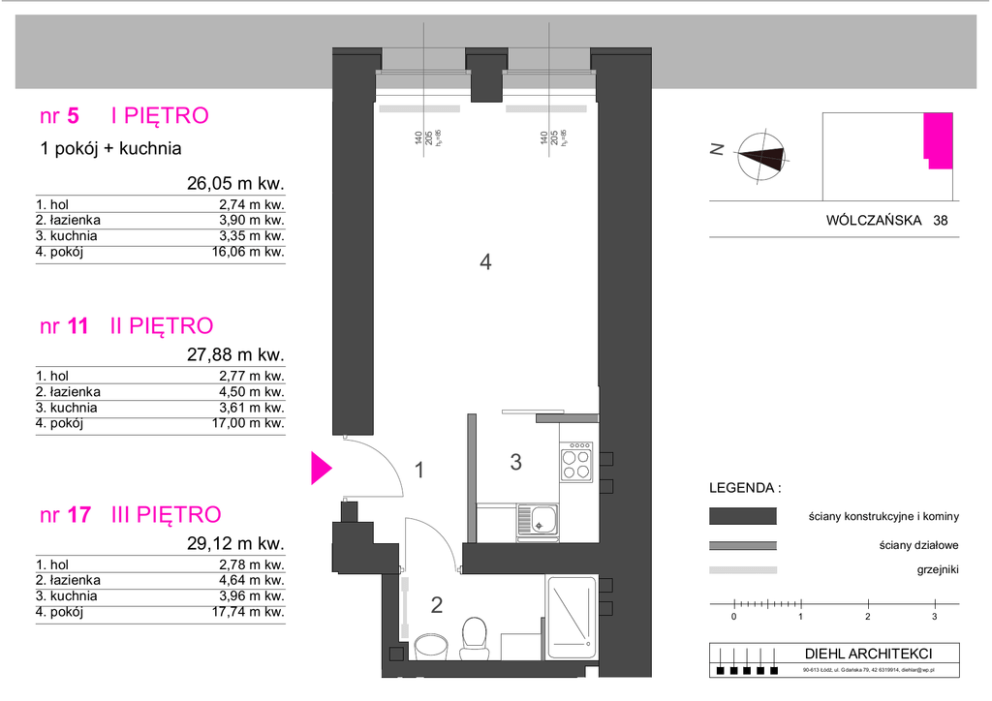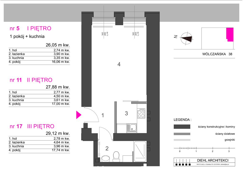 N hp =85 140 205 1 pokój + kuchnia hp =85 I PIĘTRO 140 205 nr 5 26,05 m kw. 1. hol 2. łazienka 3. kuchnia 4. pokój 2,74 m kw. 3,90 m kw. 3,35 m kw. 16,06 m kw. WÓLCZAŃSKA 38 4 nr 11 II PIĘTRO 27,88 m kw. 1. hol 2. łazienka 3. kuchnia 4. pokój 2,77 m kw. 4,50 m kw. 3,61 m kw. 17,00 m kw. 3 1 LEGENDA : nr 17 III PIĘTRO 1. hol 2. łazienka 3. kuchnia 4. pokój ściany konstrukcyjne i kominy 29,12 m kw. ściany działowe 2,78 m kw. 4,64 m kw. 3,96 m kw. 17,74 m kw. grzejniki 2 0 1 2 3 DIEHL ARCHITEKCI 90-613 Łódź, ul. G dańska 79, 42 6319914, [email protected]