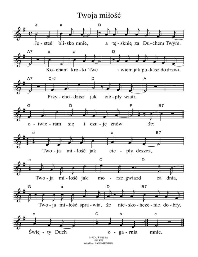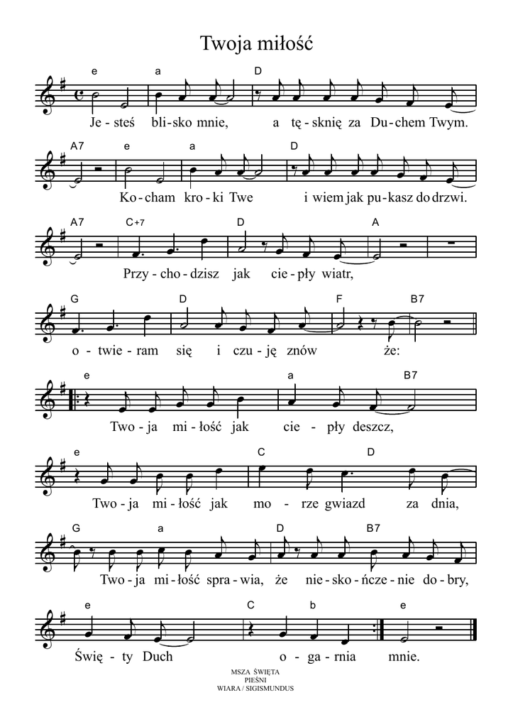 Twoja miłość # j œ œ œj ˙ e & c ˙ ˙ Je - steś # A7 Ó & ˙ œ œj œj ˙ ˙ ‰ œj œj œj œj œj œj œj D Ko - cham kro - ki Twe C +7 œ. œ œ. œ D ˙ się o - twie - ram i wiem jak pu-kasz do drzwi. ˙ ‰ œj œj œj D Przy - cho - dzisz jak cie - pły wiatr, j j œ œj œj œ i czu - ję znów j j j j œ œ œ œ œ Two - ja œ œ J # Gœ ‰ œ œ aœ œ & J J J J J œ œ J C & e œ j œ œj ˙ Świę - ty Duch ˙ Œ ‰ œJ ˙ Œ œ. j œ B7 ˙ œ J D œ œ o - ga - rnia MSZA ŚWIĘTA PIEŚNI WIARA / SIGISMUNDUS œ J za dnia, j œ œj œj nie - sko - ńcze - nie do - bry, b œ Ó Ŝe: j j Dj ‰ j j B7œ œ œ œ œ œ J C ∑ B7 mo - rze gwiazd Two - ja mi - łość spra - wia, Ŝe # ˙ Ó cie - pły deszcz, œ Two - ja mi - łość jak A F j œ a mi - łość jak # eŒ j j œ & œ œ J j œ a tę - sknię za Du- chem Twym. a ˙ œ. # . eŒ & . D bli-sko mnie, e # A7 Ó & ˙ #G & œ. j j j j ‰ œ œ œ œ œj œj a .. e ˙ mnie. Ó
