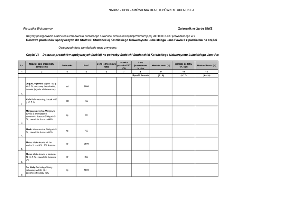 NABIAŁ - OPIS ZAMÓWIENIA DLA STOŁÓWKI STUDENCKIEJ Pieczątka Wykonawcy Załącznik nr 2g do SIWZ Dotyczy postępowania o udzielenie zamówienia publicznego o wartości szacunkowej nieprzekraczającej 209 000 EURO prowadzonego w trybie przetargu nieograniczonego pn.: Dostawa produktów spożywczych dla Stołówki Studenckiej Katolickiego Uniwersytetu Lubelskiego Jana Pawła II z podziałem na części Opis przedmiotu zamówienia wraz z wyceną: Część VII – Dostawa produktów spożywczych (nabiał) na potrzeby Stołówki Studenckiej Katolickiego Uniwersytetu Lubelskiego Jana Pawła II Lp. Nazwa i opis przedmiotu zamówienia Jednostka Ilość 1 2 4 5 Jogurt Jogobella Jogurt 150 g +/- 5 % ,owocowy: brzoskwinia, ananas, jagoda, wieloowocowy szt 2000 Kefir Kefir naturalny, kubek 400 g +/- 5 % szt 100 Margaryna zwykła Margaryna zwykła o zmniejszonej zawartości tłuszczu 250 g +/- 5 % , zawartość tłuszczu 60% kg 70 Masło Masło exstra, 200 g +/- 5 % , zawartość tłuszczu 82% kg 700 Mleko Mleko krowie Kl. I w worku 1L +/- 5 % , 2% tłuszczu litr 3500 Mleko Mleko krowie w kartonie 1L +/- 5 % , zawartość tłuszczu 2% litr 300 Ser biały Ser biały półtłusty pakowany w folii, KL. I , zawartość tłuszczu 15% kg 1800 1. 2. 3. 4. 5. 6. 7. Stawka Cena jednostkowa podatku VAT netto (%) 6 7 Cena jednostkowa brutto Wartość netto (zł) Wartość podatku VAT (zł) Wartość brutto (zł) 8 9 10 11 Sposób liczenia: (5 * 6) (9 * 7) (9 + 10) NABIAŁ - OPIS ZAMÓWIENIA DLA STOŁÓWKI STUDENCKIEJ Ser topiony Ser topiony trójkąty, zawartość białka 8 g , tłuszczu 29 g, krążek po 8 porcji 200 g + /- 5 % , smaki: MIX krążki 500 Ser żółty Ser żółty w blokach pełnotłusty zawartość tłuszczu 26 % : salami, edamski, gołda kg 600 Ser parmezan/ ser żółty tarty kg 2 Ser mozzarella kulki Ser mozzarella w lekko słonej zalewie, 8,5% tłuszczu, op. 125 g, +/- 5 % op. 70 Ser favita Ser sałatkowokanapkowy ,skład; mleko pasteryzowane, sól spożywcza, regulator kwasowości E575. op. 270 g +/- 5 % kg 30 Jogurt grecki Jogurt naturalny, super gęsty, kubek 400 g +/- 5 % szt 280 Śmietana śmietana słodka 30% tłuszczu, op. wiaderko 1L +/- 5 % op. 400 Śmietana śmietana zagęszczana 12% tłuszczu, kubek 400 g +/- 5 % op. 80 Serek homogenizowany o smaku ; waniliowym, truskawkowym, czekoladowym, brzoskwiniowym, op. 125 g +/- 5 % szt 400 8. 9. 10. 11. 12. 13. 14. 15. 16. NABIAŁ - OPIS ZAMÓWIENIA DLA STOŁÓWKI STUDENCKIEJ Serek wiejski Serek wiejski granulowany lekki, wartość odżywcza 100 g serka, op 500 g +/- 5 % szt 600 17. RAZEM Cena ofertowa netto ………………………………….………. Data i miejsce Wartość podatku VAT .................................................................... podpis osoby/osób uprawnionych do reprezentowania Wykonawcy Cena ofertowa brutto iego Jana Pawła II NABIAŁ - OPIS ZAMÓWIENIA DLA STOŁÓWKI STUDENCKIEJ