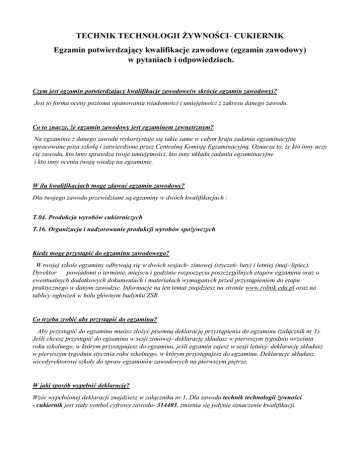 TECHNIK TECHNOLOGII ŻYWNOŚCI- CUKIERNIK Egzamin potwierdzający kwalifikacje zawodowe (egzamin zawodowy) w pytaniach i odpowiedziach. Czym jest egzamin potwierdzający kwalifikacje zawodowe(w skrócie egzamin zawodowy)? Jest to forma oceny poziomu opanowania wiadomości i umiejętności z zakresu danego zawodu. Co to znaczy, że egzamin zawodowy jest egzaminem zewnętrznym? Na egzaminie z danego zawodu wykorzystuje się takie same w całym kraju zadania egzaminacyjne opracowane poza szkołą i zatwierdzone przez Centralną Komisję Egzaminacyjną. Oznacza to, że kto inny uczy cię zawodu, kto inny sprawdza twoje umiejętności, kto inny układa zadania egzaminacyjne i kto inny ocenia twoją wiedzę na egzaminie. W ilu kwalifikacjach mogę zdawać egzamin zawodowy? Dla twojego zawodu przewidziane są egzaminy w dwóch kwalifikacjach : T.04. Produkcja wyrobów cukierniczych T.16. Organizacja i nadzorowanie produkcji wyrobów spożywczych Kiedy mogę przystąpić do egzaminu zawodowego? W twojej szkole egzaminy odbywają się w dwóch sesjach- zimowej (styczeń- luty) i letniej (maj- lipiec). Dyrektor powiadomi o terminie, miejscu i godzinie rozpoczęcia poszczególnych etapów egzaminu oraz o ewentualnych dodatkowych dokumentach i materiałach wymaganych przed przystąpieniem do etapu praktycznego w danym zawodzie. Informacje na ten temat znajdziesz na stronie www.rolnik.edu.pl oraz na tablicy ogłoszeń w holu głównym budynku ZSR. Co trzeba zrobić aby przystąpić do egzaminu? Aby przystąpić do egzaminu musisz złożyć pisemną deklarację przystąpienia do egzaminu (załącznik nr 1). Jeśli chcesz przystąpić do egzaminu w sesji zimowej- deklarację składasz w pierwszym tygodniu września roku szkolnego, w którym przystępujesz do egzaminu, jeśli egzamin zajesz w sesji letniej- deklarację składasz w pierwszym tygodniu stycznia roku szkolnego, w którym przystępujesz do egzaminu. Deklaracje składasz wicedyrektorowi szkoły do spraw egzaminów zawodowych na pierwszym piętrze. W jaki sposób wypełnić deklarację? Wzór wypełnionej deklaracji znajdziesz w załączniku nr 1. Dla zawodu technik technologii żywności - cukiernik jest stały symbol cyfrowy zawodu- 314403, zmienia się jedynie oznaczenie kwalifikacji. W pierwszej kolejności zdajesz kwalifikację: T.04. Produkcja wyrobów cukierniczych następnie zdajesz kwalifikację: T.16. Organizacja i nadzorowanie produkcji wyrobów spożywczych Pamiętaj o wpisaniu właściwego oznaczenia kwalifikacji w deklaracji. Czy istnieje możliwość przystąpienia do egzaminu w warunkach dostosowanych do indywidualnych potrzeb zdającego? Jeśli posiadasz opinię poradni psycholog.- pedagog., orzeczenie o potrzebie kształcenia specjalnego albo indywidualnego nauczania lub zaświadczenie lekarskie o stanie zdrowia- może to być podstawą do przystąpienia do egzaminu w dostosowanych do twoich potrzeb warunkach. Musisz to zaznaczyć w deklaracji i dołączyć zaświadczenie. Co się stanie jeśli nie przystąpię do egzaminu lub go nie zdam? Jeśli nie przystąpisz do egzaminu lub któregoś z jego etapów, przerwiesz egzamin lub go nie zdasz, masz prawo przystąpić do egzaminu lub jego części (pisemnej lub praktycznej) w kolejnych terminach jego przeprowadzania. Musisz ponownie złożyć deklarację: jeśli chcesz ponownie przystąpić do egzaminu w sesji zimowej- deklarację składasz w pierwszym tygodniu września, jeśli w sesji letniej- deklarację składasz w pierwszym tygodniu stycznia. Po trzech latach egzamin trzeba zdawać w całości. Jaki wynik trzeba uzyskać aby zdać egzamin? Aby zdać egzamin zawodowy, musisz uzyskać z etapu pisemnego co najmniej 50% punktów możliwych do uzyskania oraz z etapu praktycznego co najmniej 75% punktów możliwych do uzyskania. Czy można poprawiać wyniki egzaminu? Nie można poprawiać wyniku egzaminu, jeżeli go zdałeś. Wynik egzaminu zawodowego ustala okręgowa komisja egzaminacyjna i jest on ostateczny. A jeśli jestem laureatem lub finalistą turnieju lub olimpiady tematycznej? W takiej sytuacji jesteś zwolniony z części pisemnej egzaminu zawodowego i uzyskujesz 100% punktów możliwych do uzyskania. Sprawdź wykaz (uznanych przez Centralną Komisję Egzaminacyjną) turniejów i olimpiad na stronie www.cke.edu.pl Gdzie będę zdawał egzamin zawodowy? Do części pisemnej i praktycznej egzaminu przystępujesz w swojej szkole. W szczególnych przypadkach część praktyczna egzaminu może odbyć się u pracodawcy, gdzie odbywałeś praktyki zawodowe. Kiedy poznam wyniki egzaminu i jaki dokument otrzymam jeśli go zdam? Jeśli zdajesz egzamin zawodowy w sesji zimowej wyniki poznasz pod koniec marca, jeśli zdajesz egzamin w sesji letniej- wyniki poznasz pod koniec sierpnia. Po zdaniu egzaminu otrzymujesz świadectwo potwierdzające kwalifikację w danym zawodzie, wydane przez właściwą Okręgową Komisję Egzaminacyjną. Certyfikat potwierdzający, że zdałeś egzamin w danej kwalifikacji, odbierasz w sekretariacie ZSR. Jaka jest struktura egzaminu zawodowego i ile trwa egzamin? Egzamin zawodowy przeprowadzany jest w dwóch etapach: pisemnym i praktycznym. Etap pisemny przeprowadzany jest w formie testu i sprawdza wiadomości i umiejętności, które są właściwe dla kwalifikacji w danym zawodzie. Etap praktyczny polega na wykonaniu zadania egzaminacyjnego, sprawdzającego praktyczne umiejętności z zakresu kwalifikacji w wybranym przez ciebie zawodzie. Etap pisemny trwa 120 minut (2 godziny), a etap praktyczny 180–240 minut (3–4 godz.) – dokładny czas zależy od zawodu i jest określony w Informatorze dla danego zawodu. Gdzie można zdobyć Informator dla danego zawodu? Informator możecie znaleźć na stronach internetowych Centralnej Komisji Egzaminacyjnej (www.cke.edu.pl) oraz na stronach internetowych okręgowych komisji egzaminacyjnych a także na stronie internetowej szkoły rolnik.edu.pl Jak wygląda przebieg egzaminu zawodowego? Zdający część p