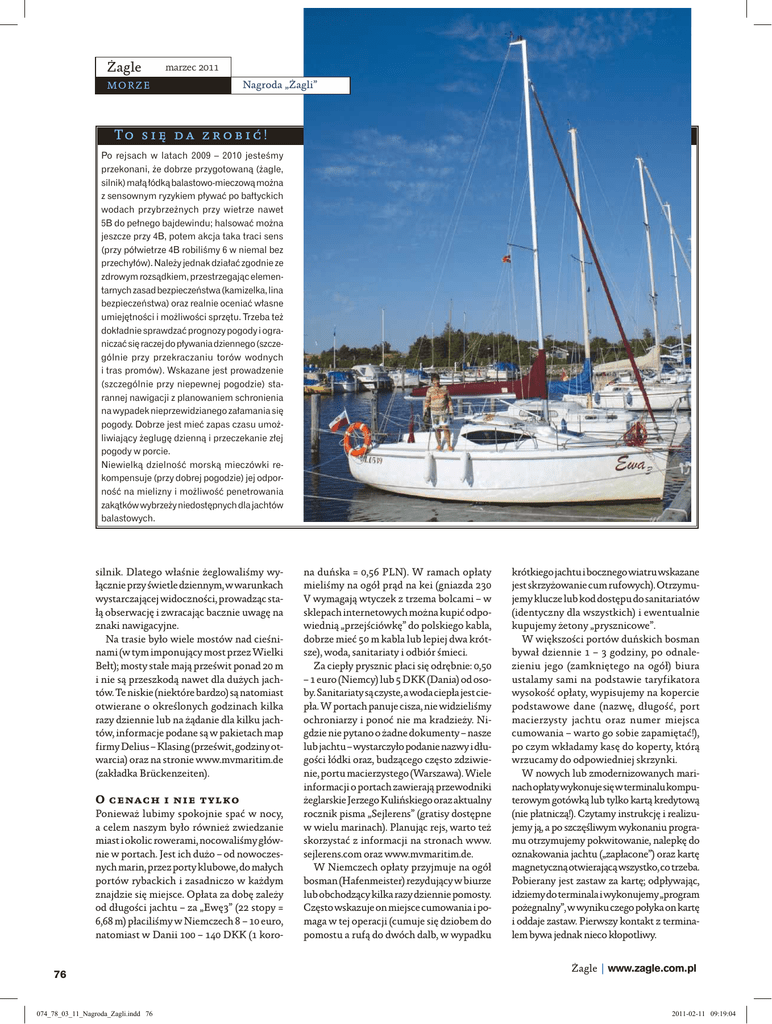 Żagle marzec 2011 m o r ze Nagroda „Żagli” To s i ę d a z r o b i ć ! Po rejsach w latach 2009 – 2010 jesteśmy przekonani, że dobrze przygotowaną (żagle, silnik) małą łódką balastowo-mieczową można z sensownym ryzykiem pływać po bałtyckich wodach przybrzeżnych przy wietrze nawet 5B do pełnego bajdewindu; halsować można jeszcze przy 4B, potem akcja taka traci sens (przy półwietrze 4B robiliśmy 6 w niemal bez przechyłów). Należy jednak działać zgodnie ze zdrowym rozsądkiem, przestrzegając elementarnych zasad bezpieczeństwa (kamizelka, lina bezpieczeństwa) oraz realnie oceniać własne umiejętności i możliwości sprzętu. Trzeba też dokładnie sprawdzać prognozy pogody i ograniczać się raczej do pływania dziennego (szczególnie przy przekraczaniu torów wodnych i tras promów). Wskazane jest prowadzenie (szczególnie przy niepewnej pogodzie) starannej nawigacji z planowaniem schronienia na wypadek nieprzewidzianego załamania się pogody. Dobrze jest mieć zapas czasu umożliwiający żeglugę dzienną i przeczekanie złej pogody w porcie. Niewielką dzielność morską mieczówki rekompensuje (przy dobrej pogodzie) jej odporność na mielizny i możliwość penetrowania zakątków wybrzeży niedostępnych dla jachtów balastowych. silnik. Dlatego właśnie żeglowaliśmy wyłącznie przy świetle dziennym, w warunkach wystarczającej widoczności, prowadząc stałą obserwację i zwracając bacznie uwagę na znaki nawigacyjne. Na trasie było wiele mostów nad cieśninami (w tym imponujący most przez Wielki Bełt); mosty stałe mają prześwit ponad 20 m i nie są przeszkodą nawet dla dużych jachtów. Te niskie (niektóre bardzo) są natomiast otwierane o określonych godzinach kilka razy dziennie lub na żądanie dla kilku jachtów, informacje podane są w pakietach map firmy Delius – Klasing (prześwit, godziny otwarcia) oraz na stronie www.mvmaritim.de (zakładka Brückenzeiten). O cenach i nie tylko Ponieważ lubimy spokojnie spać w nocy, a celem naszym było również zwiedzanie miast i okolic rowerami, nocowaliśmy głównie w portach. Jest ich dużo – od nowoczesnych marin, przez porty klubowe, do małych portów rybackich i zasadniczo w każdym znajdzie się miejsce. Opłata za dobę zależy od długości jachtu – za „Ewę3” (22 stopy = 6,68 m) płaciliśmy w Niemczech 8 – 10 euro, natomiast w Danii 100 – 140 DKK (1 koro76 074_78_03_11_Nagroda_Zagli.indd 76 na duńska = 0,56 PLN). W ramach opłaty mieliśmy na ogół prąd na kei (gniazda 230 V wymagają wtyczek z trzema bolcami – w sklepach internetowych można kupić odpowiednią „przejściówkę” do polskiego kabla, dobrze mieć 50 m kabla lub lepiej dwa krótsze), woda, sanitariaty i odbiór śmieci. Za ciepły prysznic płaci się odrębnie: 0,50 – 1 euro (Niemcy) lub 5 DKK (Dania) od osoby. Sanitariaty są czyste, a woda ciepła jest ciepła. W portach panuje cisza, nie widzieliśmy ochroniarzy i ponoć nie ma kradzieży. Nigdzie nie pytano o żadne dokumenty – nasze lub jachtu – wystarczyło podanie nazwy i długości łódki oraz, budzącego często zdziwienie, portu macierzystego (Warszawa). Wiele informacji o portach zawierają przewodniki żeglarskie Jerzego Kulińskiego oraz aktualny rocznik pisma „Sejlerens” (gratisy dostępne w wielu marinach). Planując rejs, warto też skorzystać z informacji na stronach www. sejlerens.com oraz www.mvmaritim.de. W Niemczech opłaty przyjmuje na ogół bosman (Hafenmeister) rezydujący w biurze lub obchodzący kilka razy dziennie pomosty. Często wskazuje on miejsce cumowania i pomaga w tej operacji (cumuje się dziobem do pomostu a rufą do dwóch dalb, w wypadku krótkiego jachtu i bocznego wiatru wskazane jest skrzyżowanie cum rufowych). Otrzymujemy klucze lub kod dostępu do sanitariatów (identyczny dla wszystkich) i ewentualnie kupujemy żetony „prysznicowe”. W większości portów duńskich bosman bywał dziennie 1 – 3 godziny, po odnalezieniu jego (zamkniętego na ogół) biura ustalamy sami na podstawie taryfikatora wysokość opłaty, wypisujemy na kopercie podstawowe dane (nazwę, długość, port macierzysty jachtu oraz numer miejsca cumowania – warto go sobie zapamiętać!), po czym wkładamy kasę do koperty, którą wrzucamy do odpowiedniej skrzynki. W nowych lub zmodernizowanych marinach opłaty wykonuje się w terminalu komputerowym gotówką lub tylko kartą kredytową (nie płatniczą!). Czytamy instrukcję i realizujemy ją, a po szczęśliwym wykonaniu programu otrzymujemy pokwitowanie, nalepkę do oznakowania jachtu („zapłacone”) oraz kartę magnetyczną otwierającą wszystko, co trzeba. Pobierany jest zastaw za kartę; odpływając, idziemy do terminala i wykonujemy „program pożegnalny”, w wyniku czego połyka on kartę i oddaje zastaw. Pierwszy kontakt z terminalem bywa jednak nieco kłopotliwy. Żagle | www.zagle.com.pl 2011-02-11 09:19:04