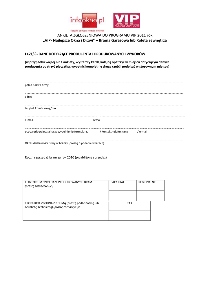 ANKIETA ZGŁOSZENIOWA DO PROGRAMU VIP 2011 rok „VIP- Najlepsze Okna i Drzwi” – Brama Garażowa lub Roleta zewnętrza I CZĘŚD- DANE DOTYCZĄCE PRODUCENTA I PRODUKOWANYCH WYROBÓW (w przypadku więcej niż 1 ankiety, wystarczy każdą kolejną opatrzyd w miejscu dotyczącym danych producenta opatrzyd pieczątką, wypełnid kompletnie drugą częśd i podpisad w stosownym miejscu) ................................................................................................................................. ........................................................................ pełna nazwa firmy ....................................................................................................................................................................................................... adres ....................................................................................................................................................................................................... tel./tel. komórkowy/ fax .......................................................................................... .......................................................................................................... e-mail www ……………………………………………………………………………………………………………………………………………………………………………………………….. osoba odpowiedzialna za wypełnienie formularza / kontakt telefoniczny / e-mail ....................................................................................................................................................................................................... Okres działalności firmy w branży (proszę o podanie w latach) ……………………………………………………………………………………………………………………… Roczna sprzedaż bram za rok 2010 (przybliżona sprzedaż) TERYTORIUM SPRZEDAŻY PRODUKOWANYCH BRAM (proszę zaznaczyd „x”) PRODUKCJA ZGODNA Z NORMĄ (proszę podad normę lub Aprobatę Techniczną), proszę zaznaczyd „x CAŁY KRAJ REGIONALNIE TAK ANKIETA ZGŁOSZENIOWA DO PROGRAMU VIP 2011 rok „VIP- Najlepsze Okna i Drzwi” – Brama Garażowa lub Roleta zewnętrza II CZĘŚD – DANE DOTYCZĄCE PRODUKTU BRAMA GARAŻOWA LUB ROLETA ZEWNĘTRZNA 1. BRAMA GARAŻOWA LUB ROLETA ZEWNĘTRZNA PRZECIWPOŻAROWA - FIRESTOP ZGŁASZANA NAZWA I RODZAJ PRODUKTU KRÓTKA CHARAKTERYSTYKA ZGŁASZANEGO PRODUKTU UWAGA: Proszę o dołączenie niezbędnych kserokopii badao oraz stosownego certyfikatu dotyczącego klasy odporności ogniowej. Bramy lub rolety zewnętrzne przeciwpożarowe powinny byd w stałej sprzedaży min 2-mce od złożenia kwestionariusza. Ankieta ważna z podpisanym regulaminem i załączonym dowodem opłaty rejestracyjnej Czytelny podpis osoby wypełniającej ……………………………………………………………