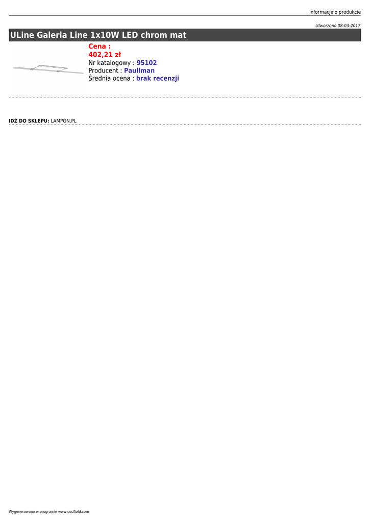 Informacje o produkcie Utworzono 08-03-2017 ULine Galeria Line 1x10W LED chrom mat Cena : 402,21 zł Nr katalogowy : 95102 Producent : Paullman Średnia ocena : brak recenzji IDŹ DO SKLEPU: LAMPON.PL Wygenerowano w programie www.oscGold.com