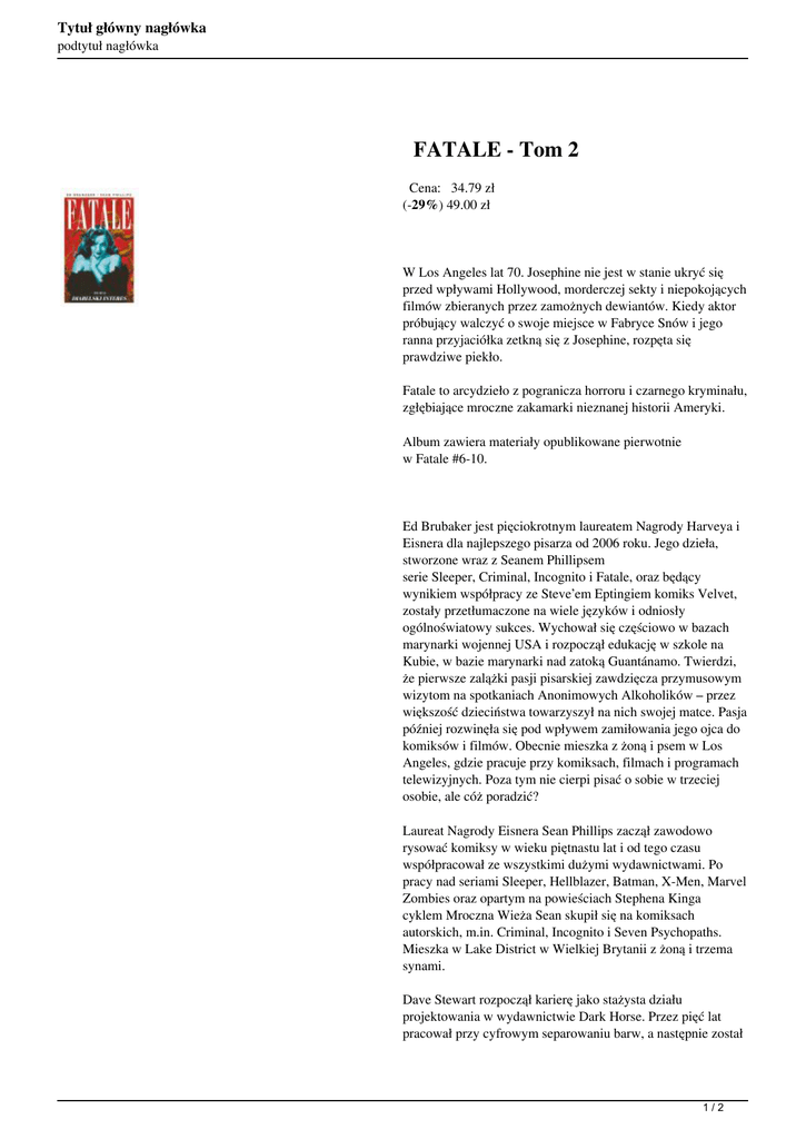 Tytuł główny nagłówka podtytuł nagłówka FATALE - Tom 2 Cena: 34.79 zł (-29%) 49.00 zł W Los Angeles lat 70. Josephine nie jest w stanie ukryć się przed wpływami Hollywood, morderczej sekty i niepokojących filmów zbieranych przez zamożnych dewiantów. Kiedy aktor próbujący walczyć o swoje miejsce w Fabryce Snów i jego ranna przyjaciółka zetkną się z Josephine, rozpęta się prawdziwe piekło. Fatale to arcydzieło z pogranicza horroru i czarnego kryminału, zgłębiające mroczne zakamarki nieznanej historii Ameryki. Album zawiera materiały opublikowane pierwotnie w Fatale #6-10. Ed Brubaker jest pięciokrotnym laureatem Nagrody Harveya i Eisnera dla najlepszego pisarza od 2006 roku. Jego dzieła, stworzone wraz z Seanem Phillipsem serie Sleeper, Criminal, Incognito i Fatale, oraz będący wynikiem współpracy ze Steve’em Eptingiem komiks Velvet, zostały przetłumaczone na wiele języków i odniosły ogólnoświatowy sukces. Wychował się częściowo w bazach marynarki wojennej USA i rozpoczął edukację w szkole na Kubie, w bazie marynarki nad zatoką Guantánamo. Twierdzi, że pierwsze zalążki pasji pisarskiej zawdzięcza przymusowym wizytom na spotkaniach Anonimowych Alkoholików – przez większość dzieciństwa towarzyszył na nich swojej matce. Pasja później rozwinęła się pod wpływem zamiłowania jego ojca do komiksów i filmów. Obecnie mieszka z żoną i psem w Los Angeles, gdzie pracuje przy komiksach, filmach i programach telewizyjnych. Poza tym nie cierpi pisać o sobie w trzeciej osobie, ale cóż poradzić? Laureat Nagrody Eisnera Sean Phillips zaczął zawodowo rysować komiksy w wieku piętnastu lat i od tego czasu współpracował ze wszystkimi dużymi wydawnictwami. Po pracy nad seriami Sleeper, Hellblazer, Batman, X-Men, Marvel Zombies oraz opartym na powieściach Stephena Kinga cyklem Mroczna Wieża Sean skupił się na komiksach autorskich, m.in. Criminal, Incognito i Seven Psychopaths. Mieszka w Lake District w Wielkiej Brytanii z żoną i trzema synami. Dave Stewart rozpoczął karierę jako stażysta działu projektowania w wydawnictwie Dark Horse. Przez pięć lat pracował przy cyfrowym separowaniu barw, a następnie został 1/2 Tytuł główny nagłówka podtytuł nagłówka niezależnym kolorystą. Otrzymał siedem Nagród Eisnera i trzy Nagrody Harveya za najlepsze nakładanie kolorów. Dave mieszka w Portland w stanie Oregon z żoną Michelle i trzema kotami. 2/2 Powered by TCPDF (www.tcpdf.org)