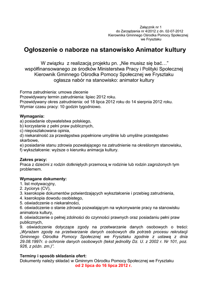 Załącznik nr 1 do Zarządzenia nr 4/2012 z dn. 02-07-2012 Kierownika Gminnego Ośrodka Pomocy Społecznej we Frysztaku Ogłoszenie o naborze na stanowisko Animator kultury W związku z realizacją projektu pn. „Nie musisz się bać…” współfinansowanego ze środków Ministerstwa Pracy i Polityki Społecznej Kierownik Gminnego Ośrodka Pomocy Społecznej we Frysztaku ogłasza nabór na stanowisko: animator kultury Forma zatrudnienia: umowa zlecenie Przewidywany termin zatrudnienia: lipiec 2012 roku. Przewidywany okres zatrudnienia: od 18 lipca 2012 roku do 14 sierpnia 2012 roku. Wymiar czasu pracy: 10 godzin tygodniowo. Wymagania: a) posiadanie obywatelstwa polskiego, b) korzystanie z pełni praw publicznych, c) nieposzlakowana opinia, d) niekaralność za przestępstwa popełnione umyślnie lub umyślne przestępstwo skarbowe, e) posiadanie stanu zdrowia pozwalającego na zatrudnienie na określonym stanowisku, f) wykształcenie: wyższe o kierunku animacja kultury. Zakres pracy: Praca z dziećmi z rodzin dotkniętych przemocą w rodzinie lub rodzin zagrożonych tym problemem. Wymagane dokumenty: 1. list motywacyjny, 2. życiorys (CV), 3. kserokopie dokumentów potwierdzających wykształcenie i przebieg zatrudnienia, 4. kserokopia dowodu osobistego, 5. oświadczenie o niekaralności, 6. oświadczenie o stanie zdrowia pozwalającym na wykonywanie pracy na stanowisku animatora kultury, 8. oświadczenie o pełnej zdolności do czynności prawnych oraz posiadaniu pełni praw publicznych, 9. oświadczenie dotyczące zgody na przetwarzanie danych osobowych o treści: „Wyrażam zgodę na przetwarzanie danych osobowych dla potrzeb procesu rekrutacji Gminnego Ośrodka Pomocy Społecznej we Frysztaku zgodnie z ustawą z dnia 29.08.1997r. o ochronie danych osobowych (tekst jednolity Dz. U. z 2002 r. Nr 101, poz. 926, z późn. zm.)”. Terminy i sposób składania ofert: Dokumenty należy składać w Gminnym Ośrodku Pomocy Społecznej we Frysztaku od 2 lipca do 16 lipca 2012 r. w godzinach 7.30 – 15.30 osobiście lub pocztą (decyduje data dostarczenia przesyłki pocztowej) z dopiskiem: „Nabór na stanowisko animatora kultury” na adres: Gminny Ośrodek Pomocy Społecznej we Frysztaku, ul. Księdza Blajera 20, 38-130 Frysztak Oferty, które wpłyną po terminie nie będą rozpatrywane Z kandydatami spełniającymi wymagania formalne zostanie przeprowadzona rozmowa kwalifikacyjna. O jej terminie kandydaci spełniający wymagania formalne zostaną poinformowani osobiście. Kryterium wyboru stanowić będzie przedstawienie atrakcyjnego projektu pracy z dziećmi w dwóch grupach wiekowych: do lat 13, w wieku 14 – 18 lat oraz doświadczenie zawodowe w pracy z dziećmi. Praca przebiegać będzie w okresie 10 dni roboczych w każdej z grup wiekowych w wymiarze 2 godzin dziennie (z wyłączeniem pracy w postaci opieki nad jedną z grup podczas planowanej wycieczki oraz wyjazdu do kina). Uwaga! Z przyczyn niezależnych ze strony usługodawcy terminy realizacji usługi mogą ulec zmianie. Dodatkowe informacje można uzyskać pod numerem telefonu (17) 27 77 925. Informacja o wyniku naboru będzie umieszczona na stronie internetowej Gminy Frysztak www.bip.frysztak.pl oraz na ogólnodostępnej tablicy informacyjnej Gminnego Ośrodka Pomocy Społecznej we Frysztaku.
