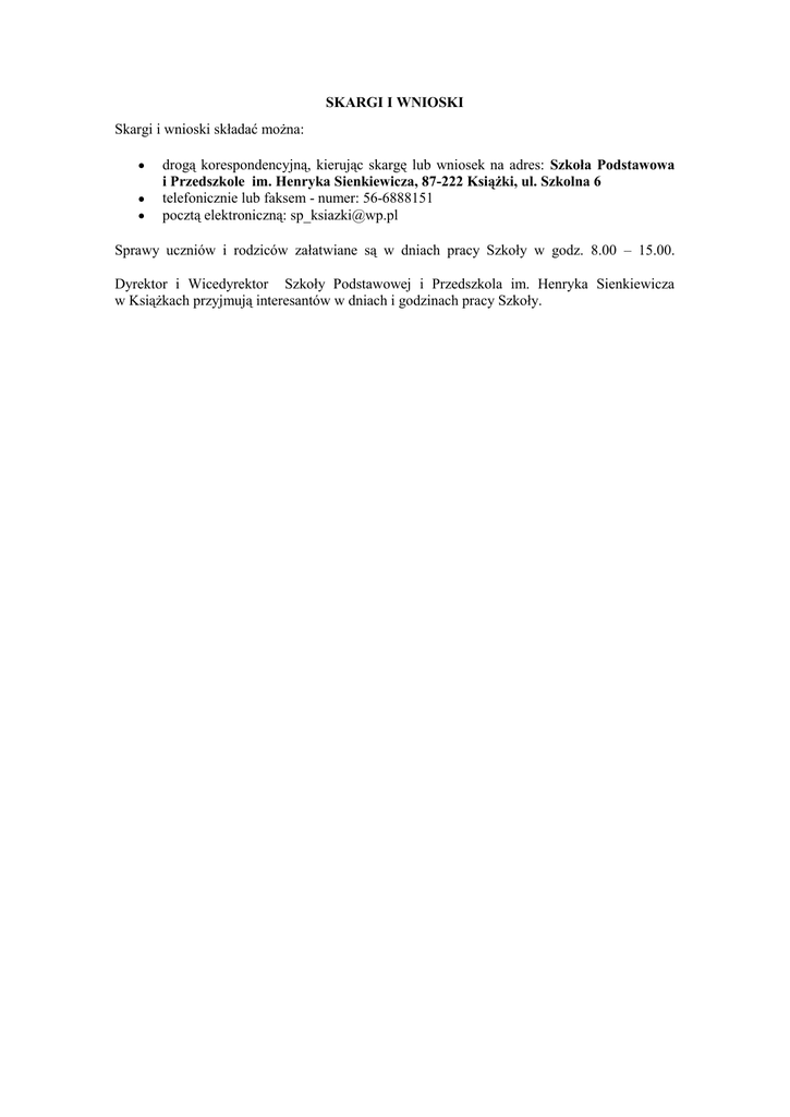 SKARGI I WNIOSKI Skargi i wnioski składać można: drogą korespondencyjną, kierując skargę lub wniosek na adres: Szkoła Podstawowa i Przedszkole im. Henryka Sienkiewicza, 87-222 Książki, ul. Szkolna 6 telefonicznie lub faksem - numer: 56-6888151 pocztą elektroniczną: [email protected] Sprawy uczniów i rodziców załatwiane są w dniach pracy Szkoły w godz. 8.00 – 15.00. Dyrektor i Wicedyrektor Szkoły Podstawowej i Przedszkola im. Henryka Sienkiewicza w Książkach przyjmują interesantów w dniach i godzinach pracy Szkoły.