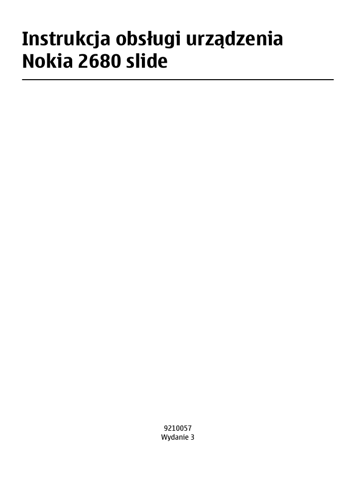 Instrukcja obsługi urządzenia Nokia 2680 slide 9210057 Wydanie 3 DEKLARACJA ZGODNOŚCI NOKIA CORPORATION niniejszym oświadcza, że produkt RM-392 jest zgodny z zasadniczymi wymaganiami oraz pozostałymi stosownymi postanowieniami Dyrektywy 1999/5/WE. Kopię „Deklaracji zgodności” można znaleźć pod adresem http://www.nokia.com/ phones/declaration_of_conformity/. © 2008 Nokia. Wszelkie prawa zastrzeżone. Nokia, Nokia Connecting People i Navi są znakami towarowymi lub zastrzeżonymi znakami towarowymi firmy Nokia Corporation. Sygnał dźwiękowy o nazwie Nokia tune jest znakiem towarowym Nokia Corporation. Inne nazwy produktów i firm wymienione w niniejszym dokumencie mogą być znakami towarowymi lub nazwami handlowymi ich właścicieli. Powielanie, przekazywanie, dystrybucja oraz przechowywanie kopii części lub całości tego dokumentu w jakiejkolwiek formie bez wyrażonej uprzednio na piśmie zgody firmy Nokia jest zabronione. Patent amerykański nr 5818437 i inne patenty w trakcie przyznawania. Oprogramowanie T9 do wprowadzania tekstu jest chronione prawami autorskimi (Copyright © 1997-2008), przyznanymi firmie Tegic Communications, Inc. Wszelkie prawa zastrzeżone. Zawiera oprogramowanie kryptograficzne lub oprogramowanie protokołu zabezpieczeń RSA BSAFE firmy RSA Security. Java jest znakiem towarowym firmy Sun Microsystems, Inc. This product is licensed under the MPEG-4 Visual Patent Portfolio License (i) for personal and noncommercial use in connection with information which has been encoded in compliance with the MPEG-4 Visual Standard by a consumer engaged in a personal and noncommercial activity and (ii) for use in connection with MPEG-4 video provided by a licensed video provider. No license is granted or shall be implied for any other use. Additional information, including that related to promotional, internal, and commercial uses, may be obtained from MPEG LA, LLC. See http:// www.mpegla.com Ten produkt podlega licencji MPEG-4 Visual Patent Portfolio, która upoważnia do (i) korzystania z niego w prywatnych i niekomercyjnych celach w związku z informacjami zakodowanymi zgodnie ze standardem MPEG-4 przez konsumenta w toku jego działań o charakterze prywatnym i niekomercyjnym oraz do (ii) używania go w związku z nagraniami wideo w formacie MPEG-4, dostarczonymi przez licencjonowanego dostawcę takich nagrań. Na wykorzystanie produktu w innym zakresie licencja nie jest udzielana ani nie może być domniemywana. Dodatkowe informacje, w tym dotyczące zastosowań produktu w celach promocyjnych, wewnętrznych i komercyjnych, można otrzymać od firmy MPEG LA, LLC. Patrz http://www.mpegla.com Firma Nokia promuje politykę nieustannego rozwoju. Firma Nokia zastrzega sobie prawo do wprowadzania zmian i usprawnień we wszelkich produktach opisanych w tym dokumencie bez uprzedniego powiadomienia. W MAKSYMALNYM DOPUSZCZALNYM PRZEZ PRAWO ZAKRESIE FIRMA NOKIA ANI ŻADEN Z JEJ LICENCJODAWCÓW W ŻADNYM WYPADKU NIE PONOSI ODPOWIEDZIALNOŚCI ZA JAKĄKOLWIEK UTRATĘ DANYCH LUB ZYSKÓW ANI ZA ŻADNE SZCZEGÓLNE, PRZYPADKOWE, WTÓRNE LUB POŚREDNIE SZKODY POWSTAŁE W DOWOLNY SPOSÓB. ZAWARTOŚĆ TEGO DOKUMENTU PRZEDSTAWIONA JEST „TAK JAK JEST – AS IS”. NIE UDZIELA SIĘ JAKICHKOLWIEK GWARANCJI, ZARÓWNO WYRAŹNYCH JAK I DOROZUMIANYCH W ODNIESIENIU DO RZETELNOŚCI, WIARYGODNOŚCI LUB TREŚCI NINIEJSZEGO DOKUMENTU, WŁĄCZAJĄC W TO, LECZ NIE OGRANICZAJĄC TEGO DO JAKICHKOLWIEK DOROZUMIANYCH GWARANCJI UŻYTECZNOŚCI HANDLOWEJ LUB PRZYDATNOŚCI DO OKREŚLONEGO CELU, CHYBA ŻE TAKOWE WYMAGANE SĄ PRZEZ PRZEPISY PRAWA. FIRMA NOKIA ZASTRZEGA SOBIE PRAWO DO DOKONYWANIA ZMIAN W TYM DOKUMENCIE LUB WYCOFANIA GO W DOWOLNYM CZASIE BEZ UPRZEDNIEGO POWIADOMIENIA. Dostępność poszczególnych produktów i aplikacji, a także i związanych z tymi produktami usług może się różnić w zależności od regionu. Szczegóły, w tym dostępność opcji językowych, należy sprawdzić ze sprzedawcą produktów Nokia. Kontrola eksportowa To urządzenie może zawierać towary, technologie i oprogramowanie podlegające przepisom eksportowym USA i innych krajów. Odstępstwa od tych przepisów są zabronione. Dostarczone wraz z urządzeniem aplikacje autorstwa osób trzecich mogły zostać opracowane przez osoby lub firmy niepowiązane z firmą Nokia i mogą być własnością takich osób lub firm. W odniesieniu do tych aplikacji firmie Nokia nie przysługują żadne prawa autorskie ani inne prawa własności intelektualnej. Nokia nie ponosi żadnej odpowiedzialności za obsługę użytkowników końcowych, za prawidłowość działania tych aplikacji, za zawarte w nich informacje czy inne materiały. Firma Nokia nie udziela też żadnych gwarancji na te aplikacje. PRZEZ FAKT UŻYCIA TYCH APLIKACJI ICH UŻYTKOWNIK PRZYJMUJE DO WIADOMOŚCI, ŻE ZOSTAŁY ONE DOSTARCZONE „TAK, JAK SĄ”, BEZ JAKICHKOLWIEK, JAWNYCH LUB DOROZUMIANYCH GWARANCJI W MAKSYMALNYM DOPUSZCZALNYM PRZEZ PRAWO ZAKRESIE. UŻYTKOWNIK PRZYJMUJE TEŻ DO WIADOMOŚCI, ŻE ANI FIRMA NOKIA ANI PODMIOTY Z NIĄ ZWIĄZANE NIE SKŁADAJĄ ŻADNYCH ZAPEWNIEŃ ANI OŚWIADCZEŃ, TAK WYRAŹNYCH JAK I DOROZUMIANYCH, DOTYCZĄCZYCH MIĘDZY INNYMI, LECZ NIE WYŁĄCZNIE, TYTUŁU PRAWNEGO DO APLIKACJI, ICH JAKOŚCI HANDLOWEJ, PRZYDATNOŚCI DO OKREŚLONEGO CELU I NIENARUSZANIA PRZEZ NIE JAKICHKOLWIEK PRAW OSÓB TRZECICH Z PATENTÓW, PRAW AUTORSKICH, ZNAKÓW TOWAROWYCH I INNYCH PRAW. 9210057/Wydanie 3 PL Spis treści Bezpieczeństwo..........................6 1. Informacje ogólne...................7 Kilka słów o urządzeniu............................7 Usługi sieciowe..........................................7 Pamięć współdzielona..............................8 Kody dostępu.............................................8 Pomoc techniczna firmy Nokia.................8 2. Szybki start..............................9 Instalacja karty SIM i baterii.....................9 Ładowanie baterii.....................................9 Antena.......