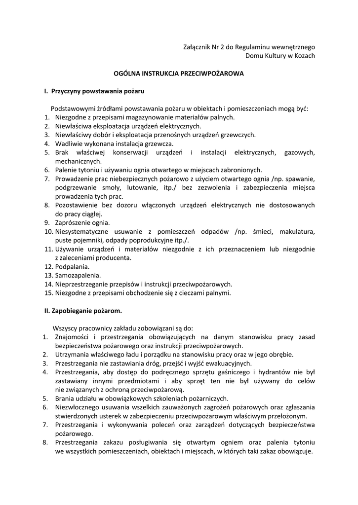 Załącznik Nr 2 do Regulaminu wewnętrznego Domu Kultury w Kozach OGÓLNA INSTRUKCJA PRZECIWPOŻAROWA I. Przyczyny powstawania pożaru Podstawowymi źródłami powstawania pożaru w obiektach i pomieszczeniach mogą byd: Niezgodne z przepisami magazynowanie materiałów palnych. Niewłaściwa eksploatacja urządzeo elektrycznych. Niewłaściwy dobór i eksploatacja przenośnych urządzeo grzewczych. Wadliwie wykonana instalacja grzewcza. Brak właściwej konserwacji urządzeo i instalacji elektrycznych, gazowych, mechanicznych. 6. Palenie tytoniu i używaniu ognia otwartego w miejscach zabronionych. 7. Prowadzenie prac niebezpiecznych pożarowo z użyciem otwartego ognia /np. spawanie, podgrzewanie smoły, lutowanie, itp./ bez zezwolenia i zabezpieczenia miejsca prowadzenia tych prac. 8. Pozostawienie bez dozoru włączonych urządzeo elektrycznych nie dostosowanych do pracy ciągłej. 9. Zaprószenie ognia. 10. Niesystematyczne usuwanie z pomieszczeo odpadów /np. śmieci, makulatura, puste pojemniki, odpady poprodukcyjne itp./. 11. Używanie urządzeo i materiałów niezgodnie z ich przeznaczeniem lub niezgodnie z zaleceniami producenta. 12. Podpalania. 13. Samozapalenia. 14. Nieprzestrzeganie przepisów i instrukcji przeciwpożarowych. 15. Niezgodne z przepisami obchodzenie się z cieczami palnymi. 1. 2. 3. 4. 5. II. Zapobieganie pożarom. 1. 2. 3. 4. 5. 6. 7. 8. Wszyscy pracownicy zakładu zobowiązani są do: Znajomości i przestrzegania obowiązujących na danym stanowisku pracy zasad bezpieczeostwa pożarowego oraz instrukcji przeciwpożarowych. Utrzymania właściwego ładu i porządku na stanowisku pracy oraz w jego obrębie. Przestrzegania nie zastawiania dróg, przejśd i wyjśd ewakuacyjnych. Przestrzegania, aby dostęp do podręcznego sprzętu gaśniczego i hydrantów nie był zastawiany innymi przedmiotami i aby sprzęt ten nie był używany do celów nie związanych z ochroną przeciwpożarową. Brania udziału w obowiązkowych szkoleniach pożarniczych. Niezwłocznego usuwania wszelkich zauważonych zagrożeo pożarowych oraz zgłaszania stwierdzonych usterek w zabezpieczeniu przeciwpożarowym właściwym przełożonym. Przestrzegania i wykonywania poleceo oraz zarządzeo dotyczących bezpieczeostwa pożarowego. Przestrzegania zakazu posługiwania się otwartym ogniem oraz palenia tytoniu we wszystkich pomieszczeniach, obiektach i miejscach, w których taki zakaz obowiązuje. 9. Przestrzegania zakazu używania benzyny i innych palnych substancji do zmywania podłóg i wykonywania innych prac oraz przechowywania w miejscach do tego celu nie przeznaczonych płynów i substancji łatwopalnych. 10. Przestrzegania zakazu: 10.1 Korzystania z uszkodzonych instalacji i urządzeo elektrycznych, gazowych i wentylacyjnych. 10.2 Jednoczesnego włączania do sieci urządzeo elektrycznych w ilości mogącej spowodowad przeciążenie sieci. 10.3 Samowolnego naprawiania bezpieczników elektrycznych oraz dokonywania samowolnie przeróbek bądź remontów urządzeo i instalacji elektrycznych, gazowych i wentylacyjnych. 10.4 Pozostawiania bez dozoru włączonych do sieci przenośnych odbiorników prądu elektrycznego nie przystosowanych do ciągłej eksploatacji jak np.: grzałki, czajniki, maszynki, promienniki, lampy itp. urządzenia. 10.5 Ustawiania grzejnych urządzeo na przedmiotach lub materiałach palnych oraz w odległości mniejszej niż 0,5 m. od materiałów palnych. 10.6 Stosowania na osłony punktów świetlnych materiałów palnych. 10.7 Zastawiania dojśd do czynnych tablic rozdzielczych, wyłączników i przełączników urządzeo elektrycznych oraz zaworów gazu i wody. 10.8 Składowania i ustawiania wszelkich materiałów palnych w odległości mniejszej niż: - 0,5 m. od pieców i innych urządzeo grzewczych, - 0,5 m. od punktów świetlnych, - 0,5 m. przewodów uziemiających oraz przewodów odprowadzających instalacji odgromowej, - 0,5 m. od linii kablowych o napięciu pow.1kV. 10.9 Rozgrzewania za pomocą otwartego ognia smoły i innych materiałów w odległości mniejszej niż 5 m od obiektu, przyległego do niego składowiska lub placu składowego z materiałami palnymi. 10.10 Wysypywania gorącego popiołu i żużla lub spalania śmieci i odpadków w miejscach umożliwiających zapalenie się sąsiednich obiektów lub materiałów palnych. 10.11 Składowania materiałów palnych na drogach komunikacji ogólnej służących ewakuacji. 10.12 Ustawiania na klatkach schodowych jakichkolwiek przedmiotów utrudniających ewakuację. 10.13 Przechowywania materiałów niebezpiecznych pożarowo w pomieszczeniach piwnicznych, na poddaszach i strychach, w obrębie klatek schodowych i korytarzy oraz innych pomieszczeniach ogólnie dostępnych, jak również na tarasach, balkonach i loggiach. 11. Dopuszczalne jest stosowanie cieczy palnych pod następującymi warunkami: 11.1 Ilośd cieczy palnych przechowywanych w jednej strefie pożarowej nie może przekroczyd 10 dcm3 cieczy o temperaturze zapłonu poniżej 21oC oraz 50 dcm3 cieczy o temperaturze zapłonu 21o – 55o C. 11.2 Przechowywad ciecze palne w oryginalnych opakowaniach fabrycznych lub handlowych, szczelnie zamkniętych, nie powodujących gromadzenia ładunków elektryczności statycznej i zabezpieczonych przed stłuczeniem. 11.3 Wszelkie prace przy użyciu cieczy palnych wykonywad wolno wówczas, gdy zapewni się skuteczną wentylację. 11.4 Nie wolno przelewad cieczy palnych do pojemników wykonanych z tworzyw sztucznych i przy pomocy lejków wykonanych z tworzyw sztucznych 11.5 Nie wolno używad do otwierania pojemników z cieczami palnymi narzędzi i urządzeo powodujących iskrzenie. 11.6 Nie wolno używad do mieszania cieczy palnych narzędzi i urządzeo powodujących iskrzenie lub gromadzących ładunki elektryczności statycznej. 11.7 Przy pracy z cieczami palnymi nie używad ubrao lub części odzieży wykonanych z tworzyw sztucznych. 11.8 Likwidowad i neutralizowad natychmiast wszelkie rozlewiska cieczy pal