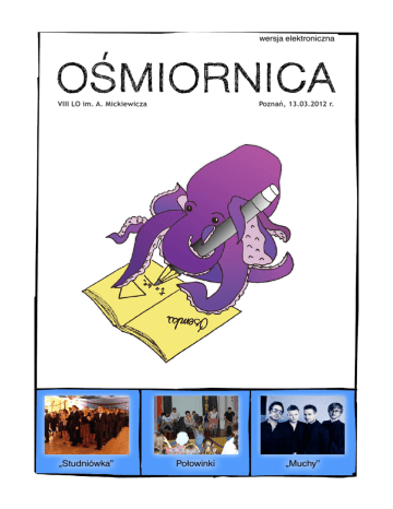 wersja elektroniczna VIII LO im. A. Mickiewicza „Studniówka” Poznań, 13.03.2012 r. Połowinki „Muchy” Wstęp Wstęp Przed Wami kolejny numer „Ośmiornicy”. Jak zwykle bogaty, tak jak bogate jest życie naszej szkoły. Dla maturzystów zegar tyka coraz głośniej, więc też głośno i radośnie bawili się na studniówce. Nie tyle głośny, co doniosły był niedawny koncert charytatywny. A i drugoklasiści obchodzili swoje połowinki, a jakże – z atrakcjami. No, ale ósemka nie tylko zabawą stoi. Minęły Targi Edukacyjne, a to znaczy, że rekrutacja tuż tuż, i przyjdzie nowy narybek. Tylko – dokąd? Czy ósemka ostanie się w starym miejscu? To ciągle wielka niewiadoma, chociaż decyzja miała być podjęta do końca lutego. O tym wszystkim czytajcie i ustosunkowujcie się do zamieszczonych tu opinii. Życzymy też uśmiechu przy lekturze wypowiedzi nauczycielskich i uczniowskich z lekcji oraz refleksji nad cytatami z zeszytów i prac klasowych… redakcja Spis treści 1. Wydarzenia 2. Twórczość 3. Humor 2 str. 3 - 12 str. 13 - 13 str. 14 - 15 Wydarzenia :: Znaczki dla Afryki Wydarzenia Znaczki dla Afryki Od 16 października – Światowego Dnia Żywności i Walki z Głodem – uczniowie „ósemki”, wspomagając misje, mogli dołączyć się do akcji „Znaczki dla Afryki” . Przedsięwzięcie polegała na wycinaniu z półcentymetrowym marginesem z pocztówek i listów ostemplowanych znaczków pocztowych, które następnie zostaną przekazane siostrom klaweriankom. Siostry znaczki wystawią na aukcjach, a za zarobione w ten sposób pieniądze kupią chleb dla głodujących dzieci w Afryce. bardzo stare i wartościowe kartki ze stemplami okolicznościowymi. Osoby pragnące włączyć się w akcję mogą przekazywać znaczki uczniom klasy IIa do końca maja. Myślę, że warto zaangażować się w tę akcję, ponieważ bez żadnych nakładów finansowych można pomagać głodującym dzieciom. Więcej informacji znajdziemy na plakatach wiszących w łączniku oraz przy zejściu do szatni, jak również na stronie internetowej znaczek.isidorus.net. Co 6 sekund na świecie umiera z głodu jedno dziecko. Wspomóżmy głodujących! Beata Szturemska W zeszłym tygodniu pozbieraliśmy znaczki od klas i w ten sposób zamknęliśmy pierwszy etap akcji. W zbiórkę szczególnie zaangażowali się uczniowie klas Id i IIa. Dzień bez pytania i kartkówek został przyznany uczniom klasy IIa, którzy zebrali ponad 1900 znaczków, drugie miejsce zajęli uczniowie klasy Id (502 znaczki). Godny uwagi jest gest Pani profesor Jolanty Horli, która przekazała na ten cel nie tylko znaczki pochodzące z klasera, ale również unikatowe, 3 Wydarzenia :: Studniówka Studniówka W nocy z 21 na 22 stycznia 2012 roku odbyła się studniówka. Początek zaplanowano o godzinie 19:30. Tematem balu były kraje świata. Na parterze było Las Vegas, na pierwszym piętrze Rzym, a na drugim Paryż. W auli mogliśmy rozpoznać Wenecję, chociażby po okazałej gondoli zrobionej przez uczniów. Około godziny 20:00, po krótkiej przemowie Dyrektora, rozpoczął się polonez. Pierwsze pary tradycyjnie składały się z ucznia i nauczyciela. Mimo niedużej ilości ruchów i sekwencji rozmiary auli i stromość schodów w ósemce skutecznie utrudniała uczniom chociażby zachowanie charakterystycznego dla poloneza kroku. Na szczęście P. prof. Nowak czuwał nad przebiegiem całego tańca i dbał o to, by każda z figur wyszła idealnie. Następnie zaproszono do walca. W tym momencie, gdy stałem na scenie, naprawdę było mi żal butów studniówkowiczów, ponieważ ścisk był bardzo duży. Pewna część osób już po kilku minutach opuściła aulę, zapewne aby odetchnąć. Gdy za- 4 kończono tradycyjną część taneczną, zespół Schatzi Band zaczął przygrywać do tańców, w których każdy swoje ruchy zna najlepiej. W międzyczasie podawana była kolacja w postaci barszczu i pasztecików. Mimo iż osoby odpowiedzialne za catering bardzo się starały sprostać zadaniu, nie wszyscy uczniowie dostali ciepły posiłek. Oprócz tego na stole można było znaleźć kilka rodzajów przekąsek oraz sałatek podawanych z chlebem. Chciałbym zauważyć, że nie tylko w moim przekonaniu były albo zbyt doprawione, albo zawierały zbyt dużo cebuli. Do picia były soki, napoje gazowane, kawa i herbata. Niekwestionowanym numerem jeden w całym cateringu okazała się jednak pizza. Krótko po przyniesieniu tortu dla nauczycieli w kształcie koniczynki uczniowie wraz z nauczycielami wrócili do auli, aby mogło rozpocząć się pasowanie na maturzystę. Klasy trzecie miały przygotować sentencję łacińską przyświecającą im przez ostatnie sto dni do matu- Wydarzenia :: Studniówka ry, a potem zaprezentować krótką część artystyczną. W międzyczasie wychowawcy klas wypowiadali się na temat swoich podopiecznych. Gdy nadszedł czas na rozpoczęcie ceremonii, mimo kilkukrotnych próśb Dyrektora na początku przemowy, rozentuzjazmowana wydarzeniem, jakim jest studniówka (domyślam się, że taki był powód), brać ósemki nie potrafiła się uspokoić, w konsekwencji czego została zwrócona uwaga na zachowanie i to uważam za jedną z gorszych chwil; głównie dlatego, iż myślę, że w taki dzień nauczyciele są najbliżsi uczniom, a jednak przez chwilę było po prostu nieprzyjemnie. Na szczęście potem już wszystko było w jak najlepszym porządku, gdy kolejni przewodniczący klas zostawali pasowani oraz otrzymywali koniczynki na szczęście. Oto sentencje poszczególnych klas. Osobiście uważam, iż najbardziej trafną przedstawiła klasa IIIg. IIIa: Per aspera ad astra (Przez ciernie do gwiazd) IIIb: Aetas dulcissima adulescentia est (Najmilszym okresem życia jest młodość) IIIc: Asinus asiorum in saecula saeculorum (Osioł nad osłami na wieki wieków) (klasa IIIc zadecydowała, że ta nieoficjalna sentencja o wiele bardziej pasuje do nich, więc tę mi podali. Wydaje mi 