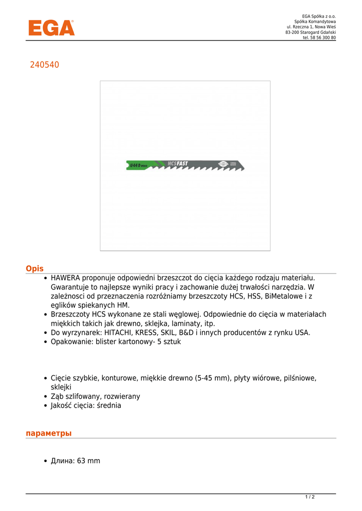 EGA Spółka z o.o. Spółka Komandytowa ul. Rzeczna 1, Nowa Wieś 83-200 Starogard Gdański tel. 58 56 300 80 240540 Opis HAWERA proponuje odpowiedni brzeszczot do cięcia każdego rodzaju materiału. Gwarantuje to najlepsze wyniki pracy i zachowanie dużej trwałości narzędzia. W zależnosci od przeznaczenia rozróżniamy brzeszczoty HCS, HSS, BiMetalowe i z eglików spiekanych HM. Brzeszczoty HCS wykonane ze stali węglowej. Odpowiednie do cięcia w materiałach miękkich takich jak drewno, sklejka, laminaty, itp. Do wyrzynarek: HITACHI, KRESS, SKIL, B&D i innych producentów z rynku USA. Opakowanie: blister kartonowy- 5 sztuk Cięcie szybkie, konturowe, miękkie drewno (5-45 mm), płyty wiórowe, pilśniowe, sklejki Ząb szlifowany, rozwierany Jakość cięcia: średnia параметры Длина: 63 mm 1/2 EGA Spółka z o.o. Spółka Komandytowa ul. Rzeczna 1, Nowa Wieś 83-200 Starogard Gdański tel. 58 56 300 80 Масштаб (мм): 4,0 упаковочный Упаковка Блистер 5 szt. Варианты № п/п. № по каталогу EAN Масштаб (мм) Długość (mm) 1 240540 4014468010248 4,0 63 2/2 Powered by TCPDF (www.tcpdf.org)
