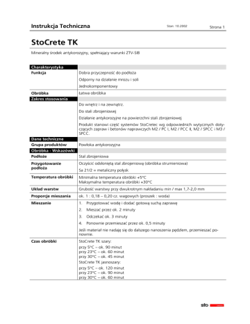 Instrukcja Techniczna Stan: 10.2002 Strona 1 StoCrete TK Mineralny środek antykorozyjny, spełniający warunki ZTV-SIB Charakterystyka Funkcja Dobra przyczepność do podłoża Odporny na działanie mrozu i soli Jednokomponentowy Obróbka Zakres stosowania Łatwa obróbka Do wnętrz i na zewnątrz. Do stali zbrojeniowej Działanie antykorozyjne na powierzchni stali zbrojeniowej Produkt stanowi część systemów StoCretec wg odpowiednich wytycznych dotyczących zapraw i betonów naprawczych M2 / PC I, M2 / PCC II, M2 / SPCC i M3 / SPCC. Dane techniczne Grupa produktów Powłoka antykorozyjna Obróbka - Wskazówki Stal zbrojeniowa Podłoże Przygotowanie podłoża Oczyścić odsłoniętą stal zbrojeniową (obróbka strumieniowa) Temperatura obróbki Minimalna temperatura obróbki +5°C Maksymalna temperatura obróbki +30°C Układ warstw Grubość warstwy przy dwukrotnym nakładaniu min / max 1,7-2,0 mm Proporcje mieszania ok. 1 : 0,18 – 0,20 cz. wagowych (proszek : woda) Mieszanie 1. Przygotować wodę i dodać gotową suchą zaprawę Sa 21/2 = metaliczny połysk 2. Mieszać przez ok. 2 minuty 3. Odczekać ok. 3 minuty 4. Ponownie przemieszać przez ok. 0,5 minuty Jeśli materiał nie nadaję się do dalszego nanoszenia pędzlem, przemieszać ponownie. Czas obróbki StoCrete TK szary: przy 5°C – ok. 90 minut przy 23°C – ok. 60 minut przy 30°C – ok. 45 minut StoCrete TK jasnoszary: przy 5°C – ok. 120 minut przy 23°C – ok. 90 minut przy 30°C – ok. 60 minut Instrukcja Techniczna Stan: 10.2002 Strona 2 StoCrete TK Mineralny środek antykorozyjny, spełniający warunki ZTV-SIB Zużycie Obróbka Artykuł sposób aplikacji orientacyjne zużycie szary przy Æ 18 mm, na jedną warstwę 130 g/mb jasnoszary przy Æ 18 mm, na jedną warstwę 140 g/mb Nanieść dokładnie i równomiernie materiał na stal zbrojeniową przy użyciu pędzla. 1. StoCrete TK jest aplikowany w dwóch cyklach roboczych na przygotowanym podłożu przy nanoszeniu PCC oraz SPPC, w zestawieniu z StoCrete TS 200 oraz przy nanoszeniu lekkich zapraw PCC z StoCrete LM. I cykl roboczy: StoCrete TK szary II cykl roboczy: StoCrete TK jasnoszary 2. StoCrete TK jest aplikowany w trzech cyklach roboczych na przygotowanym podłożu przy nanoszeniu SPPC, w zestawieniu z StoCrete TS 100 I cykl roboczy: StoCrete TK szary II cykl roboczy: StoCrete TK jasnoszary III cykl roboczy: StoCrete TK szary Czyszczenie narzędzi Wodą natychmiast po użyciu. Związany materiał można usuwać tylko mechanicznie. Formy dostawy Opakowanie worek 5 kg Składowanie Warunki składowania Chronić przed wilgocią. Czas składowania Najlepsza jakość w oryginalnym opakowaniu do ... (patrz opakowanie) Sto-ispo Sp. z o.o. ul. Zabraniecka 15 03-872 Warszawa tel. (0 22) 511 61 00 fax (0 22) 511 61 01 e-mail: [email protected] http://www.sto.pl