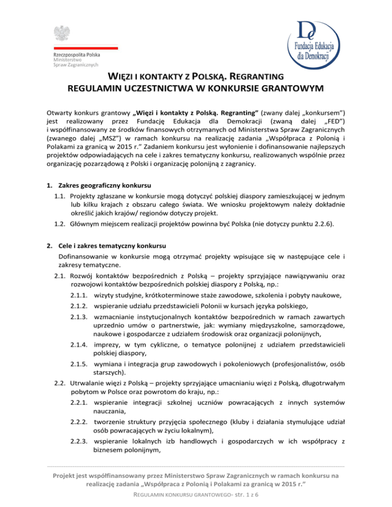 WIĘZI I KONTAKTY Z POLSKĄ. REGRANTING REGULAMIN UCZESTNICTWA W KONKURSIE GRANTOWYM Otwarty konkurs grantowy „Więzi i kontakty z Polską. Regranting” (zwany dalej „konkursem”) jest realizowany przez Fundację Edukacja dla Demokracji (zwaną dalej „FED”) i współfinansowany ze środków finansowych otrzymanych od Ministerstwa Spraw Zagranicznych (zwanego dalej „MSZ”) w ramach konkursu na realizację zadania „Współpraca z Polonią i Polakami za granicą w 2015 r.” Zadaniem konkursu jest wyłonienie i dofinansowanie najlepszych projektów odpowiadających na cele i zakres tematyczny konkursu, realizowanych wspólnie przez organizację pozarządową z Polski i organizację polonijną z zagranicy. 1. Zakres geograficzny konkursu 1.1. Projekty zgłaszane w konkursie mogą dotyczyć polskiej diaspory zamieszkującej w jednym lub kilku krajach z obszaru całego świata. We wniosku projektowym należy dokładnie określić jakich krajów/ regionów dotyczy projekt. 1.2. Głównym miejscem realizacji projektów powinna być Polska (nie dotyczy punktu 2.2.6). 2. Cele i zakres tematyczny konkursu Dofinansowanie w konkursie mogą otrzymać projekty wpisujące się w następujące cele i zakresy tematyczne. 2.1. Rozwój kontaktów bezpośrednich z Polską – projekty sprzyjające nawiązywaniu oraz rozwojowi kontaktów bezpośrednich polskiej diaspory z Polską, np.: 2.1.1. wizyty studyjne, krótkoterminowe staże zawodowe, szkolenia i pobyty naukowe, 2.1.2. wspieranie udziału przedstawicieli Polonii w kursach języka polskiego, 2.1.3. wzmacnianie instytucjonalnych kontaktów bezpośrednich w ramach zawartych uprzednio umów o partnerstwie, jak: wymiany międzyszkolne, samorządowe, naukowe i gospodarcze z udziałem środowisk oraz organizacji polonijnych, 2.1.4. imprezy, w tym cykliczne, o tematyce polonijnej z udziałem przedstawicieli polskiej diaspory, 2.1.5. wymiana i integracja grup zawodowych i pokoleniowych (profesjonalistów, osób starszych). 2.2. Utrwalanie więzi z Polską – projekty sprzyjające umacnianiu więzi z Polską, długotrwałym pobytom w Polsce oraz powrotom do kraju, np.: 2.2.1. wspieranie integracji szkolnej uczniów powracających z innych systemów nauczania, 2.2.2. tworzenie struktury przyjęcia społecznego (kluby i działania stymulujące udział osób powracających w życiu lokalnym), 2.2.3. wspieranie lokalnych izb handlowych i gospodarczych w ich współpracy z biznesem polonijnym, -------------------------------------------------------------------------------------------------------------------------------------------------------------------- Projekt jest współfinansowany przez Ministerstwo Spraw Zagranicznych w ramach konkursu na realizację zadania „Współpraca z Polonią i Polakami za granicą w 2015 r.” REGULAMIN KONKURSU GRANTOWEGO- str. 1 z 6 2.2.4. stypendia szkolne oraz studenckie dla młodzieży polonijnej realizującej naukę w Polsce, 2.2.5. wsparcie doradcze dla zagranicznych organizacji/instytucji polonijnych planujących rozszerzenie swej działalności na Polskę (zakładanie, rejestracja i prowadzenie fundacji na prawie polskim), 2.2.6. popularyzacja ww. inicjatyw w kręgach diaspory. 3. Podmioty uprawnione do udziału w konkursie 3.1. Do konkursu mogą przystąpić zarejestrowane na terenie Rzeczypospolitej Polskiej organizacje pozarządowe w rozumieniu art. 3 ust. 2 ustawy z dnia 24 kwietnia 2003 r. o działalności pożytku publicznego i wolontariacie (Dz. U. z 2010 r., Nr 234, poz. 1536 z późn. zm.) oraz podmioty wymienione w art. 3 ust. 3 ww. ustawy, w szczególności: 3.1.1. stowarzyszenia; 3.1.2. fundacje; 3.1.3. osoby prawne i jednostki organizacyjne działające na podstawie przepisów o stosunku Państwa do Kościoła Katolickiego w Rzeczpospolitej Polskiej, o stosunku Państwa do innych kościołów i związków wyznaniowych oraz o gwarancjach wolności sumienia i wyznania, jeżeli ich cele obejmują prowadzenie działalności pożytku publicznego; 3.1.4. stowarzyszenia jednostek samorządu terytorialnego; 3.1.5. spółdzielnie socjalne; 3.1.6. niepubliczne szkoły wyższe; 3.1.7. spółki akcyjne i spółki z ograniczoną odpowiedzialnością oraz kluby sportowe będące spółkami działającymi na podstawie przepisów ustawy z dnia 25 czerwca 2010 r. o sporcie (Dz. U. Nr 127, poz. 857, z późn. zm.), które nie działają w celu osiągnięcia zysku oraz przeznaczają całość dochodu na realizację celów statutowych oraz nie przeznaczają zysku do podziału między swoich udziałowców, akcjonariuszy i pracowników. 3.2. W konkursie nie mogą brać udziału podmioty wymienione w art. 3 ust. 4 ustawy z dnia 24 kwietnia 2003 r. o działalności pożytku publicznego i wolontariacie (Dz. U. z 2010 r., Nr 234, poz. 1536 z późn. zm.): partie polityczne, związki zawodowe, organizacje pracodawców; samorządy zawodowe i fundacje utworzone przez partie polityczne. 4. Partnerzy w projektach 4.1. W każdym wniosku składanym w konkursie obowiązkowy jest udział co najmniej jednego partnera polonijnego. 4.2. Partnerami polonijnymi mogą być: organizacje pozarządowe, instytucje publiczne, szkoły, uczelnie i wszelkie inne podmioty, które mają siedzibę poza Polską, posiadają osobowość prawną oraz zrzeszają Polaków mieszkających poza Polską albo działają na rzecz środowisk Polonii i Polaków mieszkających poza Polską. W wyjątkowych przypadkach (w szczególności dotyczy to państw nierespektujących wolności stowarzyszeń) partnerem może być grupa nieformalna. 4.3. Współpraca z partnerem powinna obejmować planowanie, administrowanie projektem, rozliczanie, ewaluację oraz aktywne współdziałanie w realizacji projektu. -------------------------------------------------------------------------------------------------------------------------------------------------------------------- Projekt jest współfinansowany przez Ministerstwo Spraw Zagranicznych w ramach konkursu na realizacj