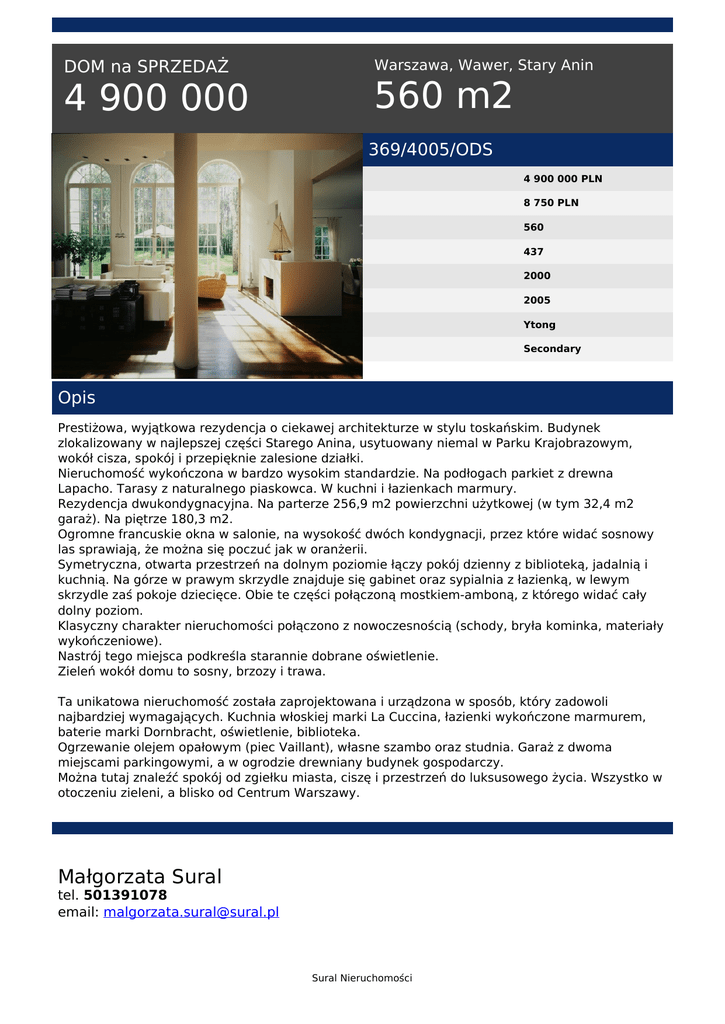 DOM na SPRZEDAŻ 4 900 000 Warszawa, Wawer, Stary Anin 560 m2 369/4005/ODS 4 900 000 PLN 8 750 PLN 560 437 2000 2005 Ytong Secondary Opis Prestiżowa, wyjątkowa rezydencja o ciekawej architekturze w stylu toskańskim. Budynek zlokalizowany w najlepszej części Starego Anina, usytuowany niemal w Parku Krajobrazowym, wokół cisza, spokój i przepięknie zalesione działki. Nieruchomość wykończona w bardzo wysokim standardzie. Na podłogach parkiet z drewna Lapacho. Tarasy z naturalnego piaskowca. W kuchni i łazienkach marmury. Rezydencja dwukondygnacyjna. Na parterze 256,9 m2 powierzchni użytkowej (w tym 32,4 m2 garaż). Na piętrze 180,3 m2. Ogromne francuskie okna w salonie, na wysokość dwóch kondygnacji, przez które widać sosnowy las sprawiają, że można się poczuć jak w oranżerii. Symetryczna, otwarta przestrzeń na dolnym poziomie łączy pokój dzienny z biblioteką, jadalnią i kuchnią. Na górze w prawym skrzydle znajduje się gabinet oraz sypialnia z łazienką, w lewym skrzydle zaś pokoje dziecięce. Obie te części połączoną mostkiem-amboną, z którego widać cały dolny poziom. Klasyczny charakter nieruchomości połączono z nowoczesnością (schody, bryła kominka, materiały wykończeniowe). Nastrój tego miejsca podkreśla starannie dobrane oświetlenie. Zieleń wokół domu to sosny, brzozy i trawa. Ta unikatowa nieruchomość została zaprojektowana i urządzona w sposób, który zadowoli najbardziej wymagających. Kuchnia włoskiej marki La Cuccina, łazienki wykończone marmurem, baterie marki Dornbracht, oświetlenie, biblioteka. Ogrzewanie olejem opałowym (piec Vaillant), własne szambo oraz studnia. Garaż z dwoma miejscami parkingowymi, a w ogrodzie drewniany budynek gospodarczy. Można tutaj znaleźć spokój od zgiełku miasta, ciszę i przestrzeń do luksusowego życia. Wszystko w otoczeniu zieleni, a blisko od Centrum Warszawy. Małgorzata Sural tel. 501391078 email: [email protected] Sural Nieruchomości Sural Nieruchomości Powered by TCPDF (www.tcpdf.org)