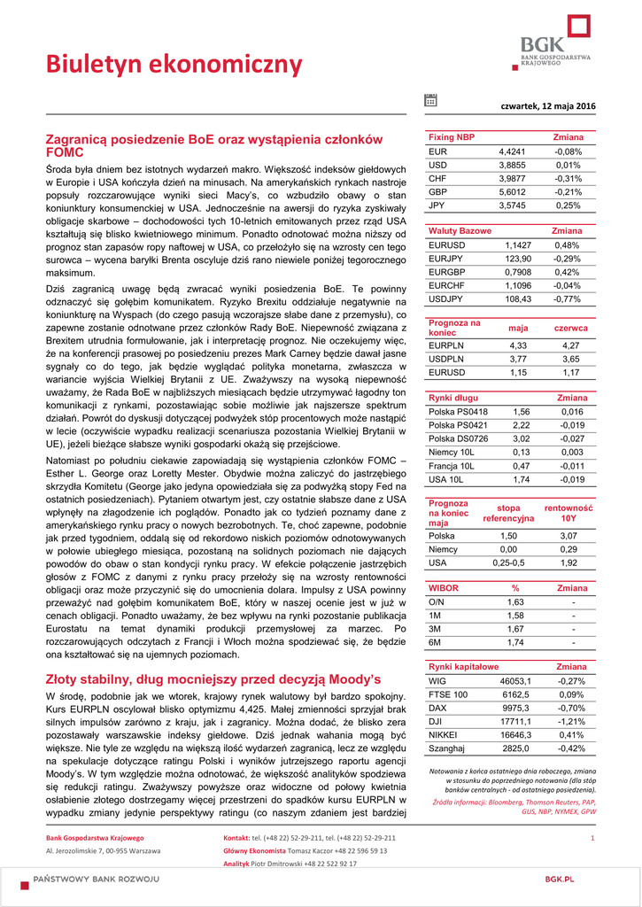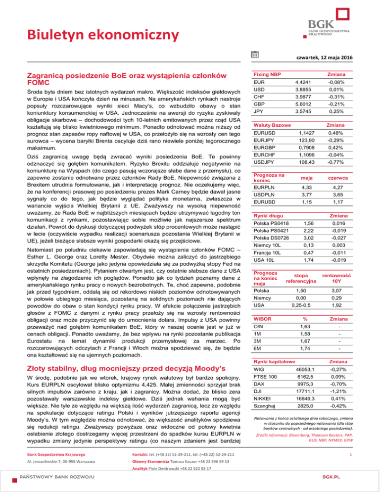 Biuletyn ekonomiczny czwartek, 12 maja 2016 Zagranicą posiedzenie BoE oraz wystąpienia członków FOMC Fixing NBP EUR 4,4241 Środa była dniem bez istotnych wydarzeń makro. Większość indeksów giełdowych w Europie i USA kończyła dzień na minusach. Na amerykańskich rynkach nastroje popsuły rozczarowujące wyniki sieci Macy’s, co wzbudziło obawy o stan koniunktury konsumenckiej w USA. Jednocześnie na awersji do ryzyka zyskiwały obligacje skarbowe – dochodowości tych 10-letnich emitowanych przez rząd USA kształtują się blisko kwietniowego minimum. Ponadto odnotować można niższy od prognoz stan zapasów ropy naftowej w USA, co przełożyło się na wzrosty cen tego surowca – wycena baryłki Brenta oscyluje dziś rano niewiele poniżej tegorocznego maksimum. USD 3,8855 0,01% CHF 3,9877 -0,31% GBP 5,6012 -0,21% JPY 3,5745 0,25% Dziś zagranicą uwagę będą zwracać wyniki posiedzenia BoE. Te powinny odznaczyć się gołębim komunikatem. Ryzyko Brexitu oddziałuje negatywnie na koniunkturę na Wyspach (do czego pasują wczorajsze słabe dane z przemysłu), co zapewne zostanie odnotwane przez członków Rady BoE. Niepewność związana z Brexitem utrudnia formułowanie, jak i interpretację prognoz. Nie oczekujemy więc, że na konferencji prasowej po posiedzeniu prezes Mark Carney będzie dawał jasne sygnały co do tego, jak będzie wyglądać polityka monetarna, zwłaszcza w wariancie wyjścia Wielkiej Brytanii z UE. Zważywszy na wysoką niepewność uważamy, że Rada BoE w najbliższych miesiącach będzie utrzymywać łagodny ton komunikacji z rynkami, pozostawiając sobie możliwie jak najszersze spektrum działań. Powrót do dyskusji dotyczącej podwyżek stóp procentowych może nastąpić w lecie (oczywiście wypadku realizacji scenariusza pozostania Wielkiej Brytanii w UE), jeżeli bieżące słabsze wyniki gospodarki okażą się przejściowe. Natomiast po południu ciekawie zapowiadają się wystąpienia członków FOMC – Esther L. George oraz Loretty Mester. Obydwie można zaliczyć do jastrzębiego skrzydła Komitetu (George jako jedyna opowiedziała się za podwyżką stopy Fed na ostatnich posiedzeniach). Pytaniem otwartym jest, czy ostatnie słabsze dane z USA wpłynęły na złagodzenie ich poglądów. Ponadto jak co tydzień poznamy dane z amerykańskiego rynku pracy o nowych bezrobotnych. Te, choć zapewne, podobnie jak przed tygodniem, oddalą się od rekordowo niskich poziomów odnotowywanych w połowie ubiegłego miesiąca, pozostaną na solidnych poziomach nie dających powodów do obaw o stan kondycji rynku pracy. W efekcie połączenie jastrzębich głosów z FOMC z danymi z rynku pracy przełoży się na wzrosty rentowności obligacji oraz może przyczynić się do umocnienia dolara. Impulsy z USA powinny przeważyć nad gołębim komunikatem BoE, który w naszej ocenie jest w już w cenach obligacji. Ponadto uważamy, że bez wpływu na rynki pozostanie publikacja Eurostatu na temat dynamiki produkcji przemysłowej za marzec. Po rozczarowujących odczytach z Francji i Włoch można spodziewać się, że będzie ona kształtować się na ujemnych poziomach. Zmiana Waluty Bazowe Zmiana EURUSD 1,1427 0,48% EURJPY 123,90 -0,29% EURGBP 0,7908 0,42% EURCHF 1,1096 -0,04% USDJPY 108,43 -0,77% Prognoza na koniec EURPLN maja czerwca 4,33 4,27 USDPLN 3,77 3,65 EURUSD 1,15 1,17 Rynki długu Zmiana Polska PS0418 1,56 0,016 Polska PS0421 2,22 -0,019 Polska DS0726 3,02 -0,027 Niemcy 10L 0,13 0,003 Francja 10L 0,47 -0,011 USA 10L 1,74 -0,019 Prognoza na koniec maja Polska stopa referencyjna rentowność 10Y 1,50 3,07 0,00 0,29 0,25-0,5 1,92 Niemcy USA WIBOR % Zmiana O/N 1,63 - 1M 1,58 - 3M 1,67 - 6M 1,74 - Rynki kapitałowe Złoty stabilny, dług mocniejszy przed decyzją Moody’s W środę, podobnie jak we wtorek, krajowy rynek walutowy był bardzo spokojny. Kurs EURPLN oscylował blisko optymizmu 4,425. Małej zmienności sprzyjał brak silnych impulsów zarówno z kraju, jak i zagranicy. Można dodać, że blisko zera pozostawały warszawskie indeksy giełdowe. Dziś jednak wahania mogą być większe. Nie tyle ze względu na większą ilość wydarzeń zagranicą, lecz ze względu na spekulacje dotyczące ratingu Polski i wyników jutrzejszego raportu agencji Moody’s. W tym względzie można odnotować, że większość analityków spodziewa się redukcji ratingu. Zważywszy powyższe oraz widoczne od połowy kwietnia osłabienie złotego dostrzegamy więcej przestrzeni do spadków kursu EURPLN w wypadku zmiany jedynie perspektywy ratingu (co naszym zdaniem jest bardziej Bank Gospodarstwa Krajowego Kontakt: tel. (+48 22) 52-29-211, tel. (+48 22) 52-29-211 Al. Jerozolimskie 7, 00-955 Warszawa Główny Ekonomista Tomasz Kaczor +48 22 596 59 13 Analityk Piotr Dmitrowski +48 22 522 92 17 -0,08% Zmiana WIG 46053,1 -0,27% FTSE 100 6162,5 0,09% DAX 9975,3 -0,70% DJI 17711,1 -1,21% NIKKEI 16646,3 0,41% Szanghaj 2825,0 -0,42% Notowania z końca ostatniego dnia roboczego, zmiana w stosunku do poprzedniego notowania (dla stóp banków centralnych - od ostatniego posiedzenia). Źródła informacji: Bloomberg, Thomson Reuters, PAP, GUS, NBP, NYMEX, GPW 1 Biuletyn ekonomiczny czwartek, 12 maja 2016 spreadzie pomiędzy polskimi, a niemieckimi obligacjami skarbowymi. Oczekujemy, że korzystna dla cen długu decyzja Moody’s stwarza większe pole do jego ponownego zawężenia, niż niekorzystna do jego dalszego rozszerzenia. uzasadnione), niż wzrostu EURPLN w wypadku cięcia oceny wiarygodności kredytowej przez Moody’s. Perspektywa publikacji ratingu Moody’s nie przeszkodziła w środowym umocnieniu polskiego długu na długim końcu i środku krzywej. To był kolejny dzień, w którym rentowności oddalały się od piątkowych szczytów. Pomagały temu dobre nastroje na rynkach bazowych. Analogicznie jak w wypadku poziomów kursu EURPLN uważamy, że cięcie ratingu jest już w znacznym stopniu wliczone w ceny polskiego długu, co uwidacznia się w