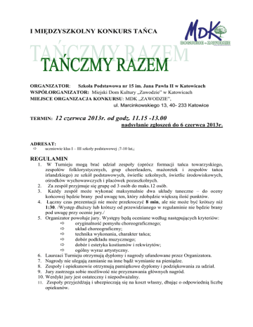 I MIĘDZYSZKOLNY KONKURS TAŃCA ORGANIZATOR: Szkoła Podstawowa nr 15 im. Jana Pawła II w Katowicach WSPÓŁORGANIZATOR: Miejski Dom Kultury „Zawodzie” w Katowicach MIEJSCE ORGANIZACJA KONKURSU: MDK „ZAWODZIE”, ul. Marcinkowskiego 13, 40- 233 Katowice TERMIN: 12 czerwca 2013r. od godz. 11.15 -13.00 nadsyłanie zgłoszeń do 6 czerwca 2013r. ADRESAT: uczniowie klas I – III szkoły podstawowej ;7-10 lat,; REGULAMIN 1. W Turnieju mogą brać udział zespoły (oprócz formacji tańca towarzyskiego, zespołów folklorystycznych, grup cheerleaders, mażoretek i zespołów tańca irlandzkiego) ze szkół podstawowych, świetlic szkolnych, świetlic środowiskowych, ośrodków wychowawczych i placówek pozaszkolnych. 2. Za zespół przyjmuje się grupę od 3 osób do maks.12 osób. 3. Każdy zespół może wykonać maksymalnie dwa układy taneczne – do oceny końcowej będzie brany pod uwagę ten, który zdobędzie większą ilość punktów. 4. Łączny czas prezentacji nie może przekroczyć 8 min, ale nie może być krótszy niż 1:30. /Występ dłuższy lub krótszy od przewidzianego w regulaminie nie będzie brany pod uwagę przy ocenie jury./ 5. Organizator powołuje jury. Występy będą oceniane według następujących kryteriów: oryginalność pomysłu choreograficznego; układ choreograficzny; technika wykonania, charakter tańca; dobór podkładu muzycznego; dobór i estetyka kostiumów i rekwizytów; ogólny wyraz artystyczny. 6. Laureaci Turnieju otrzymują dyplomy i nagrody ufundowane przez Organizatora. 7. Nagrody nie ulegają zamianie na inne bądź wymianie na pieniądze. 8. Zespoły i opiekunowie otrzymują pamiątkowe dyplomy i podziękowania za udział. 9. Jury zastrzega sobie możliwość nie przyznawania głównych nagród. 10. Werdykt jury jest ostateczny i niepodważalny. 11. Zespoły przyjeżdżają i ubezpieczają się na koszt własny, dbając o odpowiednią liczbę opiekunów. 12. Warunkiem udziału w konkursie jest nadesłanie prawidłowo wypełnionej KARTY ZGŁOSZENIA KARTE ZGŁOSZENIA należy przesłać faksem, mailem lub pocztą na adres biura organizacyjnego: Szkoła Podstawowa nr 15 im. Jana Pawła II Ul. Ks. Bpa Adamskiego 24, 40-069 Katowice tel/fax 32/2517-504 Organizator zastrzega sobie kwalifikowanie zespołów na podstawie kolejności nadesłanych kart zgłoszenia - limit to 10 prezentacji /w uzasadnionych przypadkach może być zwiększony/. Przesłanie karty jest jednoznaczne z przyjęciem zasad regulaminu konkursu. SPRAWY ORGANIZACYJNE: Kolejność prezentacji ustala Organizator. Zespoły taneczne występują przy nagraniach własnych. Uczestnicy powinni we własnym zakresie dostarczyć opisaną płytę CD (nazwa zespołu i instytucja reprezentująca), nagraną w dobrej jakości. Na płycie może być nagrany tylko utwór/ utwory do prezentacji tanecznych. Zespół zobowiązany jest do stawienia się 20 minut przed rozpoczęciem konkursu. Nie przewiduje się prób na scenie. Zespół nie może wnosić na scenę rekwizytów mogących zabrudzić scenę lub uszkodzić ciało. Organizator nie ponosi odpowiedzialności za pozostawione w szatni rzeczy osobiste i kostiumy. Organizator prosi o przestrzeganie porządku w garderobach. W szatni powinny przebywać tylko osoby z zespołu i opiekunowie. Organizatorzy zastrzegają sobie prawo do rejestracji występu oraz do wykonania nagrań i zdjęć wykonawców podczas występu bez wypłacania wynagrodzeń. Ostateczna interpretacja regulaminu przysługuje Organizatorom. Organizatorzy decydują również o wszystkich sprawach związanych z konkursem, a nie objętych niniejszym regulaminem. Wszelkich informacji udziela koordynator konkursu: Katarzyna Jendralska, [email protected] tel(fax) (32) 251 75 04, komórka prywatna 502 – 93 – 92 – 88; [email protected]