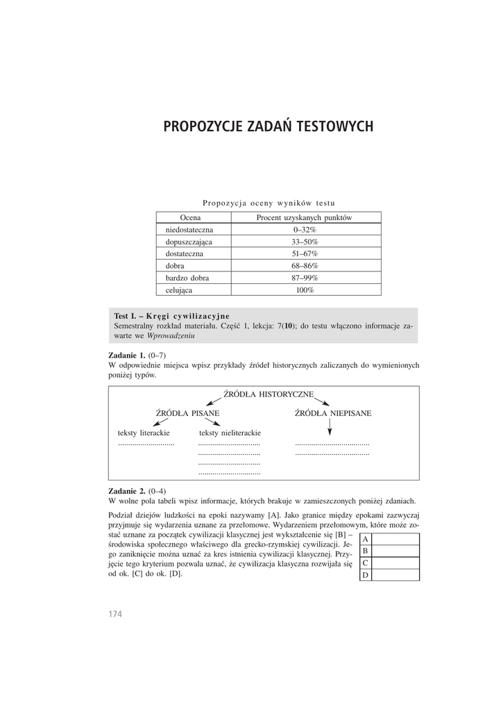 PROPOZYCJE ZADA¡ TESTOWYCH Propozycja oceny wyników testu Ocena niedostateczna dopuszczająca dostateczna dobra bardzo dobra celująca Procent uzyskanych punktów 0–32% 33–50% 51–67% 68–86% 87–99% 100% Test I. – Kręgi cywilizacyjne Semestralny rozkład materiału. Część 1, lekcja: 7(10); do testu włączono informacje zawarte we Wprowadzeniu Zadanie 1. (0–7) W odpowiednie miejsca wpisz przykłady źródeł historycznych zaliczanych do wymienionych poniżej typów. ŹRÓDŁA HISTORYCZNE ŹRÓDŁA PISANE teksty literackie ............................ teksty nieliterackie ............................... ............................... ............................... ............................... ŹRÓDŁA NIEPISANE ..................................... ..................................... Zadanie 2. (0–4) W wolne pola tabeli wpisz informacje, których brakuje w zamieszczonych poniżej zdaniach. Podział dziejów ludzkości na epoki nazywamy [A]. Jako granice między epokami zazwyczaj przyjmuje się wydarzenia uznane za przełomowe. Wydarzeniem przełomowym, które może zostać uznane za początek cywilizacji klasycznej jest wykształcenie się [B] – A środowiska społecznego właściwego dla grecko-rzymskiej cywilizacji. Jego zaniknięcie można uznać za kres istnienia cywilizacji klasycznej. Przy- B jęcie tego kryterium pozwala uznać, że cywilizacja klasyczna rozwijała się C od ok. [C] do ok. [D]. D 174 Zadanie 3. (0–2) Zaznacz odpowiedzi prawdziwe. Pierwszy w dziejach krąg cywilizacyjny stworzyły cywilizacje: A. egipska B. minojska, mykeńska C. Doliny Indusu D. perska A B C D Zadanie 4. (0–13) Wskaż pojęcia i nazwy wiążące się z cywilizacją perską i lateńską. Zwróć uwagę, że niektóre z podanych nazw i pojęć nie odnoszą się do żadnej z tych cywilizacji. A. Aryman F. Cyrus Wielki K. imperium O. satrapa B. Ahuramazda G. druidzi L. pismo klinowe P. wielki król C. Asyria H. dualizm Ł. La Téne R. Zoroaster D. Byblos I. Galowie M. Ludy Morza A B C D E F G H I E. Celtowie J. Kartagina N. mazdaizm J K L Ł M N O P R 1. cywilizacja perska 2. cywilizacja lateńska Zadanie 5. (0–5) Uporządkuj chronologicznie, od najwcześniejszego, podane niżej wydarzenia. W wolne pola wpisz odpowiednie cyfry. inwazja Dorów inwazja Ludów Morza we wschodniej części basenu Morza Śródziemnego migracja jońska upadek cywilizacji minojskiej powstanie cywilizacji mykeńskiej Zadanie 6. (0–5) Przyporządkuj cywilizacjom nazwę typu pisma. Pamiętaj, że każda z wymienionych cywilizacji posługiwała się pismem. 1 1. cywilizacja minojska A. pismo klinowe 2 2. cywilizacja lateńska B. tzw. pismo linearne A 3 3. cywilizacja klasyczna C. tzw. pismo linearne B 4 4. cywilizacja mykeńska D. pismo alfabetyczne 5 5. cywilizacja mezopotamska Zadanie 7. (0–1) Późnostarożytny krąg cywilizacyjny tworzyły cywilizacje: A. klasyczna, perska, lateńska C. klasyczna, perska, indyjska B. klasyczna, perska, egipska D. klasyczna, perska, arabska A B C D Zadanie 8. (0–14) Nazwom trzech epok w dziejach Grecji przyporządkuj daty i określenia czasu (oznaczone cyframi rzymskimi) oraz wydarzenia (oznaczone wielkimi literami) wyznaczające ich ramy chronologiczne. Litery i cyfry wpisz w odpowiednie pola tabeli. Wszystkie podane informacje muszą zostać uwzględnione. www.wsip.com.pl 175 początek (p) / koniec (k) epoki Nazwa epoki 1. Epoka archaiczna 2. Epoka klasyczna 3. Epoka hellenistyczna wydarzenie/a data/y (p) (k) (p) (k) (p) (k) Wydarzenia: A. wojny perskie B. powstanie pierwszych kolonii greckich poza Helladą C. podbój Grecji przez Rzym D. przyjęcie przez Greków pisma alfabetycznego E. panowanie Aleksandra Macedońskiego Daty, określenia czasu: I. 336–323 przed Chr. II. ok. 775 r. przed Chr. III. 500–479 przed Chr. IV. zapewne druga połowa I w. przed Chr. V. druga połowa II w. przed Chr. Zadanie 9. (0–1) Zaznacz najtrafniejszą odpowiedź. Cechą wyróżniającą cywilizację grecką było: A. wykorzystywanie pisma alfabetycznego B. tradycja heroiczna C. poczucie wspólnoty łączące Hellenów D. forma politycznej organizacji społeczeństwa A B C D Zadanie 10. (0–3) W zamieszczonych poniżej zdaniach wskaż zdania poprawne i błędne. W tych ostatnich podaj, jak być powinno. 1. W drugiej połowie VI w. przed Chr. miasta greckie w Azji Mniejszej znalazły się pod panowaniem Persji. 2. Konsekwencją wojny peloponeskiej było ugruntowanie hegemonii Aten w świecie greckim. 3. Twórcą potęgi militarnej Macedonii był Aleksander Wielki. 4. Rozprzestrzenianie się kultury greckiej na olbrzymich obszarach Wschodu rozpoczęło się w czasie panowania Aleksandra Macedońskiego. 5. Po śmierci Aleksandra Wielkiego władzę nad stworzonym przez niego imperium objął jego kilkuletni syn Aleksander. 6. Kres istnieniu państw hellenistycznych położył podbój rzymski. Jest poprawnie 1. zdanie 2. zdanie 3. zdanie 4. zdanie 5. zdanie 6. zdanie Zadanie 11. (0–3) Uzupełnij periodyzację Rzymu, wpisując nazwy epok. 176 Powinno być Ramy chronologiczne Nazwa epoki 1. 753–509 przed Chr. 2. 509–30 przed Chr. 3. 30 przed Chr.–476 po Chr. Zadanie 12. (0–2) Zaznacz wszystkie prawidłowe odpowiedzi. Wśród procesów, jakie zaszły na terytorium Imperium Rzymskiego w okresie pryncypatu największe znaczenie dziejowe miały: A B C D A. romanizacja prowincji B. rozwój chrześcijaństwa C. podbój Galii i Brytanii D. Wędrówka Ludów Zadanie 13. (0–6) Wskaż postacie i wydarzenia związane z okresem nowego Cesarstwa. A. August E. Krassus I. narodziny chrześcijaństwa L. wielostopniowy B. Cezar F. Pompejusz J. system współrządów aparat biurokratyczny C. Dioklecjan G. Teodozjusz K. podbój Galii Ł. ustanowienie drugiej D. Konstantyn H. I triumwirat stolicy Imperium A B C D E F G H I J K L Ł Zadanie 14. (0–3) Zaznacz wszystkie zdania prawdziwe. A. Początkiem Wędrówki Ludów był najazd Hunów na step czarnomorski. B. Zdetronizowanie 