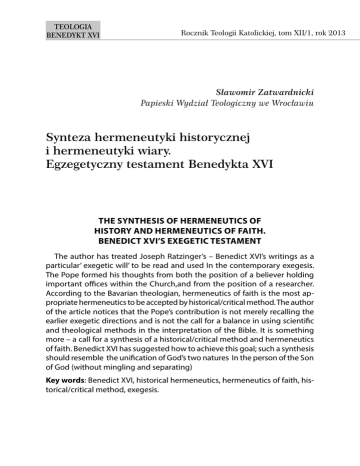 TEOLOGIA BENEDYKT XVI Rocznik Teologii Katolickiej, tom XII/1, rok 2013 Sławomir Zatwardnicki Papieski Wydział Teologiczny we Wrocławiu Synteza hermeneutyki historycznej i hermeneutyki wiary. Egzegetyczny testament Benedykta XVI THE SYNTHESIS OF HERMENEUTICS OF HISTORY AND HERMENEUTICS OF FAITH. BENEDICT XVI’S EXEGETIC TESTAMENT The author has treated Joseph Ratzinger’s – Benedict XVI’s writings as a particular’ exegetic will’ to be read and used In the contemporary exegesis. The Pope formed his thoughts from both the position of a believer holding important offices within the Church,and from the position of a researcher. According to the Bavarian theologian, hermeneutics of faith is the most appropriate hermeneutics to be accepted by historical/critical method. The author of the article notices that the Pope’s contribution is not merely recalling the earlier exegetic directions and is not the call for a balance in using scientific and theological methods in the interpretation of the Bible. It is something more – a call for a synthesis of a historical/critical method and hermeneutics of faith. Benedict XVI has suggested how to achieve this goal; such a synthesis should resemble the unification of God’s two natures In the person of the Son of God (without mingling and separating) Key words: Benedict XVI, historical hermeneutics, hermeneutics of faith, historical/critical method, exegesis. 128 Teologia Benedykt XVI Sławomir Zatwardnicki W polu zainteresowań Josepha Ratzingera niezmiennie stoi Pismo Święte, a co za tym idzie – również jego interpretacja1. Zainteresowanie to znajduje swój wyraz w całym dorobku teologicznym naukowca: od pierwszej książki napisanej przez młodego wykładowcę na Uniwersytecie w Tybindze, która nosiła tytuł Wprowadzenie w chrześcijaństwo2, aż do ostatnio wydanego, trzytomowego dzieła Jezus z Nazaretu3, ukończonego już po wyborze na Stolicę Piotrową4. Zagadnienia egzegetyczne i hermeneutyczne interesują Ratzingera nie tylko jako naukowca, ale również jako osobę zatroskaną o Kościół i wiarę we współczesnym świecie. Właśnie ten styk nauki i wiary stanowi rys charakterystyczny dla teologii Ratzingera – dlatego z radykalizmem właściwym zarówno naukowcowi, jak i odpowiedzialnemu za Kościół szukał on właściwej hermeneutyki i metod egzegetycznych, świadomy tego, że teorie interpretacyjne mają niebagatelny wpływ na praxis Kościoła. W czasie pełnienia funkcji kościelnych Ratzinger wielokrotnie powracał do tematu interpretacji Pisma, żywo interesując się – z racji jej wszechobecności na uniwersytetach oraz ze względu na jej wpływ na życie Kościoła i poszczególnych wierzących – metodą historyczno-krytyczną. Dokumenty kościelne, które powstały najpierw pod przewodnictwem Ratzingera jako przewodniczącego Papieskiej Komisji Biblijnej5, a później już Biskupa Rzymu, przewodzącego obradom Synodu Biskupów dotyczącym Słowa Bożego i wydającego podsumowującą to wydarzenie adhortację6, ujawniają wyraźnie 1 Por. J. Ratzinger, Moje życie, oprac. wersji pol. W. Wiśniowski, Częstochowa 2005, s. 61: „Dla mnie egzegeza pozostawała zawsze w samym centrum mojej pracy teologicznej”. 2 Książkę tę powstałą z wykładów w letnim semestrze 1967 r. Ratzinger napisał w roku 1968. W Polsce miała ona kilka wydań, ostatnie to: J. Ratzinger, Wprowadzenie w chrześcijaństwo, tłum. Z. Włodkowa, Kraków 2012. Należy zaznaczyć, że ostatniej części Papież nie chce nazywać „tomem”, bowiem w jego mniemaniu stanowi ona raczej „przedpokój” do dwóch pierwszych tomów książki (por. J. Ratzinger – Benedykt XVI, Jezus z Nazaretu. Dzieciństwo, tłum. W. Szymona, Kraków 2012, s. 5). Por. N. Eterović, Wprowadzenie, [w:] Benedykt XVI, Myśli o Słowie Bożym, tłum. M. Wilk, Kraków 2008, s. 9: „Słowo Boże jest jednym z tych tematów, które Ojciec Święty Benedykt XVI uczynił fundamentem swoich wskazań i nauczania [...]”. Por. Papieska Komisja Biblijna, Interpretacja Biblii w Kościele. Dokument Papieskiej Komisji Biblijnej z komentarzem biblistów polskich (dalej: IBwK), Rozprawy i Studia Biblijne, 4, tłum. i red. R. Rubinkiewicz, Warszawa 1999, s. 25-100; Papieska Komisja Biblijna, Naród żydowski i jego Święte Pisma w Biblii chrześcijańskiej, tłum. R. Rubinkiewicz, Kielce 2002, s. 13-174. Por. Benedykt XVI, Posynodalna adhortacja apostolska Verbum Domini. 3 4 5 6 Synteza hermeneutyki historycznej i hermeneutyki wiary... 129 wpływ refleksji Ratzingera na ich ostateczny kształt, a więc również stosunek bawarskiego teologa do kryzysu współczesnej egzegezy oraz Teologia Benedykt XVI prób wyjścia z impasu. Na podstawie dorobku życiowego Ratzingera można powiedzieć, że w jego mniemaniu metoda historyczno-krytyczna jest oczywistym narzędziem w warsztacie egzegety, jednak „jak każda ludzka rzecz, również ta metoda razem ze swymi pozytywnymi możliwościami przynosi pewne zagrożenia [...]. Tak więc powstanie metody historyczno-krytycznej jednocześnie wywołało walkę o jej zasięg i kształt, i wcale się ona jeszcze nie zakończyła”7. W związku z tym Papież wskazywał na ograniczenia metody, a także na jej uwarunkowania filozoficzne oraz aprioryczne założenia, które przyjmują posługujący się tą metodą egzegeci. Ale przede wszystkim postulował Ratzinger dokonanie syntezy metody historyczno-krytycznej oraz hermeneutyki wiary, przy czym, co godne podkreślenia, postulat ten formułował również z pozycji naukowych, wskazując, że hermeneutyka wiary jest najlepszą hermeneutyką, na którą metoda powinna się otworzyć. 1. Przeakcentowanie metody historyczno krytycznej w egzegezie posoborowej W konstytucji Dei verbum na próżno szukać wprost wyrażonej oceny metody historyczno-krytycznej. Trzeba raczej sam fakt uznania metody w dokumencie tej rangi rozpatrywać jako pozytywną jej ocenę, z kolei przypomnienie o 