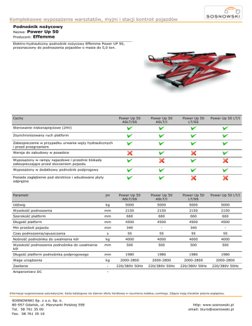 Kompleksowe wyposażenie warsztatów, myjni i stacji kontroli pojazdów Podnośnik nożycowy Nazwa: Power Up 50 Producent: Effemme Elektro-hydrauliczny podnośnik nożycowy Effemme Power UP 50, przeznaczony do podnoszenia pojazdów o masie do 5,0 ton. Cechy Power Up 50 ASLT/SS Power Up 50 ASLT/I Power Up 50 LT/SS Power Up 50 LT/I Sterowanie niskonapięciowe (24V) Zsynchronizowany ruch platform Zabezpieczenie w przypadku urwania węży hydraulicznych i przed przegrzaniem Wersja do zabudowy w posadzce Wyposażony w rampy najazdowe i przednie blokady zabezpieczające przed stoczeniem pojazdu Wyposażony w dodatkowy podnośnik podprogowy Posiada zagłębienie pod obrotnice i wbudowane płyty odprężne Parametr jm Power Up 50 ASLT/SS Power Up 50 ASLT/I Power Up 50 LT/SS Power Up 50 LT/I Udźwig kg 5000 5000 5000 5000 Wysokość podnoszenia mm 2150 2150 2150 2150 Szerokość platform mm 660 660 660 660 Długość platform mm 4500 4500 4500 4500 Min prześwit pojazdu mm 340 - 340 - s 55 55 55 55 Czas podnoszenia/opuszczania Nośność podnośnika do uwalniania kół kg 4000 4000 4000 4000 Wysokość podnoszenia podnośnika do uwalniania kół mm 500 500 500 500 Długość platform podnośnika podprogowego mm 1980 1980 1980 1980 kg 2000-2800 2000-2800 2000-2800 2000-2800 Zasilanie - 220/380V 50Hz 220/380V 50Hz 220/380V 50Hz 220/380V 50Hz Amperomierz DC - Waga urządzenia Informacja wygenerowana automatycznie. Karta katalogowa nie stanowi oferty handlowej w rozumieniu kodeksu cywilnego. Zdjęcia mają charakter jedynie poglądowy. SOSNOWSKI Sp. z o.o. Sp. k. 80-557 Gdańsk, ul. Marynarki Polskiej 55E Tel. 58 761 35 00 Fax. 58 761 35 10 http: www.sosnowski.pl email: [email protected] Kompleksowe wyposażenie warsztatów, myjni i stacji kontroli pojazdów Cechy Power Up 50 AS/SS Power Up 50 AS/I Power Up 50 N/SS Power Up 50 N/I jm Power Up 50 AS/SS Power Up 50 AS/I Power Up 50 N/SS Power Up 50 N/I Sterowanie niskonapięciowe (24V) Zsynchronizowany ruch platform Zabezpieczenie w przypadku urwania węży hydraulicznych i przed przegrzaniem Wersja do zabudowy w posadzce Wyposażony w rampy najazdowe i przednie blokady zabezpieczające przed stoczeniem pojazdu Wyposażony w dodatkowy podnośnik podprogowy Posiada zagłębienie pod obrotnice i wbudowane płyty odprężne Parametr Udźwig kg 5000 5000 5000 5000 Wysokość podnoszenia mm 2150 2150 2150 2150 Szerokość platform mm 660 660 660 660 Długość platform mm 4500 4500 4500 4500 Min prześwit pojazdu mm 340 - 340 - s 55 55 55 55 kg - - - - Wysokość podnoszenia podnośnika do uwalniania kół mm - - - - Długość platform podnośnika podprogowego mm - - - - Czas podnoszenia/opuszczania Nośność podnośnika do uwalniania kół Waga urządzenia kg 2000-2800 2000-2800 2000-2800 2000-2800 Zasilanie - 220/380V 50Hz 220/380V 50Hz 220/380V 50Hz 220/380V 50Hz Amperomierz DC - Więcej informacji u doradców techniczno - handlowych firmy SOSNOWSKI Informacja wygenerowana automatycznie. Karta katalogowa nie stanowi oferty handlowej w rozumieniu kodeksu cywilnego. Zdjęcia mają charakter jedynie poglądowy. SOSNOWSKI Sp. z o.o. Sp. k. 80-557 Gdańsk, ul. Marynarki Polskiej 55E Tel. 58 761 35 00 Fax. 58 761 35 10 Powered by TCPDF (www.tcpdf.org) http: www.sosnowski.pl email: [email protected]