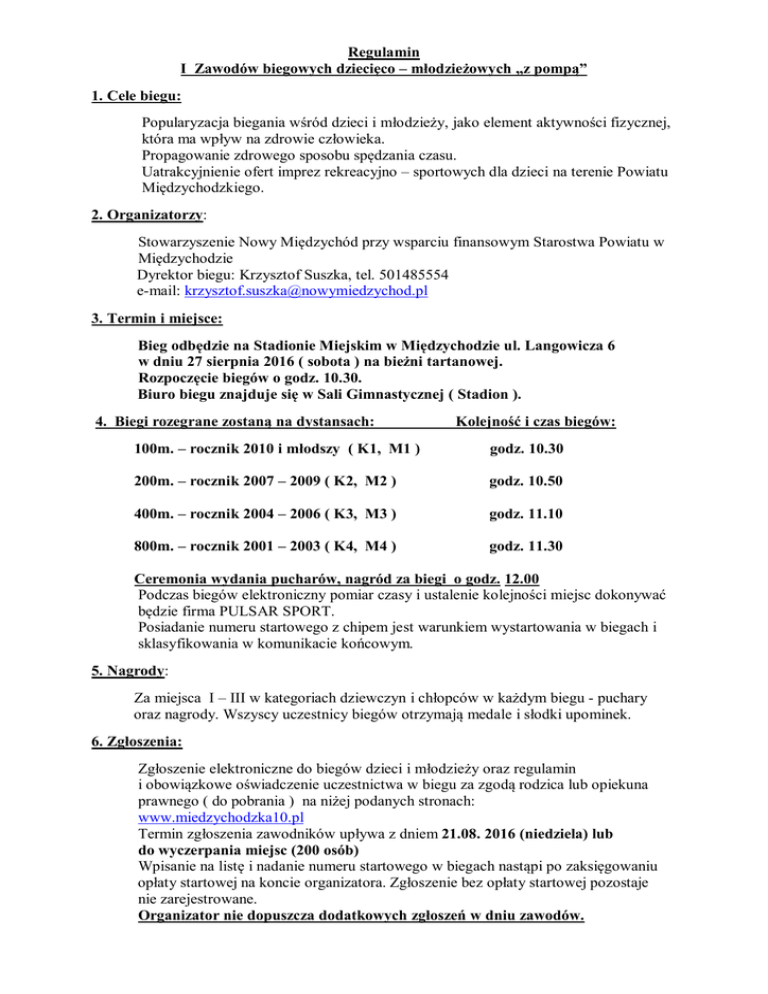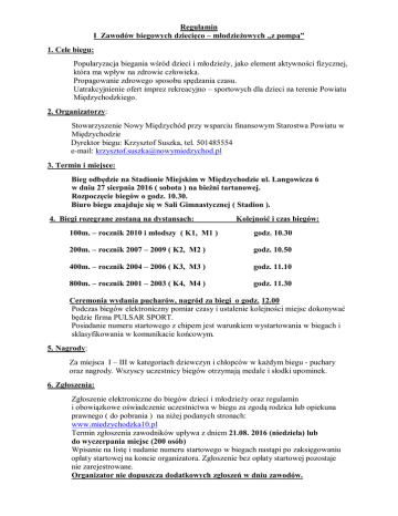 Regulamin I Zawodów biegowych dziecięco – młodzieżowych „z pompą” 1. Cele biegu: Popularyzacja biegania wśród dzieci i młodzieży, jako element aktywności fizycznej, która ma wpływ na zdrowie człowieka. Propagowanie zdrowego sposobu spędzania czasu. Uatrakcyjnienie ofert imprez rekreacyjno – sportowych dla dzieci na terenie Powiatu Międzychodzkiego. 2. Organizatorzy: Stowarzyszenie Nowy Międzychód przy wsparciu finansowym Starostwa Powiatu w Międzychodzie Dyrektor biegu: Krzysztof Suszka, tel. 501485554 e-mail: [email protected] 3. Termin i miejsce: Bieg odbędzie na Stadionie Miejskim w Międzychodzie ul. Langowicza 6 w dniu 27 sierpnia 2016 ( sobota ) na bieżni tartanowej. Rozpoczęcie biegów o godz. 10.30. Biuro biegu znajduje się w Sali Gimnastycznej ( Stadion ). 4. Biegi rozegrane zostaną na dystansach: Kolejność i czas biegów: 100m. – rocznik 2010 i młodszy ( K1, M1 ) godz. 10.30 200m. – rocznik 2007 – 2009 ( K2, M2 ) godz. 10.50 400m. – rocznik 2004 – 2006 ( K3, M3 ) godz. 11.10 800m. – rocznik 2001 – 2003 ( K4, M4 ) godz. 11.30 Ceremonia wydania pucharów, nagród za biegi o godz. 12.00 Podczas biegów elektroniczny pomiar czasy i ustalenie kolejności miejsc dokonywać będzie firma PULSAR SPORT. Posiadanie numeru startowego z chipem jest warunkiem wystartowania w biegach i sklasyfikowania w komunikacie końcowym. 5. Nagrody: Za miejsca I – III w kategoriach dziewczyn i chłopców w każdym biegu - puchary oraz nagrody. Wszyscy uczestnicy biegów otrzymają medale i słodki upominek. 6. Zgłoszenia: Zgłoszenie elektroniczne do biegów dzieci i młodzieży oraz regulamin i obowiązkowe oświadczenie uczestnictwa w biegu za zgodą rodzica lub opiekuna prawnego ( do pobrania ) na niżej podanych stronach: www.miedzychodzka10.pl Termin zgłoszenia zawodników upływa z dniem 21.08. 2016 (niedziela) lub do wyczerpania miejsc (200 osób) Wpisanie na listę i nadanie numeru startowego w biegach nastąpi po zaksięgowaniu opłaty startowej na koncie organizatora. Zgłoszenie bez opłaty startowej pozostaje nie zarejestrowane. Organizator nie dopuszcza dodatkowych zgłoszeń w dniu zawodów. - 2 7. Uczestnictwo: Weryfikacja dzieci i młodzieży odbędzie się biurze zawodów w dniu 27 sierpnia 2016 w godz. 9.30 – 10.20. W momencie weryfikacji ( obowiązuje legitymacja szkolna ) i odbioru pakietu startowego oraz podczas biegu obecność rodzica lub opiekuna prawnego jest obowiązkowa. Każdy uczestnik biegu obowiązkowo musi mieć podpisaną zgodę rodzica lub opiekuna prawnego na udział w biegach ( druk do pobrania ). Rodzice ( lub opiekunowie prawni ) biorą pełna odpowiedzialność za dziecko. 8. Opłata startowa i sprawy finansowe: Opłata startowa za bieg wynosi – 5 zł. Sposoby dokonania opłaty startowej: - przelew na konto Stowarzyszenia Nowy Międzychód nr 25 9082 0005 0391 0105 2000 0020 W tytule przelewu bankowego należy wpisać imię i nazwisko dziecka, którego opłata startowa dotyczy. Wpłacona opłata startowa nie podlega zwrotowi. 9. Postanowienia końcowe: Organizator zapewnia napoje i opiekę medyczną podczas biegu i po jego zakończeniu. Dopuszcza się bieg rodzica (opiekuna) obok dziecka (bez trzymania) tylko w najmłodszej grupie (rocznik 2010 i młodsze). Interpretacja powyższego regulaminu należy wyłącznie do organizatora biegów. Dyrektor biegu Krzysztof Suszka I ZAWODY DZIECIĘCO – MŁODZIEŻOWE Z POMPĄ 27 SIERPNIA 2016 – MIĘDZYCHÓD Oświadczenie uczestnictwa w biegu na dystansie: Płeć Dystans Rocznik Numer startowy * Wybierz z dolnej tabeli i wpisz w kratki / wypełnia organizator / Tabela biegów: Płeć K1 M1 K2 M2 K3 M3 K4 M4 Dystans 100m 100m 200m 200m 400m 400m 800m 800m Rocznik 2010 2010 2007 2007 2004 2004 2001 2001 i młodszy i młodszy 2009 2009 2006 2006 2003 2003 Nazwisko Imię (dzień) ( m-c) Data urodzenia ( rok) Wiek zawodnika (w 2016r.) Mój adres Kod: Miejscowość Reprezentuje przedszkole / szkołę Zgoda Rodzica ( opiekuna prawnego ) Wyrażam zgodę na udział w biegu ( bez badań lekarskich ) i ponoszę pełną odpowiedzialność za udział mojej córki / mojego syna w I Biegu Dziecięcym w Międzychodzie w dniu 25 czerwca 2016r. na wyżej zgłoszonym dystansie. * niepotrzebne skreślić. Czytelny podpis Rodzica Data ……………………........ (lub opiekuna prawnego) …………………………………. Tel. Rodzica / opiekuna