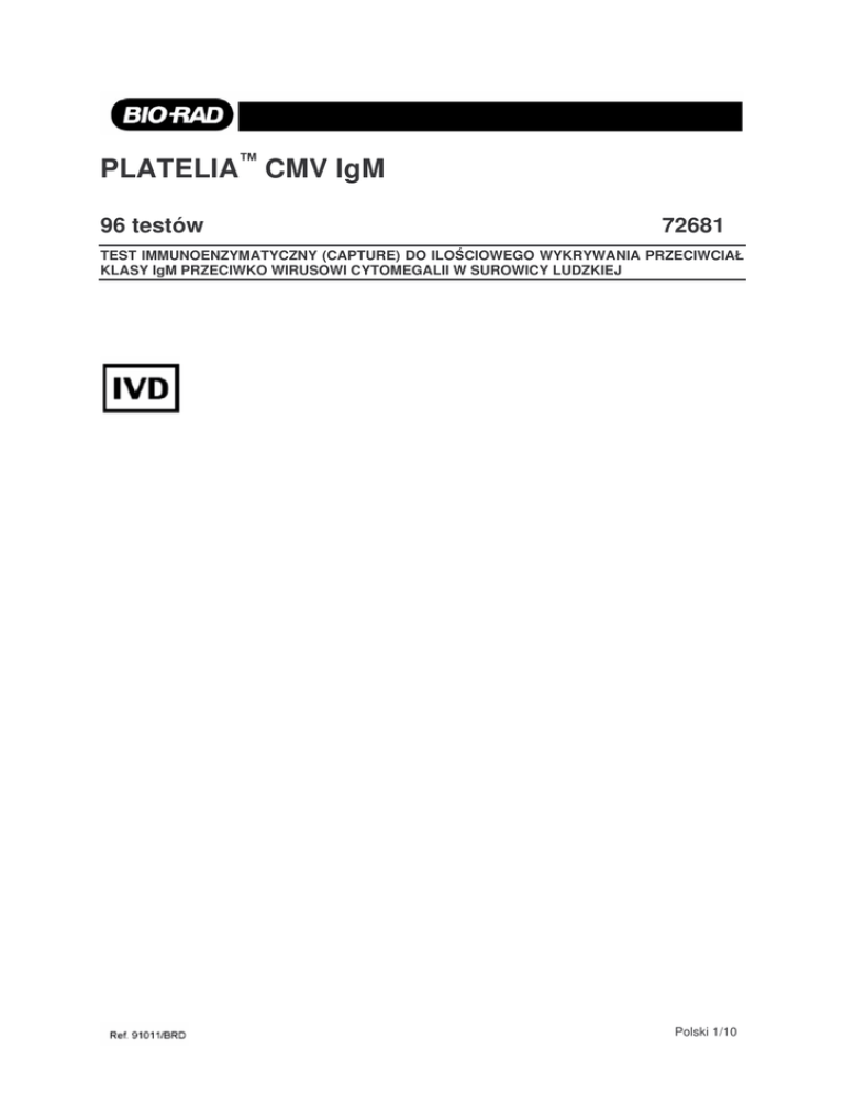 PLATELIA™ CMV IgM 96 testów 72681 TEST IMMUNOENZYMATYCZNY (CAPTURE) DO ILO CIOWEGO WYKRYWANIA PRZECIWCIAŁ KLASY IgM PRZECIWKO WIRUSOWI CYTOMEGALII W SUROWICY LUDZKIEJ Polski 1/10 SPIS TRE CI 1. ZASTOSOWANIE 2. ZNACZENIE KLINICZNE 3. ZASADA TESTU 4. SKŁAD ZESTAWU 5. PRZECHOWYWANIE I TRWAŁO ODCZYNNIKÓW 6. ZALECENIA I OSTRZE ENIA 7. PRÓBKI 8. PROCEDURA 9. SCHEMAT PROCEDURY TESTU 10. WALIDACJA TESTU 11. INTERPRETACJA WYNIKÓW 12. OGRANICZENIA METODY 13. SWOISTO 14. CZUŁO ANALITYCZNA I SWOISTO DIAGNOSTYCZNA 15. POWTARZALNO 16. ROZWI ZYWANIE PROBLEMÓW 17. LITERATURA Polski 2/10 1. ZASTOSOWANIE TEST IMMUNOENZYMATYCZNY (CAPTURE) DO ILO CIOWEGO WYKRYWANIA PRZECIWCIAŁ KLASY IgM PRZECIWKO WIRUSOWI CYTOMEGALII W SUROWICY LUDZKIEJ 2. ZNACZENIE KLINICZNE Wirus cytomegalii jest herpeswirusem przenoszonym mi dzy lud mi w trakcie bliskiego kontaktu. W wi kszo ci przypadków zaka enie jest bezobjawowe. Zaka enie CMV jest jednak e bardzo niebezpieczne i prowadzi do zgonu u pacjentów w immunosupresji. U kobiet seronegatywnych, które uległy zaka eniu podczas ci y, mo e doj do transmisji wirusa na dziecko. W 95% przypadków zaka enia to przebiega bezobjawowo, lecz u niektórych noworodków mo na zaobserwowa wyst pienie ółtaczki, hepatosplenomegali i upo ledzenie rozwoju psychoruchowego. Z tego te powodu, istotne jest okre lenie statusu immunologicznego pacjentki przed zaj ciem w ci , o ile to mo liwe, oraz kontrola serokonwersji. Wykrycie swoistych przeciwciał IgM przeciwko wirusowi CMV jest niezwykle wa ne w diagnostyce zaka enia pierwotnego. 3. ZASADA TESTU Test w kierunku przeciwciał anty-CMV klasy IgM wykorzystuje zasad wychwytu tych immunoglobulin przez monoklonalne przeciwciała przeciwko ludzkim IgM opłaszczone na fazie stałej. Kolejnym etapem jest inkubacja z antygenem wirusa cytomegalii w poł czeniu z koniugatem zawieraj cym przeciwciała monoklonalne znakowane peroksydaz , wynikiem której jest selekcja przeciwciał klasy IgM swoistych dla dodanego antygenu, uwidaczniana przez dodanie substratu dla peroksydazy. Po zatrzymaniu reakcji enzymatycznej przez dodanie roztworu kwasu siarkowego, barwa studzienek zmienia si na ółt . Nat enie barwy jest proporcjonalne do zawarto ci specyficznych przeciwciał obecnych w próbce i mo e by odczytane z u yciem czytnika mikropłytek. 4. SKŁAD ZESTAWU Odczynniki wystarczaj na 96 oznacze . Przed u yciem przenie odczynniki do temperatury pokojowej. MT PLATE MIKROPŁYTKA. 12 pasków po 8 studzienek opłaszczonych monoklonalnymi przeciwciałami przeciwko ludzkim IgM. U ycie: Opakowanie otworzy po przeciwnej stronie ni kod (M + nr serii), potrzebny do identyfikacji płytki, i wyj potrzebn ilo pasków. Pozostałe paski zamkn szczelnie w oryginalnej torebce z pochłaniaczem wilgoci, usuwaj c powietrze przed zamkni ciem. CONTROL+ KONTROLA DODATNIA (1 x 1.6 ml) Zawarto : Rozcie czona surowica ludzka (zawieraj ca przeciwciała IgM anty-CMV), w 0.01 M buforze fosforanowym + 1% BSA + 0.09% azydek sodu, płynna, gotowa do u ycia Barwa: zabarwienie kontroli jest proporcjonalne do wzgl dnego miana przeciwciał CONTROL cut-off KONTROLA DODATNIA CUT-OFF (1 x 2.5 ml) Zawarto : Rozcie czona surowica ludzka (zawieraj ca przeciwciała IgM anty-CMV), w 0.01 M buforze fosforanowym + 1% BSA + 0.09% azydek sodu, płynna, gotowa do u ycia Barwa: zabarwienie kontroli jest proporcjonalne do wzgl dnego miana przeciwciał Ag CONJ ANTYGEN Liofilizat x 6 fiolek Zawarto : Cz ciowo oczyszczony wirus cytomegalii, inaktywowany betapropiolaktonem, w buforze fosforanowym, zawieraj cym mysi płyn puchlinowy i laktoz . Przygotowanie: Zrekonstytuowa za pomoc koniugatu, dodaj c obj to podan na fiolce; wymiesza przez odwracanie. KONIUGAT (1 x 18 ml) Zawarto : Monoklonalne przeciwciała znakowane peroksydaz , w buforze fosforanowym z 0.05% fenolem i 0.02% Bronidoxem. Polski 3/10 Przygotowanie: gotowy do u ycia Kompleks immunologiczny nale y przygotowa około 45 minut przed u yciem. CONTROL IgM - KONTROLA UJEMNA (PF93900) (1 x 1.6 ml) WYMIENNA POMI DZY SERIAMI Zawarto : Rozcie czona surowica ludzka, nie zawieraj ca przeciwciał IgM anty-CMV, w 0.01 M buforze fosforanowym + 1% BSA + 0.09% azydek sodu, płynna, gotowa do u ycia WASH BUF 10x BUFOR DO PŁUKANIA (PF93603) 1 x 100 ml WYMIENNY POMI DZY SERIAMI Skład: Zbuforowana fosforanami sól fizjologiczna, st ona, zawiera 0.5% Brij Przygotowanie: Rozcie czy potrzebn ilo w stosunku 1:10 wod destylowan . W przypadku krystalizacji, przed rozcie czeniem rozpu ci osad w temp. 37°C. SAMP DIL ROZCIE CZALNIK 2 (PF93611) 1 x 100 ml. Do rozcie czania próbek. Gotowy do u ycia WYMIENNY POMI DZY SERIAMI Zawarto : Roztwór białkowy w buforze fosforanowym, zawiera 0.09% azydek sodu oraz oran metylu jako barwnik SUBS TMB SUBSTRAT (PF93619) 15 ml. Gotowy do u ycia. WYMIENNY POMI DZY SERIAMI Zawarto : Czterometylobenzydyna (0.26mg/ml) i 0.01% nadtlenek wodoru, stabilizowana w 0.05 M buforze cytrynianowym (pH 3.8). H2SO4 0.3 M ROZTWÓR ZATRZYMUJ CY (PF93602) 1 x 16 ml. WYMIENNY POMI DZY SERIAMI 0.3 M kwas siarkowy (H2SO4) gotowy do u ycia. FOLIA ADHEZYJNA (2) TOREBKA POLIETYLENOWA (1) INNE NIEZB DNE MATERIAŁY I SPRZ T − Cieplarka ustawiona na 37°C − Czytnik mikropłytek (długo fali 450 lub 450/620 nm, odczyt liniowy do OD 2000). − Płuczka mikropłytek (preferencyjnie) pobieraj ca obj to w zakresie 225-375 µl. − Jałowa woda destylowana lub dejonizowana − Szkło laboratoryjne: cylindry miarowe, próbówki, itp. − Pipety pobieraj ce 10 µl, 100 µl i 1000 µl. − R kawiczki jednorazowe − Timer − 5% Podchloryn sodu (wybielacz) − Pojemnik na materiał zaka ny i zanieczyszczone odpady − Bibuła 5. PRZECHOWYWANIE I TRWAŁO ODCZYNNIKÓW Odczynniki nale y przechowywa w temp. 2-8°C. Data wa no ci podana jest na etykiecie ka dego odczynnika i na opakowaniu zewn trznym. Po otwarciu/rekonstytucji odczynniki posiadaj ograniczon trwało ODCZYNNIK WARUNKI PRZECHOWYWANIA Mikropłytka 5 tygodni w temp. 2-8°C w torebce polietylenowej Kontrole 