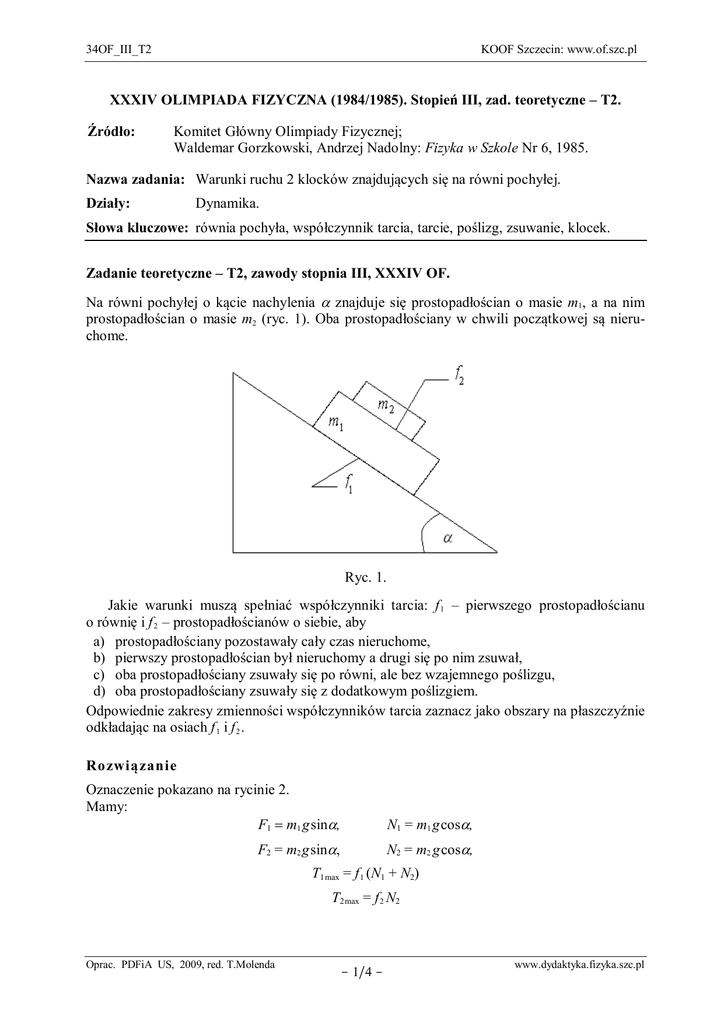 34OF_III_T2 KOOF Szczecin: www.of.szc.pl XXXIV OLIMPIADA FIZYCZNA (1984/1985). Stopień III, zad. teoretyczne – T2. Źródło: Komitet Główny Olimpiady Fizycznej; Waldemar Gorzkowski, Andrzej Nadolny: Fizyka w Szkole Nr 6, 1985. Nazwa zadania: Warunki ruchu 2 klocków znajdujących się na równi pochyłej. Działy: Dynamika. Słowa kluczowe: równia pochyła, współczynnik tarcia, tarcie, poślizg, zsuwanie, klocek. Zadanie teoretyczne – T2, zawody stopnia III, XXXIV OF. Na równi pochyłej o kącie nachylenia α znajduje się prostopadłościan o masie m1, a na nim prostopadłościan o masie m2 (ryc. 1). Oba prostopadłościany w chwili początkowej są nieruchome. Ryc. 1. Jakie warunki muszą spełniać współczynniki tarcia: f 1 – pierwszego prostopadłościanu o równię i f 2 – prostopadłościanów o siebie, aby a) prostopadłościany pozostawały cały czas nieruchome, b) pierwszy prostopadłościan był nieruchomy a drugi się po nim zsuwał, c) oba prostopadłościany zsuwały się po równi, ale bez wzajemnego poślizgu, d) oba prostopadłościany zsuwały się z dodatkowym poślizgiem. Odpowiednie zakresy zmienności współczynników tarcia zaznacz jako obszary na płaszczyźnie odkładając na osiach f 1 i f 2 . Ro zwią zanie Oznaczenie pokazano na rycinie 2. Mamy: F1 = m1 g sinα, N1 = m1 g cosα, F2 = m2 g sinα, N2 = m2 g cosα, T1max = f 1 (N1 + N2) T2max = f 2 N2 Oprac. PDFiA US, 2009, red. T.Molenda - 1/4 - www.dydaktyka.fizyka.szc.pl 34OF_III_T2 KOOF Szczecin: www.of.szc.pl Ryc. 2. Znaczek max oznacza, że chodzi o maksymalną wartość odpowiedniej siły tarcia. Rozpatrzmy teraz poszczególne przypadki: Przypadek a. (Oba ciała spoczywają) Górny klocek nie porusza się przy spoczywającym dolnym wtedy, gdy T2max ≥ F2 czyli gdy f 2 ≥ tgα. (1) Cały zaś układ nie porusza się względem równi gdy T1 max ≥ F1 + F2, skąd f 1 ≥ tgα. (2) Warunki (1) i (2) na wykresie pokazanym na ryc. 3 wyznaczają obszar oznaczony literą a. Przypadek b. (Dolny klocek spoczywa, górny się zsuwa) Warunek na zsuwanie się górnego klocka jest następujący (wtedy t2 = t2 max): m2 g sinα = F2 > T2max = f 2 m2 g cosα czyli f 2 < tgα (3) Warunkiem na spoczywanie dolnego klocka jest by siła wypadkowa styczna do równi była równa zeru: F1 + T2max – T1 = 0. Stąd T1 = F1 + T2max , ale T1 ≤ T1max , zatem f 1 (m1 + m2) g cosα ≥ m1 g sinα + f 2 m2 g cosα , Oprac. PDFiA US, 2009, red. T.Molenda - 2/4 - www.dydaktyka.fizyka.szc.pl 34OF_III_T2 KOOF Szczecin: www.of.szc.pl f1 ≥ m1 m2 tgα + f2 . m1 + m2 m1 + m2 (4) Warunki (3) i (4) na wykresie z rys. 3 wyznaczają obszar zaznaczony literą b. Przypadek c. (Obydwa prostopadłościany zsuwają się bez wzajemnego poślizgu) Warunek na zsuwanie się obu prostopadłościanów po równi (jakby tworzyły jedno ciało) jest następujący F1 + F2 > T1max, Skąd f 1 < tgα. (5) Zsuwające się ciała mają jednakowe przyspieszenie względem równi, przy czym T1 = T1max. Wobec tego F1 + T2 − T1 max F2 − T2 . = m1 m2 Stąd wyznaczymy T2: T2 = m1 m2 m1 + m2 F2 F1 T1 max . − + m1 m2 m1 Ale T2 ≤ T2max, a więc f 2 m2 g cos α ≥ skąd m1m2 m +m g sin α − g sin α + f1 1 2 cos α m1 m1 f2 ≥ f1 , (6) Warunki (5) i (6) na rycinie 3 wyznaczają obszar oznaczony literą c. Ryc. 3. Oprac. PDFiA US, 2009, red. T.Molenda - 3/4 - www.dydaktyka.fizyka.szc.pl 34OF_III_T2 KOOF Szczecin: www.of.szc.pl Przypadek d. (Klocki zsuwają się z wzajemnym poślizgiem) Przypadek ten można rozpatrywać podobnie jak poprzednie, ale można się obejść bez obliczeń. Wystarczy zauważyć, że przypadek ten zachodzi wtedy, gdy nie zachodzi żaden z przypadków przeanalizowanych do tej pory, a więc gdy: f2 < f1 f1 < m1 m2 tgα + f2 . m1 + m2 m1 + m2 (7) (8) Warunki te wyznaczają na rycinie 3 obszar oznaczony literą d. Proponowana punktacja 1. Prawidłowe przeanalizowanie i rozpatrzenie przypadku a. 2. Prawidłowe przeanalizowanie i rozpatrzenie przypadku b. 3. Prawidłowe przeanalizowanie i rozpatrzenie przypadku c. 4. Prawidłowe przeanalizowanie i rozpatrzenie przypadku d. 5. Wykonanie diagramu z zakresami zmienności współczynników tarcia dla poszczególnych podpunktów (ryc. 3). do 2 pkt. do 2 pkt. do 2 pkt. do 2 pkt. do 2 pkt. Uwagi Zadanie powyższe było oceniane w ten sposób, że za każde z przypadków a – d przyznawano do 2 punktów. Pozostałe do dziesięciu dwa punkty przyznawano za zrobienie diagramu pokazanego na rycinie 3. Powyżej połowy punktów możliwych do zdobycia za to zadanie zdobyła około połowa zawodników (podobnie jak w poprzednim zadaniu). W rozwiązaniach sporo było błędów rachunkowych i logicznych. Dosyć duża część zawodników nie zrobiła diagramu mimo poprawnej analizy wszystkich przypadków. Najbardziej rażącym błędem, popełnionym przez część zawodników, było wpisywanie równań ruchu dla obu klocków w postaci: m1 a1 = F1 + T2max – T1max , m2 a2 = F2 – T2max , gdzie a1 i a2 oznaczają skierowane ku podstawie równi przyspieszenia odpowiednich klocków. Taka forma równań ruch na ogół jest niepoprawna. Tylko bowiem w ostatnim przypadku siły tarcia T1 i T2 osiągają (obie) swe maksymalne wartości. W ogólnym przypadku do równań ruchu nie można od razu maksymalnej siły tarcia bo prowadzi to do niedorzeczności. Na przykład w przypadku a drugie równanie po wstawieniu odpowiednich wyrażeń na F2 i T2max daje m2 a2 = m2 g sin α – f 2 m2 g cos α czyli a2 = g cos α (tgα – f 2 ). Widać, że dla dostatecznie małych kątów α (a konkretnie takich, że tgα < f 2), klocek o masie m2 doznawał by przyspieszenia „w górę” równi, co jest niezgodne z prawami fizyki i ze zdrowym rozsądkiem. Oczywiście przyczyną tej niedorzeczności jest przyjęcie, że siła tarcia cały czas ma wartość maksymalną równą iloczynowi współczynnika tarcia i siły nacisku. Oprac. PDFiA US, 2009, red. T.Molenda - 4/4 - www.dydaktyka.fizyka.szc.pl