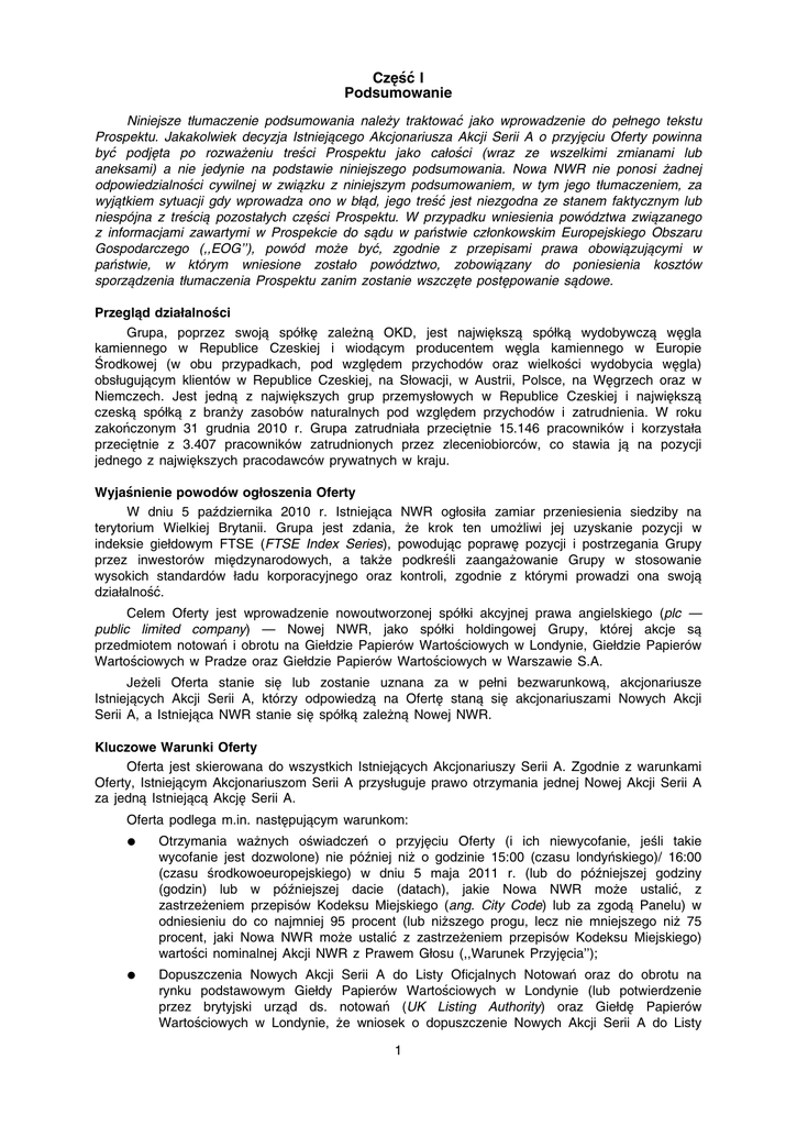 Proof2:11.4.11 Cze˛ść I Podsumowanie Niniejsze tłumaczenie podsumowania należy traktować jako wprowadzenie do pełnego tekstu Prospektu. Jakakolwiek decyzja Istnieja˛cego Akcjonariusza Akcji Serii A o przyje˛ciu Oferty powinna być podje˛ta po rozważeniu treści Prospektu jako całości (wraz ze wszelkimi zmianami lub aneksami) a nie jedynie na podstawie niniejszego podsumowania. Nowa NWR nie ponosi żadnej odpowiedzialności cywilnej w zwia˛zku z niniejszym podsumowaniem, w tym jego tłumaczeniem, za wyja˛tkiem sytuacji gdy wprowadza ono w bła˛d, jego treść jest niezgodna ze stanem faktycznym lub niespójna z treścia˛ pozostałych cze˛ści Prospektu. W przypadku wniesienia powództwa zwia˛zanego z informacjami zawartymi w Prospekcie do sa˛du w państwie członkowskim Europejskiego Obszaru Gospodarczego (,,EOG’’), powód może być, zgodnie z przepisami prawa obowia˛zuja˛cymi w państwie, w którym wniesione zostało powództwo, zobowia˛zany do poniesienia kosztów sporza˛dzenia tłumaczenia Prospektu zanim zostanie wszcze˛te poste˛powanie sa˛dowe. Przegla˛d działalności Grupa, poprzez swoja˛ spółke˛ zależna˛ OKD, jest najwie˛ksza˛ spółka˛ wydobywcza˛ we˛gla kamiennego w Republice Czeskiej i wioda˛cym producentem we˛gla kamiennego w Europie Środkowej (w obu przypadkach, pod wzgle˛dem przychodów oraz wielkości wydobycia we˛gla) obsługuja˛cym klientów w Republice Czeskiej, na Słowacji, w Austrii, Polsce, na We˛grzech oraz w Niemczech. Jest jedna˛ z najwie˛kszych grup przemysłowych w Republice Czeskiej i najwie˛ksza˛ czeska˛ spółka˛ z branży zasobów naturalnych pod wzgle˛dem przychodów i zatrudnienia. W roku zakończonym 31 grudnia 2010 r. Grupa zatrudniała przecie˛tnie 15.146 pracowników i korzystała przecie˛tnie z 3.407 pracowników zatrudnionych przez zleceniobiorców, co stawia ja˛ na pozycji jednego z najwie˛kszych pracodawców prywatnych w kraju. Wyjaśnienie powodów ogłoszenia Oferty W dniu 5 października 2010 r. Istnieja˛ca NWR ogłosiła zamiar przeniesienia siedziby na terytorium Wielkiej Brytanii. Grupa jest zdania, że krok ten umożliwi jej uzyskanie pozycji w indeksie giełdowym FTSE (FTSE Index Series), powoduja˛c poprawe˛ pozycji i postrzegania Grupy przez inwestorów mie˛dzynarodowych, a także podkreśli zaangażowanie Grupy w stosowanie wysokich standardów ładu korporacyjnego oraz kontroli, zgodnie z którymi prowadzi ona swoja˛ działalność. Celem Oferty jest wprowadzenie nowoutworzonej spółki akcyjnej prawa angielskiego (plc — public limited company) — Nowej NWR, jako spółki holdingowej Grupy, której akcje sa˛ przedmiotem notowań i obrotu na Giełdzie Papierów Wartościowych w Londynie, Giełdzie Papierów Wartościowych w Pradze oraz Giełdzie Papierów Wartościowych w Warszawie S.A. Jeżeli Oferta stanie sie˛ lub zostanie uznana za w pełni bezwarunkowa˛, akcjonariusze Istnieja˛cych Akcji Serii A, którzy odpowiedza˛ na Oferte˛ stana˛ sie˛ akcjonariuszami Nowych Akcji Serii A, a Istnieja˛ca NWR stanie sie˛ spółka˛ zależna˛ Nowej NWR. Kluczowe Warunki Oferty Oferta jest skierowana do wszystkich Istnieja˛cych Akcjonariuszy Serii A. Zgodnie z warunkami Oferty, Istnieja˛cym Akcjonariuszom Serii A przysługuje prawo otrzymania jednej Nowej Akcji Serii A za jedna˛ Istnieja˛ca˛ Akcje˛ Serii A. Oferta podlega m.in. naste˛puja˛cym warunkom: * Otrzymania ważnych oświadczeń o przyje˛ciu Oferty (i ich niewycofanie, jeśli takie wycofanie jest dozwolone) nie później niż o godzinie 15:00 (czasu londyńskiego)/ 16:00 (czasu środkowoeuropejskiego) w dniu 5 maja 2011 r. (lub do późniejszej godziny (godzin) lub w późniejszej dacie (datach), jakie Nowa NWR może ustalić, z zastrzeżeniem przepisów Kodeksu Miejskiego (ang. City Code) lub za zgoda˛ Panelu) w odniesieniu do co najmniej 95 procent (lub niższego progu, lecz nie mniejszego niż 75 procent, jaki Nowa NWR może ustalić z zastrzeżeniem przepisów Kodeksu Miejskiego) wartości nominalnej Akcji NWR z Prawem Głosu (,,Warunek Przyje˛cia’’); * Dopuszczenia Nowych Akcji Serii A do Listy Oficjalnych Notowań oraz do obrotu na rynku podstawowym Giełdy Papierów Wartościowych w Londynie (lub potwierdzenie przez brytyjski urza˛d ds. notowań (UK Listing Authority) oraz Giełde˛ Papierów Wartościowych w Londynie, że wniosek o dopuszczenie Nowych Akcji Serii A do Listy c104601pu010Proof1:11.4.11B/LRevision:0OperatorDavS 1 Oficjalnych Notowań oraz do obrotu na rynku podstawowym Giełdy Papierów Wartościowych w Londynie został rozpatrzony pozytywnie (i niewycofanie takiego potwierdzenia)), warunkowego dopuszczenia Nowych Akcji Serii A do obrotu na Rynku Podstawowym Giełdy Papierów Wartościowych w Pradze oraz podje˛cia przez zarza˛d Giełdy Papierów Wartościowych w Warszawie S.A. uchwały w sprawie warunkowego dopuszczenia Nowych Akcji Serii A do obrotu na rynku podstawowym Giełdy Papierów Wartościowych w Warszawie S.A. (z zastrzeżeniem oświadczenia przez Nowa˛ NWR, że emisja Nowych Akcji Serii A doszła do skutku), które to dopuszczenie stanie sie˛ skuteczne po podje˛ciu przez zarza˛d Giełdy Papierów Wartościowych w Warszawie S.A. uchwały o wprowadzeniu Nowych Akcji A do obrotu na rynku podstawowym prowadzonym przez Giełde˛ Papierów Wartościowych w Warszawie S.A.; oraz * Niektórym innym warunkom przyje˛tym dla Ofert tego rodzaju. Istnieja˛ce Akcje Serii A, w odniesieniu do których Oferta zostanie przyje˛ta, zostana˛ nabyte przez Nowa˛ NWR w ramach Oferty, przy czym be˛da˛ one w pełni opłacone oraz wolne od wszelkich obcia˛żeń, zobowia˛zań, opcji, praw poboru oraz wszelkich innych praw osób trzecich jakiegokolwiek rodzaju i zostana˛ nabyte wraz ze wszystkimi wynikaja˛cymi z nich lub zwia˛zanymi z nimi obecnie lub w przyszłości prawami, w szczególności wraz z prawami głosu oraz prawami do otrzymania i zatrzymania pełnej kwoty dywidend