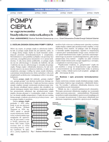 pompy ciepła pompy ciepła pompy ciepła pompy ciepła POMPY CIEPŁA w ogrzewaniu (2) budynków mieszkalnych Piotr JASIUKIEWICZ, Budrus Technika Grzewcza sp. z o.o., Dział Odnawialne Źródła Energii Oddział Gdańsk 2. OGÓLNA ZASADA DZIAŁANIA POMPY CIEPŁA możliwe było wówczas wytłumaczenie zjawiska wymiany ciepła między ciałami jako przekazywanie cieplika, a więc określonej ilości materii, od jednego ciała do drugiego, w kierunku spadku temperatury. Zgodnie ze znajomością i opisem praw termodynamiki owego czasu, również Kelwin opisał transformowanie ciepła z poziomu niskotemperaturowego na poziom wysokotemperaturowy, jako proces pompowania owej materii – cieplika (za jakie uważano ciepło) dzięki dostarczeniu energii napędowej z zewnątrz, a urządzenie to nazwał pompą ciepła. Współcześnie wiadomo, że „pompowanie” ciepła nie jest możliwe z uwagi na bezpostaciowy jego charakter, w przeciwieństwie np. do pompowania wody za pomocą pompy wodnej. Jednak nazwa tych urządzeń – pompa ciepła – obowiązuje do dziś. Mówi się często, że pompa ciepła to odwrócona lodówka lub, że pompa ciepła działa tak jak lodówka, tylko, że w drugą stronę (mając chyba na myśli kierunek zachodzących przemian termodynamicznych w urządzeniu). Stwierdzenia te i tym podobne są błędne i nie powinny być cytowane, szczególnie przez inżynierów i to w prasie technicznej. Z całą mocą należy podkreślić, ze pompa ciepła nie ma nic odwróconego w stosunku do lodówki, tak jak i lodówka nie ma nic odwróconego w stosunku do pompy ciepła. Pompa ciepła i chłodziarka domowa, bo tak technicznie nazywa się nasza domowa lodówka, to takie same urządzenia, pracujące według tej samej zasady działania, a przemiany termodynamiczne, które zachodzą w obu tych urządzeniach są identyczne i następują po sobie w tej samej 2.1. Budowa i opis procesów termodynamiczkolejności. Nazwa pompa ciepła lub niekiedy „pompa cieplna” nych czy „pompa grzejna” jest skrótem myślowym, którego nie Zanim omówiona zostanie zasada działania pompy ciepła, należy odczytywać dosłownie. Ciepło jest bowiem częścią porównajmy budowę tego urządzenia i chłodziarki domoenergii cieplnej (energii termicznej) przekazywanej mię- wej. Na rysunku 1 pokazano chłodziarkę domową wraz dzy dwoma ośrodkami (przez granice obu ośrodków) na z jej podstawowymi elementami. Składa się ona z czterech podstawowych elementów. skutek istniejącej między nimi różnicy temperatur, jednak Wewnątrz przestrzeni chłodzonej znajduje się wymiennik bez przenoszenia substancji (np. przekazywanie ciepła ciepła nazywany potocznie – zamrażalnikiem. Wymiennik między dwoma płynami w wymienniku ciepła w kierunten pobiera ciepło od produktów spożywczych znajdujących ku i na skutek spadku temperatury). Ciepło nie jest osobną się wewnątrz tej przestrzeni. Celem pracy chłodziarki jest formą energii, a jedynie sposobem jej przekazywania – jest obniżenie temperatury produktów spożywczych znajdująto energia cieplna w przejściu. Nazwa pompa ciepła pochodzi z 1852 roku, kiedy to po raz pierwszy Lord Kelwin (Wiliam Thomson ur. 1824, zm. 1907) opisał w sposób czysto teoretyczny możliwości wykorzystania tego urządzenia do ogrzewania. W tym czasie, a więc w XVIII i pierwszej połowie XIX wieku ciepło uważane było za rodzaj nieważkiej materii – zwanej cieplikiem. W oparciu o „teorię cieplikową” Rys. 1. Budowa chłodziarki domowej 492 technika chłodnicza i klimatyzacyjna 12/2007 pompy ciepła pompy ciepła pompy ciepła pompy ciepła cych się w jej wnętrzu lub zamrożenie tych, które znajdują się w zamrażalniku. Z uwagi na to, proces pobierania ciepła z przestrzeni chłodzonej zachodzi przy niskiej temperaturze powietrza i znajdujących się w niej produktów. Wymiennik ten wykonany jest najczęściej jako pojemnik aluminiowy (w obecnie budowanych chłodziarkach, schowany jest on za tylnią ścianą komory). Na zewnątrz, w tylnej części urząRys. 2. Budowa pompy ciepła Logatherm firmy Buderus dzenia znajdują się: skraplacz, wymiennik ciepła wykonany jako czarna rur- nie wyższej temperaturze. Pompa ciepła, jako urządzenie chłodnicze posiada te ka, często z przylutowanymi pręcikami lub blaszkami dla zwiększenia jego powierzchni wymiany ciepła. Ponadto same elementy, lecz o nieco innej konstrukcji. Na rysunku chłodziarka wyposażona jest w: sprężarkę hermetyczną, 2 pokazano budowę pompy ciepła Logatherm firmy Budeczęsto nazywaną agregatem lub kompresorem. Ostatnim rus. Urządzenie to, w swojej dolnej części posiada wszystelementem jest rurka kapilarna. Te cztery elementy, odpowiednio połączone przewodami, stanowią obieg chłodni- kie elementy stanowiące jej obieg chłodniczy, i tak są to: dwa wymienniki ciepła, parownik i skraplacz o budowie czy chłodziarki domowej. Zasada działania i cel pracy tego urządzenia jest ogólnie wymienników płytowych lutowanych. Zastosowanie wyznany. Jego zadaniem jest obniżanie temperatury produk- mienników płytowych jest konieczne z uwagi na fakt, że tów spożywczych znajdujących się wewnątrz przestrzeni procesy wymiany ciepła zachodzą pomiędzy czynnikiem chłodzonej znacznie poniżej temperatury otoczenia, przeciętnie jest to wartość +5°C lub –18°C przy zamrażaniu. Obieg chłodniczy lodówki pobiera energię cieplną z powietrza znajdującego się w przestrzeni chłodzonej, a zatem pośrednio od produktów spożywczych i poprzez zachodzące po sobie przemiany termodynamiczne niskowrzącego płynu roboczego, przekazuje to ciepło do powietrza otaczającego urządzenie, najczęściej do pomieszczenia kuch- Rys. 3. Schemat ideowy pompy ciepła wraz z obiegiem grzewczym budynku i obiegiem dolnego źródła ciepła ni, ale już przy znacztechnika chłodnicza i klimatyzacyjna 12/2007 493 pompy ciepła pompy ciepła chłodniczym a nośnikiem ciepła źródła d