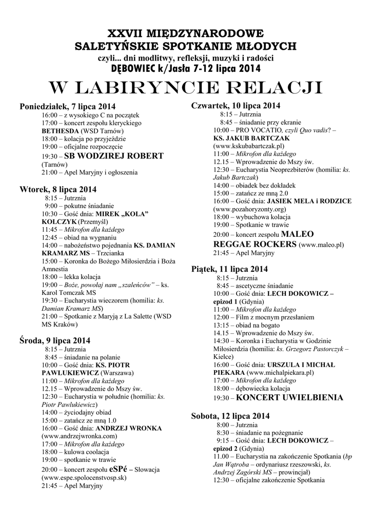 XXVII MIĘDZYNARODOWE SALETYŃSKIE SPOTKANIE MŁODYCH czyli... dni modlitwy, refleksji, muzyki i radości DĘBOWIEC k/Jasła 7-12 lipca 2014 W Labiryncie Relacji Poniedziałek, 7 lipca 2014 16:00 – z wysokiego C na początek 17:00 – koncert zespołu kleryckiego BETHESDA (WSD Tarnów) 18:00 – kolacja po przyjeździe 19:00 – oficjalne rozpoczęcie 19:30 – SB WODZIREJ ROBERT (Tarnów) 21:00 – Apel Maryjny i ogłoszenia Wtorek, 8 lipca 2014 8:15 – Jutrznia 9:00 – pokutne śniadanie 10:30 – Gość dnia: MIREK „KOLA” KOLCZYK (Przemyśl) 11:45 – Mikrofon dla każdego 12:45 – obiad na wygnaniu 14:00 – nabożeństwo pojednania KS. DAMIAN KRAMARZ MS – Trzcianka 15:00 – Koronka do Bożego Miłosierdzia i Boża Amnestia 18:00 – lekka kolacja 19:00 – Boże, powołaj nam „szaleńców” – ks. Karol Tomczak MS 19:30 – Eucharystia wieczorem (homilia: ks. Damian Kramarz MS) 21:00 – Spotkanie z Maryją z La Salette (WSD MS Kraków) Środa, 9 lipca 2014 8:15 – Jutrznia 8:45 – śniadanie na polanie 10:00 – Gość dnia: KS. PIOTR PAWLUKIEWICZ (Warszawa) 11:00 – Mikrofon dla każdego 12.15 – Wprowadzenie do Mszy św. 12:30 – Eucharystia w południe (homilia: ks. Piotr Pawlukiewicz) 14:00 – życiodajny obiad 15:00 – zatańcz ze mną 1.0 16:00 – Gość dnia: ANDRZEJ WRONKA (www.andrzejwronka.com) 17:00 – Mikrofon dla każdego 18:00 – kulowa coolacja 19:00 – spotkanie w trawie 20:00 – koncert zespołu eSPé – Słowacja (www.espe.spolocenstvosp.sk) 21:45 – Apel Maryjny Czwartek, 10 lipca 2014 8:15 – Jutrznia 8:45 – śniadanie przy ekranie 10:00 – PRO VOCATIO, czyli Quo vadis? – KS. JAKUB BARTCZAK (www.kskubabartczak.pl) 11:00 – Mikrofon dla każdego 12.15 – Wprowadzenie do Mszy św. 12:30 – Eucharystia Neoprezbiterów (homilia: ks. Jakub Bartczak) 14:00 – obiadek bez dokładek 15:00 – zatańcz ze mną 2.0 16:00 – Gość dnia: JASIEK MELA i RODZICE (www.pozahoryzonty.org) 18:00 – wybuchowa kolacja 19:00 – Spotkanie w trawie 20:00 – koncert zespołu MALEO REGGAE ROCKERS (www.maleo.pl) 21:45 – Apel Maryjny Piątek, 11 lipca 2014 8:15 – Jutrznia 8:45 – ascetyczne śniadanie 10:00 – Gość dnia: LECH DOKOWICZ – epizod 1 (Gdynia) 11:00 – Mikrofon dla każdego 12:00 – Film z mocnym przesłaniem 13:15 – obiad na bogato 14.15 – Wprowadzenie do Mszy św. 14:30 – Koronka i Eucharystia w Godzinie Miłosierdzia (homilia: ks. Grzegorz Pastorczyk – Kielce) 16:00 – Gość dnia: URSZULA I MICHAŁ PIEKARA (www.michalpiekara.pl) 17:00 – Mikrofon dla każdego 18:00 – dębowiecka kolacja 19:30 – KONCERT UWIELBIENIA Sobota, 12 lipca 2014 8:00 – Jutrznia 8:30 – śniadanie na pożegnanie 9:15 – Gość dnia: LECH DOKOWICZ – epizod 2 (Gdynia) 11.00 – Eucharystia na zakończenie Spotkania (bp Jan Wątroba – ordynariusz rzeszowski, ks. Andrzej Zagórski MS – prowincjał) 12:30 – oficjalne zakończenie Spotkania