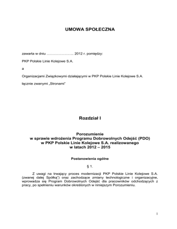UMOWA SPOŁECZNA zawarta w dniu ………………….. 2012 r. pomiędzy: PKP Polskie Linie Kolejowe S.A. a Organizacjami Związkowymi działającymi w PKP Polskie Linie Kolejowe S.A. łącznie zwanymi „Stronami” Rozdział I Porozumienie w sprawie wdrożenia Programu Dobrowolnych Odejść (PDO) w PKP Polskie Linie Kolejowe S.A. realizowanego w latach 2012 – 2015 Postanowienia ogólne § 1. Z uwagi na trwający proces modernizacji PKP Polskie Linie Kolejowe S.A. (zwanej dalej Spółką”) oraz zachodzące zmiany technologiczne i organizacyjne, wprowadza się Program Dobrowolnych Odejść dla pracowników odchodzących z pracy, po spełnieniu warunków określonych w niniejszym Porozumieniu. 1 Cel Programu Dobrowolnych Odejść § 2. 1. Mając na uwadze zminimalizowanie negatywnych skutków społecznych towarzyszących trwającym zmianom technologicznym i organizacyjnym w Spółce, Strony Porozumienia wprowadzają Program Dobrowolnych Odejść, jako program zachęt finansowych dla pracowników spełniających warunki wymagane do nabycia prawa do świadczeń emerytalnych lub odchodzących z pracy wskutek wspomnianych zmian, którzy będą zainteresowani rozwiązaniem umowy o pracę na mocy porozumienia stron. 2. Nabycie prawa do świadczenia emerytalnego, o którym mowa w ust. 1, oznacza spełnienie ustawowych warunków wymaganych do uzyskania świadczenia emerytalnego z Funduszu Ubezpieczeń Społecznych (w tym także tzw. „wcześniejszej emerytury”) lub z Funduszu Emerytur Pomostowych. 3. Program Dobrowolnych Odejść zakłada utworzenie rezerwy finansowej na wypłaty rekompensat finansowych w latach 2012 – 2015 dla maksymalnie 4.500 pracowników, w tym w 2012 r. dla maksymalnie 1.000 pracowników. 4. Maksymalną liczbę pracowników (w zespołach), planowaną do objęcia Programem Dobrowolnych Odejść w PKP Polskie Linie Kolejowe S.A. w 2012 r., określa Załącznik Nr 1 do niniejszego Porozumienia. 5. Niezależnie od ustaleń niniejszego Porozumienia, o zamiarze likwidacji jednostki organizacyjnej, komórki lub posterunku, pracodawca powiadomi co najmniej na 30 dni przed realizacją tego zamiaru - organizacje związkowe, wraz z uzasadnieniem techniczno-ekonomicznym tej decyzji oraz jej skutków dla pracowników. Zakres podmiotowy Programu § 3. 1. Program Dobrowolnych Odejść dotyczy wszystkich pracowników Spółki spełniających kryteria przewidziane w Programie i zatrudnionych na podstawie umowy o pracę na czas nieokreślony w dniu rozpoczęcia obowiązywania Programu, tj. 30 czerwca 2012 r. 2. Przystąpienie Pracownika do Programu jest dobrowolne, a rozwiązanie umowy o pracę następuje w trybie porozumienia stron z przyczyn niedotyczących pracowników, zgodnie z warunkami przewidzianymi przez Program Dobrowolnych Odejść. 3. Pracownicy nieposiadający prawa do świadczenia emerytalnego, zatrudnieni na stanowiskach pracy, które nie będą podlegać odtworzeniu, w pierwszej kolejności objęci będą procesem przekwalifikowania na wolne stanowiska pracy w Spółce. 4. Warunek udziału w PDO, jakim jest nieodtworzenie stanowiska pracy po odejściu pracownika jest spełniony także wtedy, gdy inny pracownik PKP PLK S.A. przechodzi na to stanowisko po przeszkoleniu w ramach rekrutacji 2 wewnętrznej, ale zasada zmniejszenia zatrudnienia w macierzystej jednostce organizacyjnej jest utrzymana. § 4. Zasady Programu Dobrowolnych Odejść nie mają zastosowania w przypadku rozwiązania umowy o pracę w trybie wypowiedzenia z przyczyn dotyczących i niedotyczących pracownika, a także rozwiązania umowy o pracę w trybie art. 52 Kodeksu pracy, rozwiązania umowy o pracę z upływem okresu, na jaki była zawarta oraz wygaśnięcia stosunku pracy. Zakres czasowy Programu § 5. Program Dobrowolnych Odejść wchodzi w życie z dniem 30.06.2012 r. i obowiązuje do 31 grudnia 2015 r. Procedura zawierania porozumienia w sprawie rozwiązania umowy o pracę § 6. 1. Pracownik zainteresowany rozwiązaniem umowy o pracę na mocy porozumienia stron w ramach Programu Dobrowolnych Odejść, składa wniosek o rozwiązanie umowy o pracę, zgodnie ze wzorem określonym w Załączniku Nr 2 do niniejszego Porozumienia. 2. Wniosek o rozwiązanie umowy o pracę w ramach Programu Dobrowolnych Odejść należy składać w komórce organizacyjnej ds. pracowniczych macierzystej jednostki organizacyjnej pracownika. Pracownicy zatrudnieni w terenowych komórkach organizacyjnych (sekcje, ekspozytury, komendy regionalne SOK itp.) wnioski o rozwiązanie umowy o pracę w ramach PDO mogą składać u kierownika macierzystej komórki organizacyjnej, który przekazuje je następnie do komórki organizacyjnej ds. pracowniczych celem zaopiniowania przez kierownika jednostki organizacyjnej. 3. Wnioski o rozwiązanie umowy o pracę w 2012 r. należy składać w czerwcu i lipcu 2012 r. Termin składania wniosków o rozwiązanie umowy o pracę w ramach Programu w latach następnych ustalany będzie corocznie odrębną decyzją Członka Zarządu - dyrektora ds. pracowniczych. W razie zaistnienia szczególnych potrzeb pracodawcy, Członek Zarządu – dyrektor ds. pracowniczych może przedłużyć przyjęty termin lub ustalić dodatkowe terminy składania wniosków. 4. Złożony przez pracownika wniosek, zaopiniowany przez kierownika jednostki organizacyjnej zatrudniającej pracownika, zostanie rozpatrzony przez Członka Zarządu – dyrektora ds. pracowniczych lub upoważnioną przez niego osobę w terminie 15 dni od daty złożenia wniosku przez pracownika. Informacja o decyzji o uwzględnieniu wniosku lub odmowie uwzględnienia wniosku 3 zostanie przekazana właściwej jednostce organizacyjnej Spółki, a następnie pracownikowi nie później niż w terminie 7 dni od podjęcia decyzji - wzór informacji dot. decyzji stanowi Załącznik Nr 3 do niniejszego Porozumienia. 5. Wniosek pracownika o rozwiązanie umowy o pracę na mocy porozumienia stron nie jest wiążący dla pracodawcy. Nie uwzględnienie wniosk