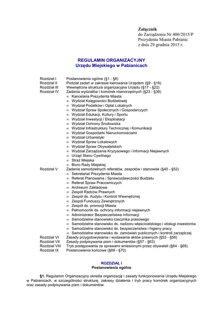 Załącznik do Zarządzenia Nr 400/2015/P Prezydenta Miasta Pabianic z dnia 29 grudnia 2015 r. REGULAMIN ORGANIZACYJNY Urzędu Miejskiego w Pabianicach Rozdział I Rozdział II Rozdział III Rozdział IV Rozdział V Rozdział VI Rozdział VII Rozdział VIII Rozdział IX Postanowienia ogólne (§1 - §8) Podział zadań w zakresie kierowania Urzędem (§9 - §16) Wewnętrzna struktura organizacyjna Urzędu (§17 - §22) Zadania wydziałów i komórek równorzędnych (§23 - §39) • Kancelaria Prezydenta Miasta • Wydział Księgowości Budżetowej • Wydział Podatków i Opłat Lokalnych • Wydział Spraw Społecznych i Gospodarczych • Wydział Edukacji, Kultury i Sportu • Wydział Inwestycji i Eksploatacji • Wydział Ochrony Środowiska • Wydział Infrastruktury Technicznej i Komunikacji • Wydział Gospodarki Nieruchomościami • Wydział Urbanistyki • Wydział Spraw Lokalowych • Wydział Spraw Obywatelskich • Wydział Zarządzania Kryzysowego i Informacji Niejawnych • Urząd Stanu Cywilnego • Straż Miejska • Biuro Rady Miejskiej Zadania samodzielnych referatów, zespołów i stanowisk (§40 - §52) • Sekretariat Prezydenta Miasta • Referat Planowania i Sprawozdawczości Budżetu • Referat Spraw Pracowniczych • Archiwum Zakładowe • Zespół Radców Prawnych • Zespół ds. Audytu i Kontroli Wewnętrznej • Zespół Funduszy Zewnętrznych • Zespół ds. promocji Miasta • Pełnomocnik ds. ochrony informacji niejawnych • Administrator Bezpieczeństwa Informacji • Samodzielne stanowisko rzecznika prasowego • Samodzielne stanowisko ds. nadzoru właścicielskiego i obsługi inwestorów • Samodzielne stanowisko ds. bezpieczeństwa i higieny pracy • Samodzielne stanowisko ds. zamówień publicznych i kontroli zarządczej Zasady przygotowywania i wydawania aktów prawnych (§53 - §56) Zasady podpisywania pism i dokumentów (§57 - §63) Tryb postępowania ze sprawami wniesionymi przez obywateli (§64 - §68) Postanowienia końcowe (§69 - §70) ROZDZIAŁ I Postanowienia ogólne §1. Regulamin Organizacyjny określa organizację i zasady funkcjonowania Urzędu Miejskiego w Pabianicach, w szczególności strukturę, zakresy działania i tryb pracy komórek organizacyjnych oraz zasady podpisywania pism i dokumentów. §2. Urząd Miejski w Pabianicach działa na podstawie obowiązujących przepisów prawa, w szczególności ustawy o samorządzie gminnym, Statutu Miasta Pabianic i niniejszego Regulaminu. §3. Ilekroć w dalszej części Regulaminu Organizacyjnego Urzędu Miejskiego w Pabianicach jest mowa o: 1) „Gminie” lub „Mieście” – należy przez to rozumieć Gminę Miejską Pabianice; 2) „Ustawie” – należy przez to rozumieć ustawę o samorządzie gminnym; 3) „Statucie” – należy przez to rozumieć Statut Miasta Pabianic; 4) „Urzędzie” – należy przez to rozumieć Urząd Miejski w Pabianicach; 5) „Regulaminie” – należy przez to rozumieć Regulamin Organizacyjny Urzędu Miejskiego w Pabianicach; 6) „Radzie” – należy przez to rozumieć Radę Miejską w Pabianicach; 7) „Prezydencie” lub „Zastępcy Prezydenta” – należy przez to rozumieć odpowiednio Prezydenta Miasta Pabianic lub Zastępców Prezydenta Miasta Pabianic; 8) „Sekretarzu” lub „Skarbniku” – należy przez to rozumieć odpowiednio Sekretarza Miasta Pabianic lub Skarbnika Miasta Pabianic; 9) „Kierownictwie Urzędu” – należy przez to rozumieć Prezydenta, Zastępców Prezydenta, Sekretarza i Skarbnika; 10) „Wydziałach” – należy przez to rozumieć wydziały i inne równorzędne komórki organizacyjne Urzędu; 11) „Naczelniku" – należy przez to rozumieć naczelnika wydziału Urzędu lub osobę kierującą pracą równorzędnej komórki organizacyjnej o innej nazwie. §4. Urząd jest samorządową jednostką organizacyjną, przy pomocy której Prezydent wykonuje zadania własne Miasta określone ustawami, Statutem, uchwałami Rady oraz zadania zlecone, przekazane Miastu na mocy obowiązujących przepisów prawa lub zawartych porozumień. §5. Nadrzędnym celem działania Urzędu jest służba społeczności lokalnej poprzez zaspokajanie jej potrzeb w zakresie zadań wykonywanych przez organy gminy. §6. Siedzibą Urzędu jest miasto Pabianice. §7. 1. Urząd jest zakładem pracy w rozumieniu przepisów prawa. 2. Tryb pracy w Urzędzie, godziny urzędowania, prawa i obowiązki pracodawcy i pracowników określa Regulamin Pracy Urzędu wprowadzony odrębnym zarządzeniem. §8. Zasady prowadzenia kontroli zarządczej w Urzędzie określa odrębne zarządzenie. ROZDZIAŁ II Podział zadań w zakresie kierowania Urzędem §9. 1. Prezydent działa w zakresie określonym ustawami, Statutem i uchwałami Rady. 2. Zastępcy Prezydenta działają w zakresie spraw powierzonych im przez Prezydenta i ponoszą przed nim odpowiedzialność. Wykonując wyznaczone zadania zapewniają kompleksowe rozwiązanie problemów wynikających z zadań Miasta i nadzorują działalność podległych im Wydziałów i miejskich jednostek organizacyjnych. 3. Sekretarz, w zakresie ustalonym przez Prezydenta, zapewnia sprawne funkcjonowanie Urzędu i warunki jego działania, a także właściwą organizację pracy w Urzędzie. 4. Skarbnik jest głównym księgowym budżetu Miasta. §10. W czasie nieobecności Prezydenta jego obowiązki pełni wyznaczony przez niego Zastępca, a w czasie nieobecności Prezydenta i Zastępców obowiązki sprawuje Sekretarz w zakresie ustalonym przez Prezydenta. 1) 2) 3) §11. Do zadań Zastępców Prezydenta należy w szczególności: nadzór nad pracą podległych Wydziałów i miejskich jednostek organizacyjnych; nadzór nad realizacją uchwał Rady i zarządzeń Prezydenta przez podległe Wydziały i miejskie jednostki organizacyjne; podejmowanie przedsięwzięć i inicjatyw mających na celu podwyższanie jakości pracy 2 4) 5) 6) 7) 8) 1) 2) 3) 4) 5) 6) 7) 8) podległych Wydziałów oraz pozyskiwanie śr