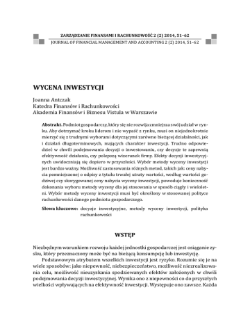 ZARZĄDZANIE FINANSAMI I RACHUNKOWOŚĆ 2 (2) 2014, 51–62 JOURNAL OF FINANCIAL MANAGEMENT AND ACCOUNTING 2 (2) 2014, 51–62 WYCENA INWESTYCJI Joanna Antczak Katedra Finansów i Rachunkowości Akademia Finansów i Biznesu Vistula w Warszawie Abstrakt. Podmiot gospodarczy, który się nie rozwija zmniejsza swój udział w rynku. Aby dotrzymać kroku liderom i nie wypaść z rynku, musi on niejednokrotnie mierzyć się z trudnymi wyborami dotyczącymi zarówno bieżącej działalności, jak i działań długoterminowych, mających charakter inwestycji. Trudno odpowiedzieć w chwili podejmowania decyzji o inwestowaniu, czy decyzje te zapewnią efektywność działania, czy polepszą wizerunek firmy. Efekty decyzji inwestycyjnych uwidoczniają się dopiero w przyszłości. Wybór metody wyceny inwestycji jest bardzo ważny. Możliwość zastosowania różnych metod, takich jak: ceny nabycia pomniejszonej o odpisy z tytułu trwałej utraty wartości, według wartości godziwej czy skorygowanej ceny nabycia wyceny inwestycji, powoduje konieczność dokonania wyboru metody wyceny dla jej stosowania w sposób ciągły i wieloletni. Wybór metody wyceny inwestycji musi być określony w stosowanej polityce rachunkowości danego podmiotu gospodarczego. Słowa kluczowe: decyzje inwestycyjne, metody wyceny inwestycji, polityka rachunkowości WSTĘP Niezbędnym warunkiem rozwoju każdej jednostki gospodarczej jest osiąganie zysku, który przeznaczony może być na bieżącą konsumpcję lub inwestycję. Podstawowym atrybutem wszelkich inwestycji jest ryzyko. Rozumie się je na wiele sposobów: jako niepewność, niebezpieczeństwo, możliwość niezrealizowania celu, możliwość nieuzyskania spodziewanych efektów założonych w chwili podejmowania decyzji inwestycyjnej. Wynika ono z niepewności co do przyszłych wielkości wpływających na efektywność inwestycji. Występuje ono zawsze. Każda 52 J. Antczak decyzja w przedsiębiorstwie powinna być poprzedzona analizą ryzyka, ponieważ ryzykiem obarczone są wszystkie rodzaje działalności gospodarczej [Dyduch 2013, s. 279]. Razem z podjęciem decyzji o inwestowaniu, ważne jest też ustalenie wariantu wyceny inwestycji. Ustawa o rachunkowości dopuszcza możliwość wyboru różnych metod wyceny inwestycji. Decyzja należy do osób zarządzających jednostką. Wybór metody wyceny nie może być sprzeczny z nadrzędnymi zasadami rachunkowości, które należy stosować konsekwentnie, co oznacza, że nie można ich zmieniać w trakcie roku obrotowego. Zasady wyceny inwestycji stosowanej w danej jednostce gospodarczej muszą być opisane w polityce rachunkowości, stanowiącej zapis podstawowych zasad w zakresie rachunkowości. W artykule została dokonana teoretyczna analiza metod wyceny inwestycji w świetle rozwiązań prawa bilansowego. Celem badawczym było również określenie skutków wyceny inwestycji w sprawozdaniu finansowym. Rozwiązania zostały oparte na krajowej literaturze przedmiotu, badaniach, a przede wszystkim na obowiązującym prawie bilansowym. Artykuł stanowi podstawę do przeprowadzenia dalszych badań w zakresie wyceny inwestycji, w szczególności określenia wpływu wyboru metody wyceny inwestycji na sytuację finansową podmiotu gospodarczego. Zastosowaną metodologię badawczą można ogólnie ująć jako studium literatury, które ma na celu ustalenie stanu wiedzy określonej dziedziny naukowej, stanowiąc podstawę do dalszych badań. INWESTYCJE DEFINICJE, KLASYFIKACJA Współczesny menedżer jest rozliczany nie tylko z wyników zrealizowanych w trakcie okresu sprawozdawczego (stopy zwrotu z zaangażowanego kapitału), ale także z kosztów utraconych korzyści, powstających na skutek przeoczenia okazji do pomnożenia wolnych zasobów. Okazje biznesowe mieszczą się często poza statutowym obszarem działalności firmy – są to na przykład: inwestycje w grunty, budynki, dzieła sztuki, papiery wartościowe. To właśnie efektywne wykorzystywanie szans rynkowych i poszukiwanie dodatkowych zysków poza sferą działalności operacyjnej jest odzwierciedlane w ramach nowej kategorii bilansowej – inwestycji [Walińska 2007, s. 301]. Pojęcie inwestycji we współczesnej literaturze rozumiane jest jako nakład kapitałowy poniesiony dziś kosztem rezygnacji z bieżącej konsumpcji na rzecz korzyści, które inwestor może otrzymać w przyszłości. Co więcej, niektórzy autorzy uważają, że inwestycja jest pewnego rodzaju grą losową. Tylko takie jej pojmowanie pozwala należycie ująć wszystkie aspekty procesu podejmowania decyzji inwestycyjnych. W takim ujęciu każde przedsięwzięcie realizowane ZARZĄDZANIE FINANSAMI I RACHUNKOWOŚĆ 2 (2) 2014 53 Wycena inwestycji w przedsiębiorstwie można rozumieć jako inwestycję. W węższym znaczeniu za inwestycje uznaje się przedsięwzięcia angażujące środki finansowe, które będą związane przez okres dłuższy niż jeden cykl produkcyjny lub usługowy, albo ustaloną umownie lub urzędowo jednostkę czasu [Dyduch 2013, s. 270]. Inwestycja może być rozumiana jako wyrzeczenie się bieżącej konsumpcji dla przyszłych niepewnych korzyści [K. Jajuga, K. Kuźniak i P. Markowski 1998, s. 11]. Inwestycja to również zaangażowanie określonej kwoty pieniędzy na pewien okres, aby w przyszłości otrzymać jej zwrot kompensujący inwestorowi czas, w którym pieniądze były zaangażowane, przewidywany współczynnik inflacji oraz ryzyko inwestycji [F.K. Reilly i K.C. Brown 2001, s. 29]. Zgodnie z art. 3 ust. pkt 17 Ustawy o rachunkowości (dalej UoR) przez inwestycje rozumie się aktywa posiadane przez jednostkę w celu osiągnięcia z nich korzyści ekonomicznych wynikających z przyrostu wartości tych aktywów, uzyskania przychodów w formie odsetek, dywidend (udziałów w zyskach) lub innych pożytków, w tym również z transakcji handlowej, a w szczególności aktywa finansowe oraz te nieruchomości i wartości niematerialne i prawne, które ni