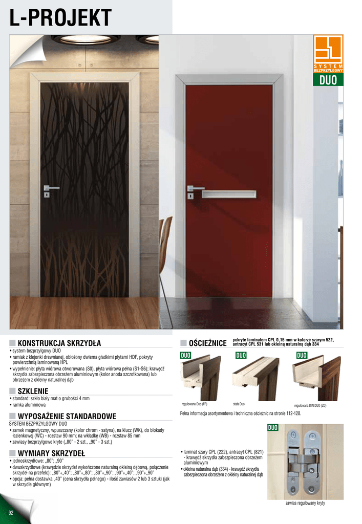 L-PROJEKT DUO n KONSTRUKCJA SKRZYDŁA ∙∙system bezprzylgowy DUO ∙∙ramiak z klejonki drewnianej, obłożony dwiema gładkimi płytami HDF, pokryty powierzchnią laminowaną HPL ∙∙wypełnienie: płyta wiórowa otworowana (S0), płyta wiórowa pełna (S1-S6); krawędź skrzydła zabezpieczona obrzeżem aluminiowym (kolor anoda szczotkowana) lub obrzeżem z okleiny naturalnej dąb n OŚCIEŻNICE DUO pokryte laminatem CPL 0,15 mm w kolorze szarym 522, antracyt CPL 531 lub okleiną naturalną dąb 334 DUO DUO n SZKLENIE ∙∙standard: szkło biały mat o grubości 4 mm ∙∙ramka aluminiowa n WYPOSAŻENIE STANDARDOWE regulowana Duo (FP) stała Duo SYSTEM BEZPRZYLGOWY DUO ∙∙zamek magnetyczny, wpuszczany (kolor chrom - satyna), na klucz (WK), do blokady łazienkowej (WC) - rozstaw 90 mm; na wkładkę (WB) - rozstaw 85 mm ∙∙zawiasy bezprzylgowe kryte („80” - 2 szt., „90” - 3 szt.) n WYMIARY SKRZYDEŁ ∙∙jednoskrzydłowe: „80”; „90” ∙∙dwuskrzydłowe (krawędzie skrzydeł wykończone naturalną okleiną dębową, połączenie skrzydeł na przefelc): „80”+„40”; „80”+„80”; „80”+„90”; „90”+„40”; „90”+„90” ∙∙opcja: pełna dostawka „40” (cena skrzydła pełnego) - ilość zawiasów 2 lub 3 sztuki (jak w skrzydle głównym) regulowana DIN DUO (ZD) Pełna informacja asortymentowa i techniczna ościeżnic na stronie 112-128. DUO ∙∙laminat szary CPL (222), antracyt CPL (821) - krawędź skrzydła zabezpieczona obrzeżem aluminiowym ∙∙okleina naturalna dąb (334) - krawędź skrzydła zabezpieczona obrzeżem z okleiny naturalnej dąb zawias regulowany kryty 92